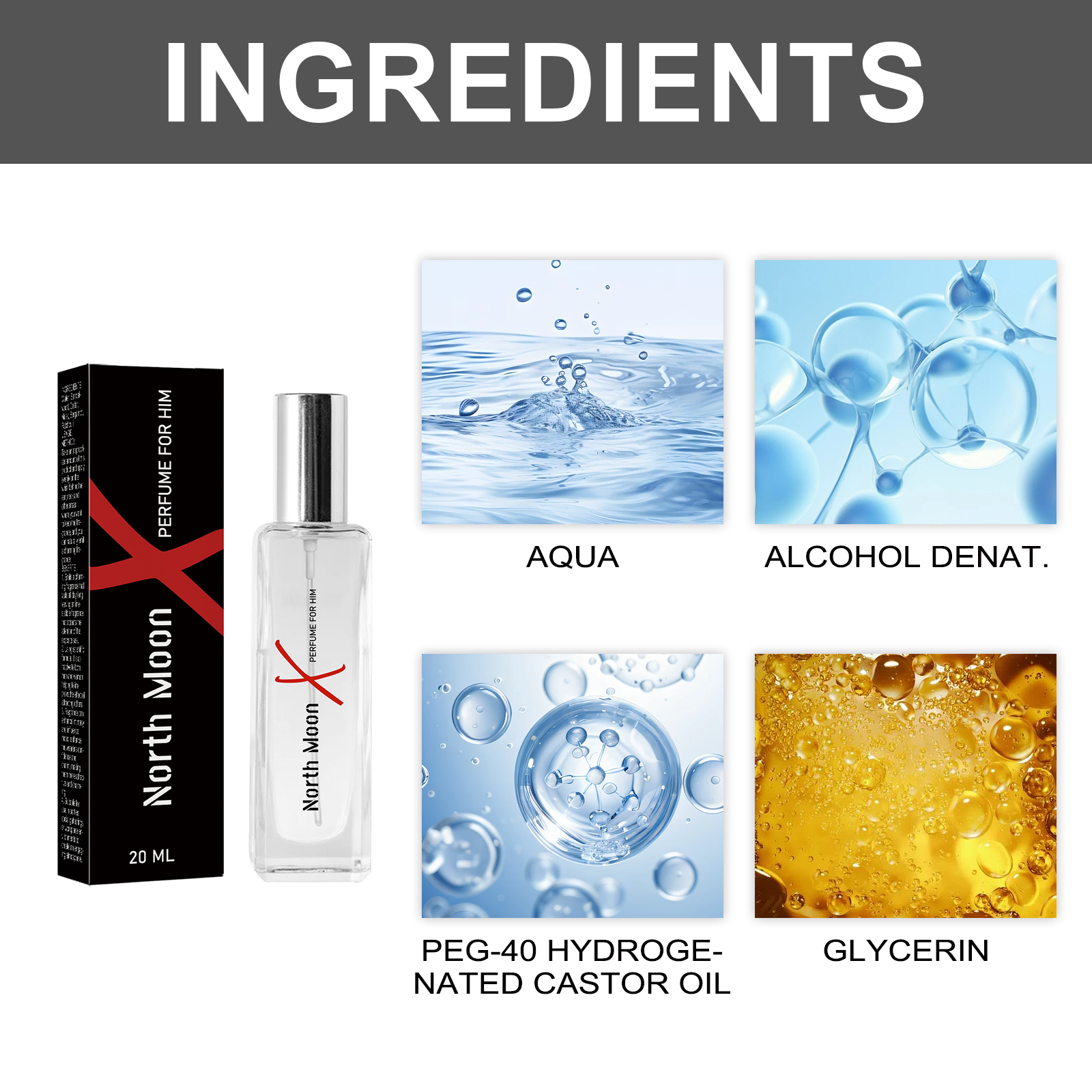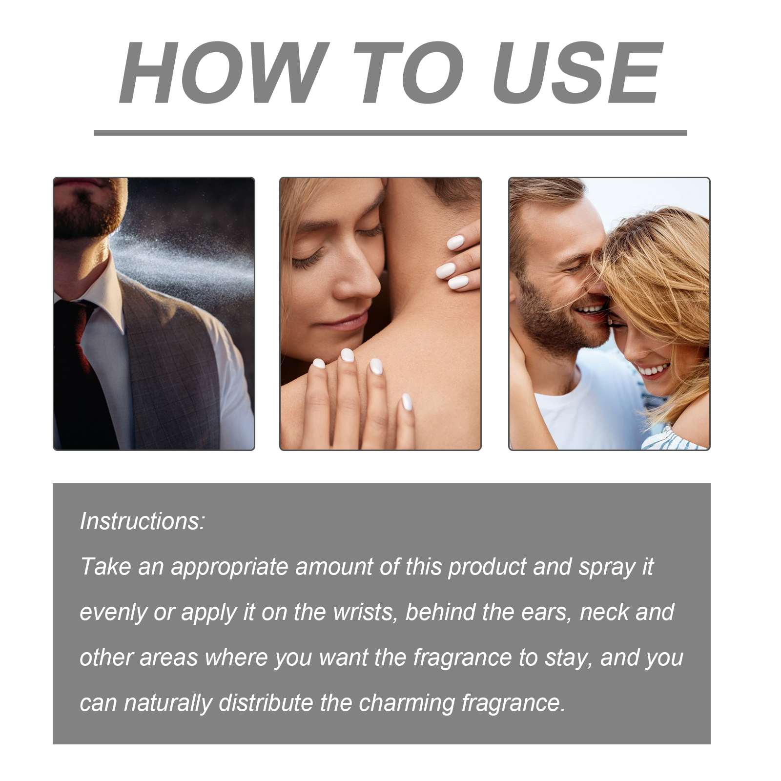 Our sexy Charm perfume contains PEG-40 hydrogenated castor oil, glycerin. It can it can blend perfectly, bring different senses. Its use is very simple: to apply perfume, shake the bottle, keep it 15-20 cm away from the body, and spray the perfume on the wrists, neck, behind the ears, and inside the elbow. To help the scent spread. Avoid overspraying and apply directly to clothing. And suitable for a variety of occasions, whether it is daily life business or dating, can be perfectly used.