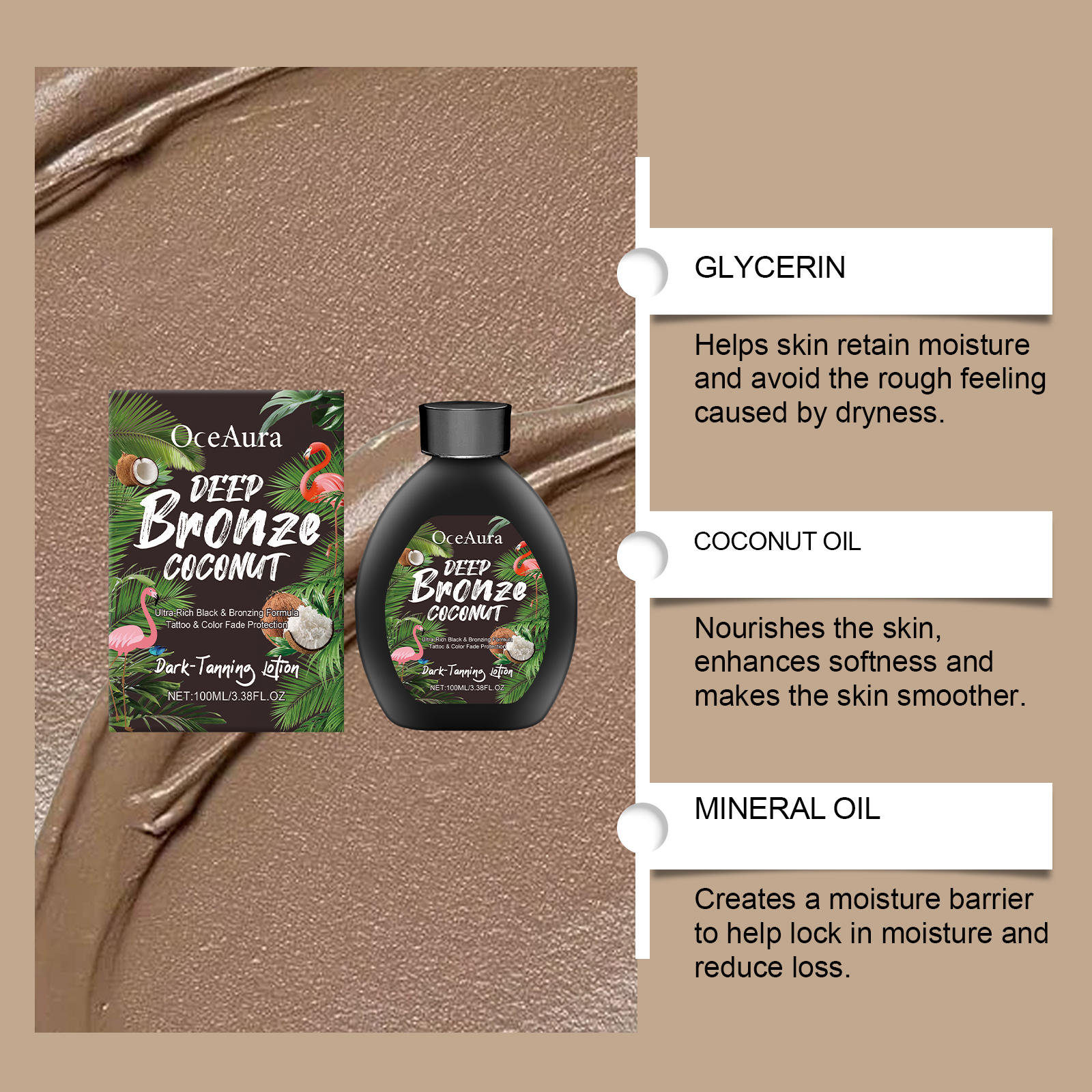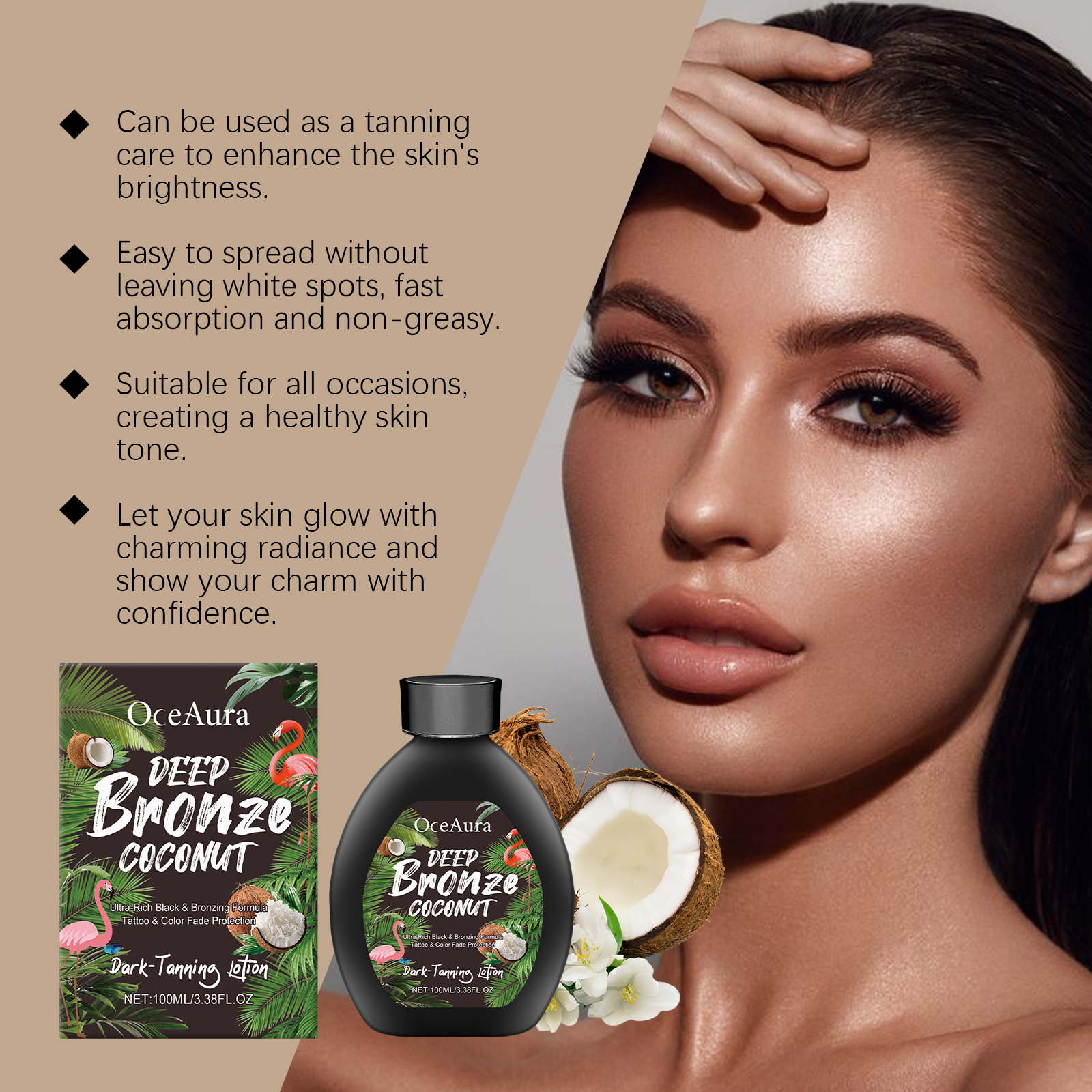 Our coconut Black lotion is carefully blended with carbomer, triethanolamine and coconut oil. Designed to moisturize and lock in moisture, leaving skin smooth and shiny. Easy to use: Apply the product evenly to clean skin before using a tanning bed or sunbathing. Avoid applying to broken or inflamed skin. Wash hands thoroughly after use. And fast adhesion, reduce sticky feeling.
