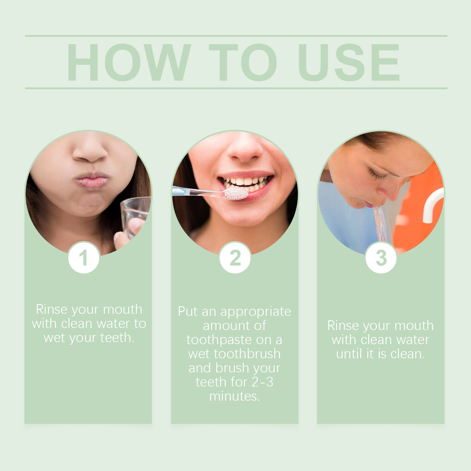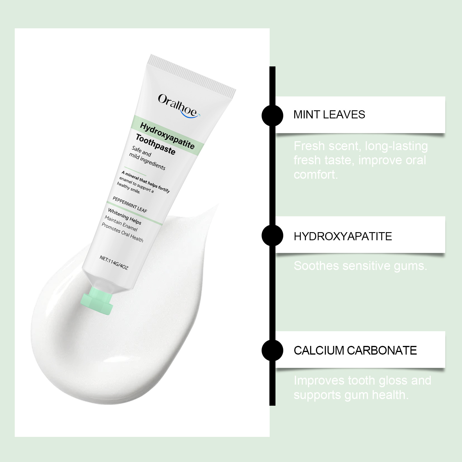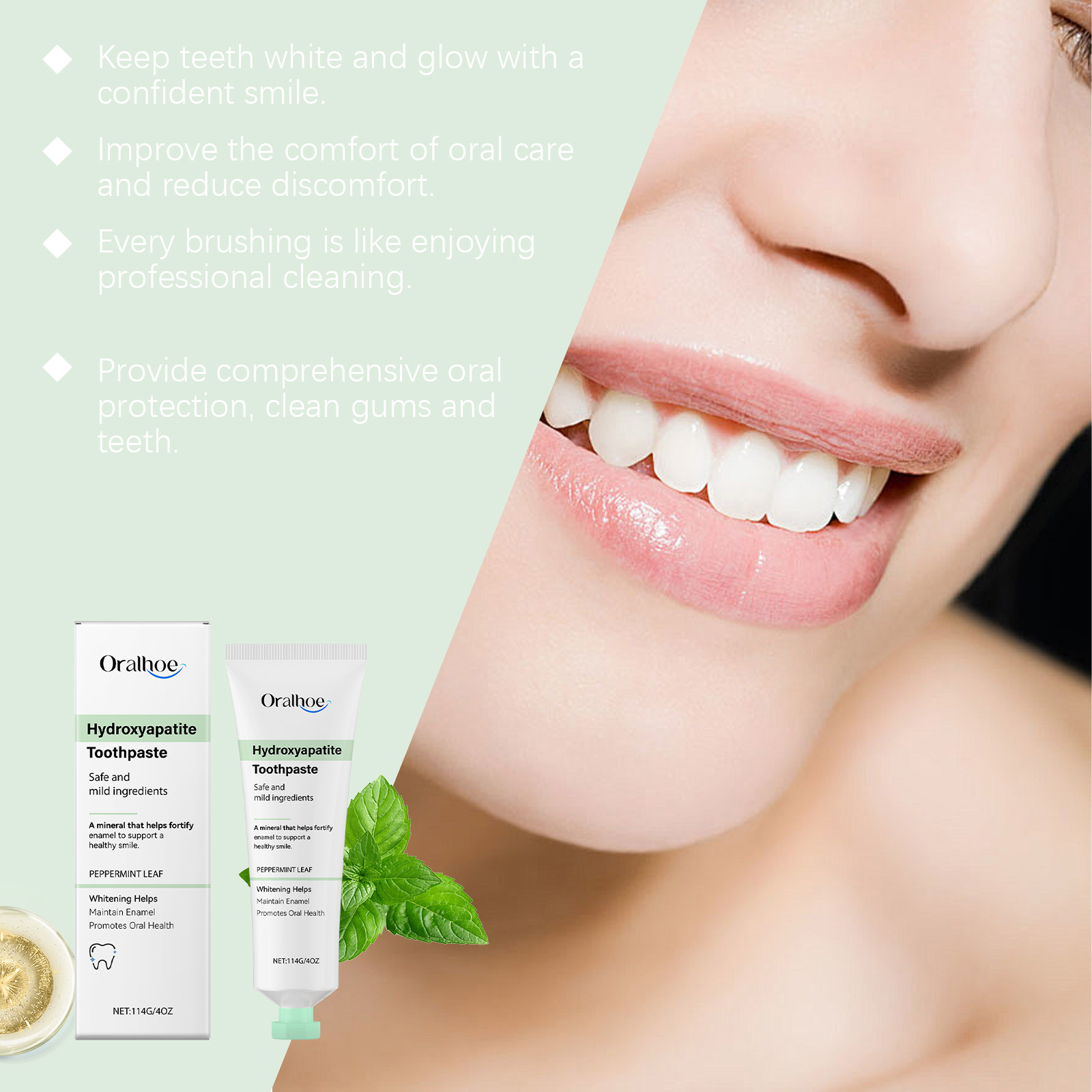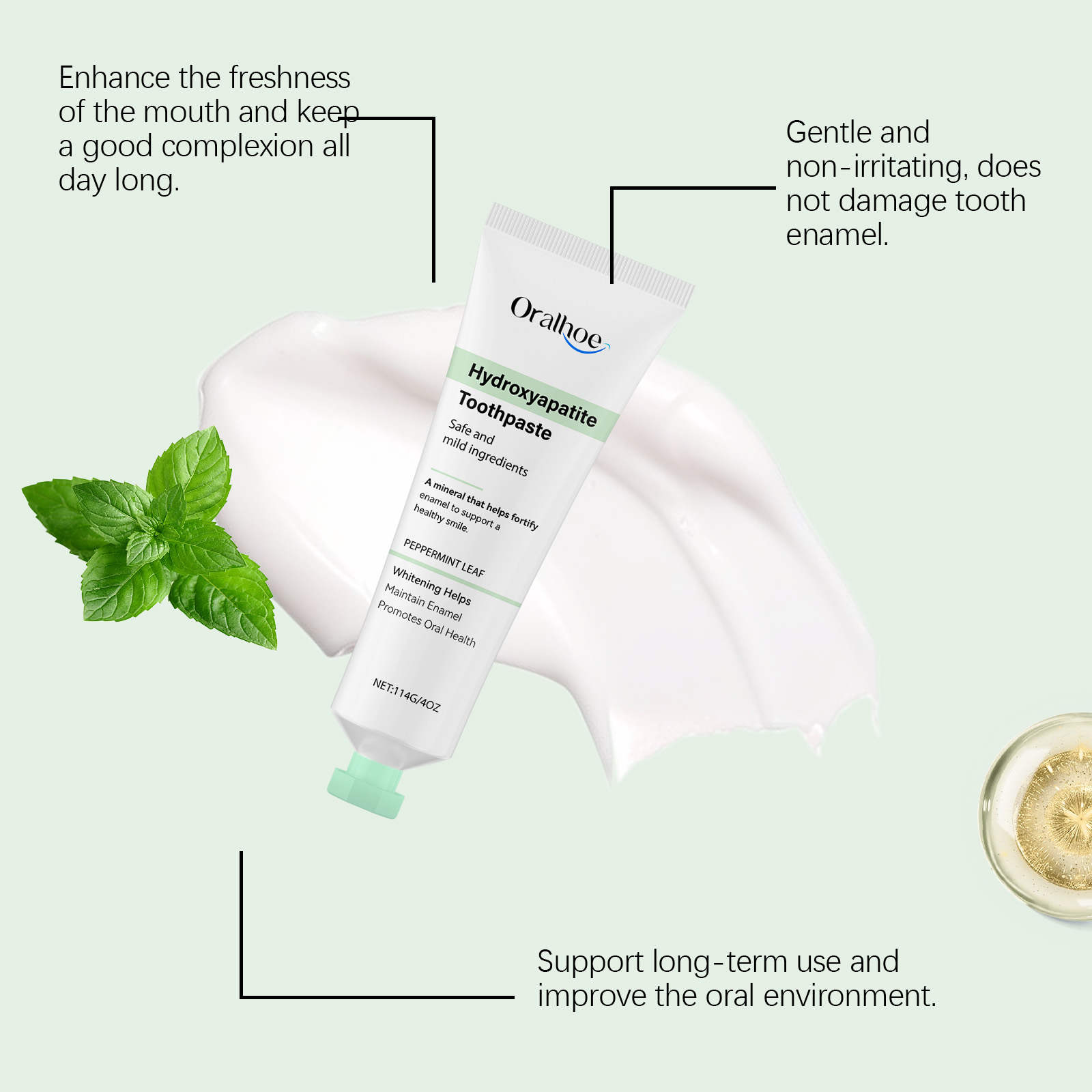 Our mint glossy toothpaste contains calcium carbonate and sorbitol. It cleans the surface of your teeth, reduces deposits, and keeps your mouth fresh. Prevent plaque buildup and keep teeth bright and clean. Its use is simple: rinse your mouth with water to moisten your teeth. Apply an appropriate amount of toothpaste to a wet toothbrush and brush for 2-3 minutes. Rinse your mouth with water until clean. And it can reduce oral problems, keep your mouth fresh, and improve your overall oral health.