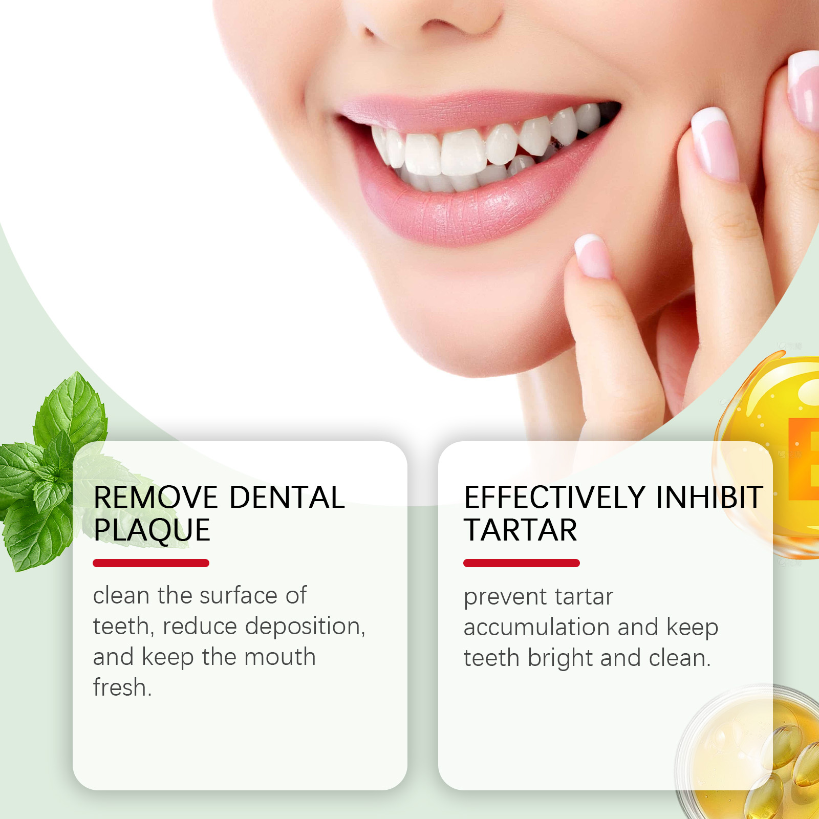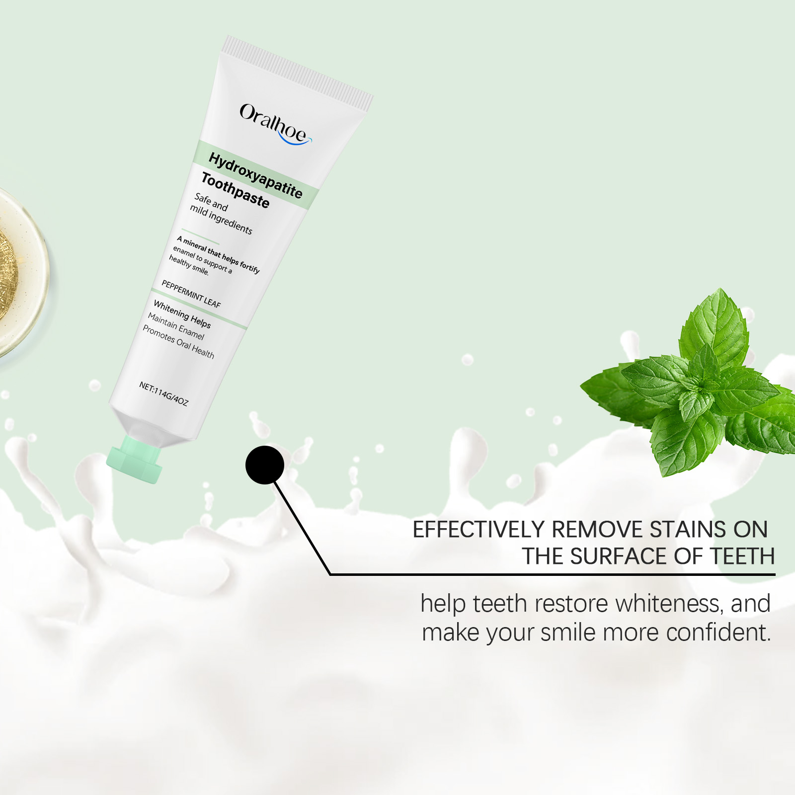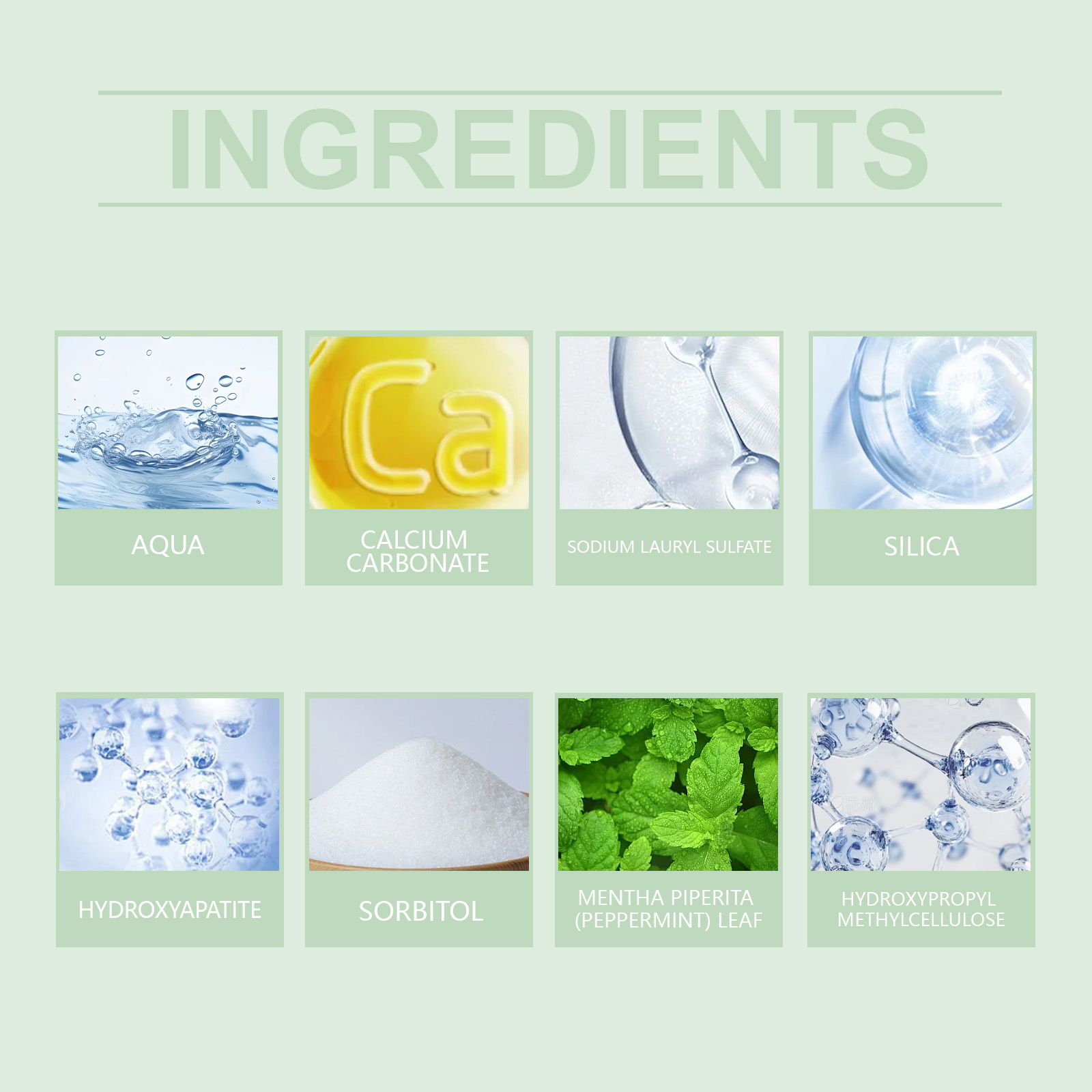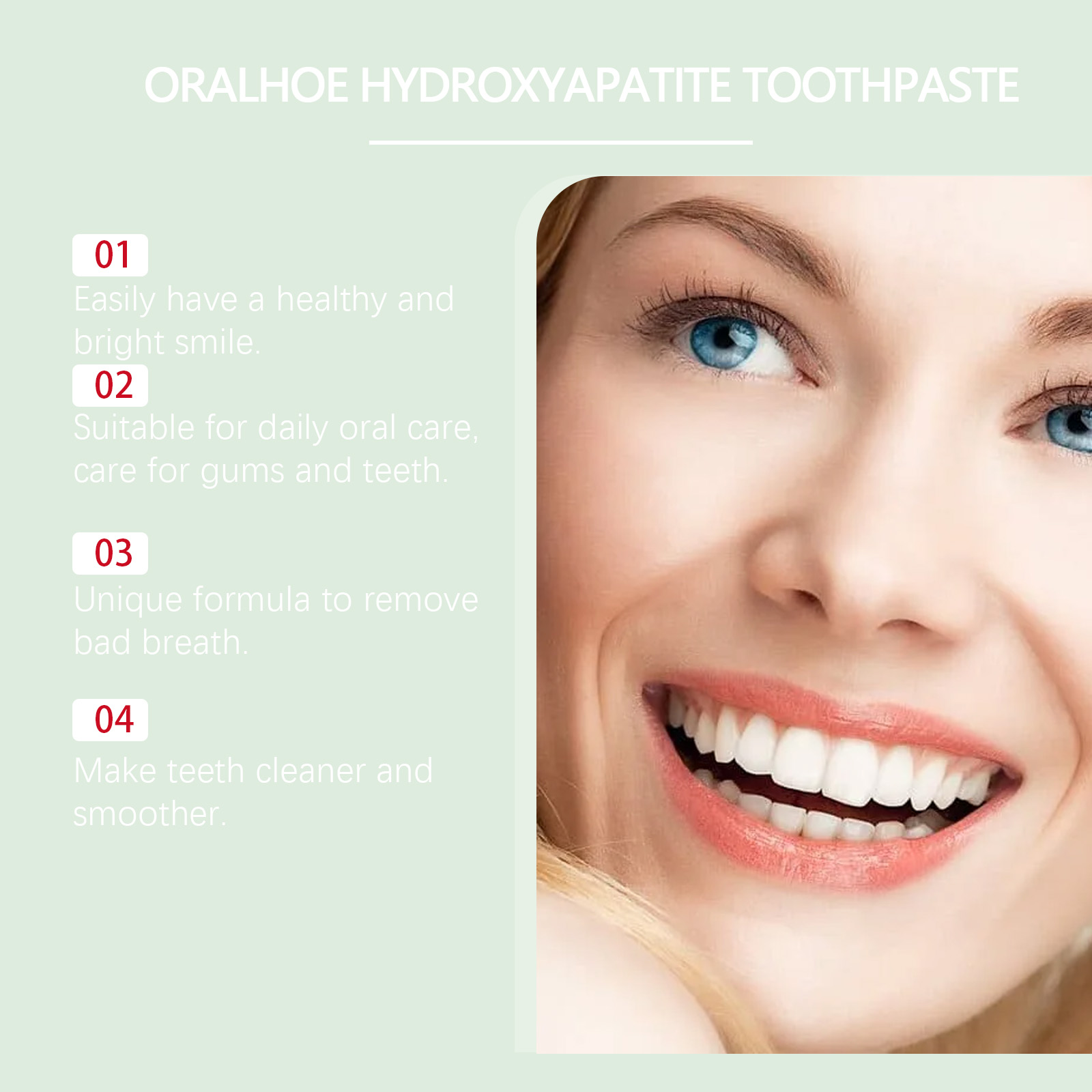 Our mint glossy toothpaste contains calcium carbonate and sorbitol. It cleans the surface of your teeth, reduces deposits, and keeps your mouth fresh. Prevent plaque buildup and keep teeth bright and clean. Its use is simple: rinse your mouth with water to moisten your teeth. Apply an appropriate amount of toothpaste to a wet toothbrush and brush for 2-3 minutes. Rinse your mouth with water until clean. And it can reduce oral problems, keep your mouth fresh, and improve your overall oral health.