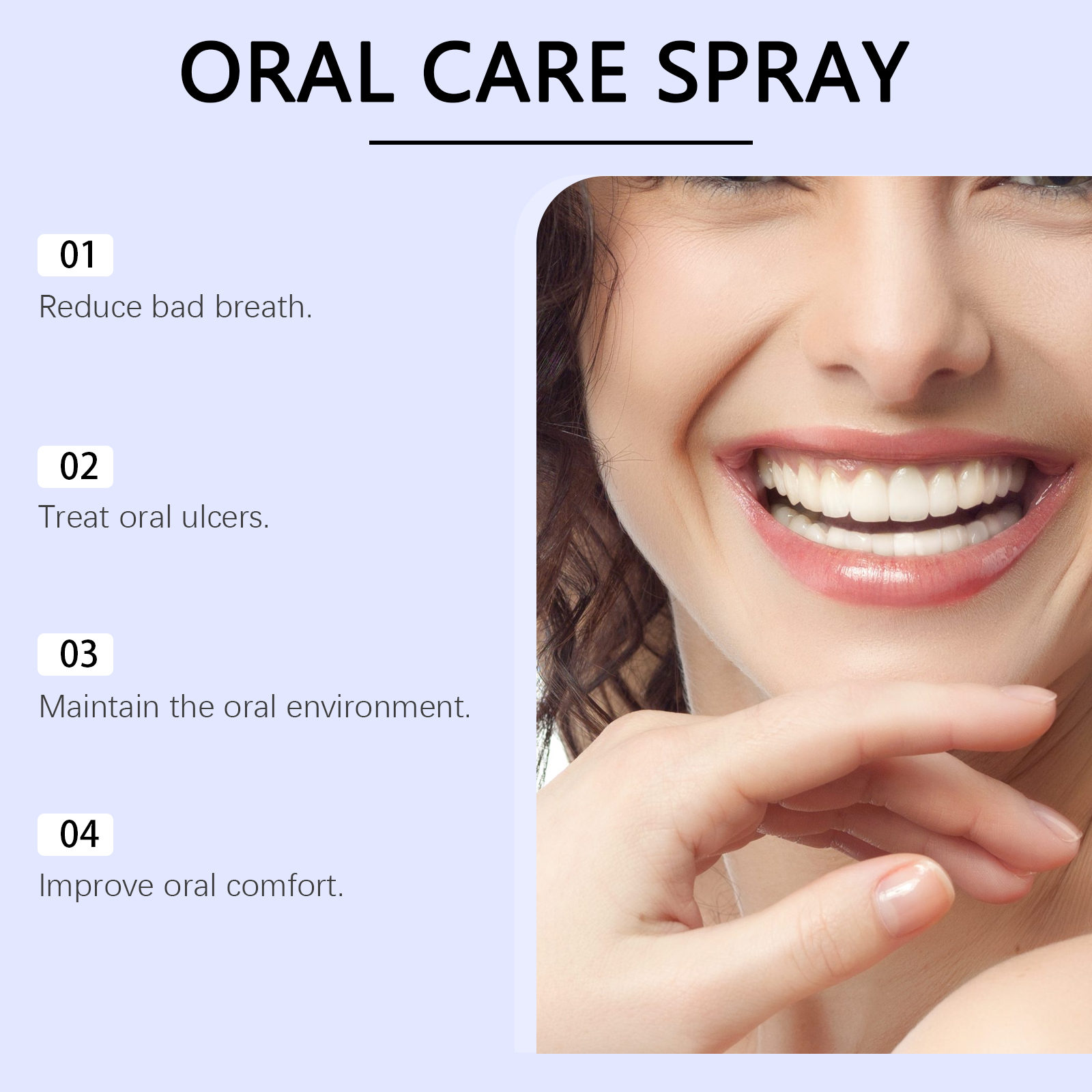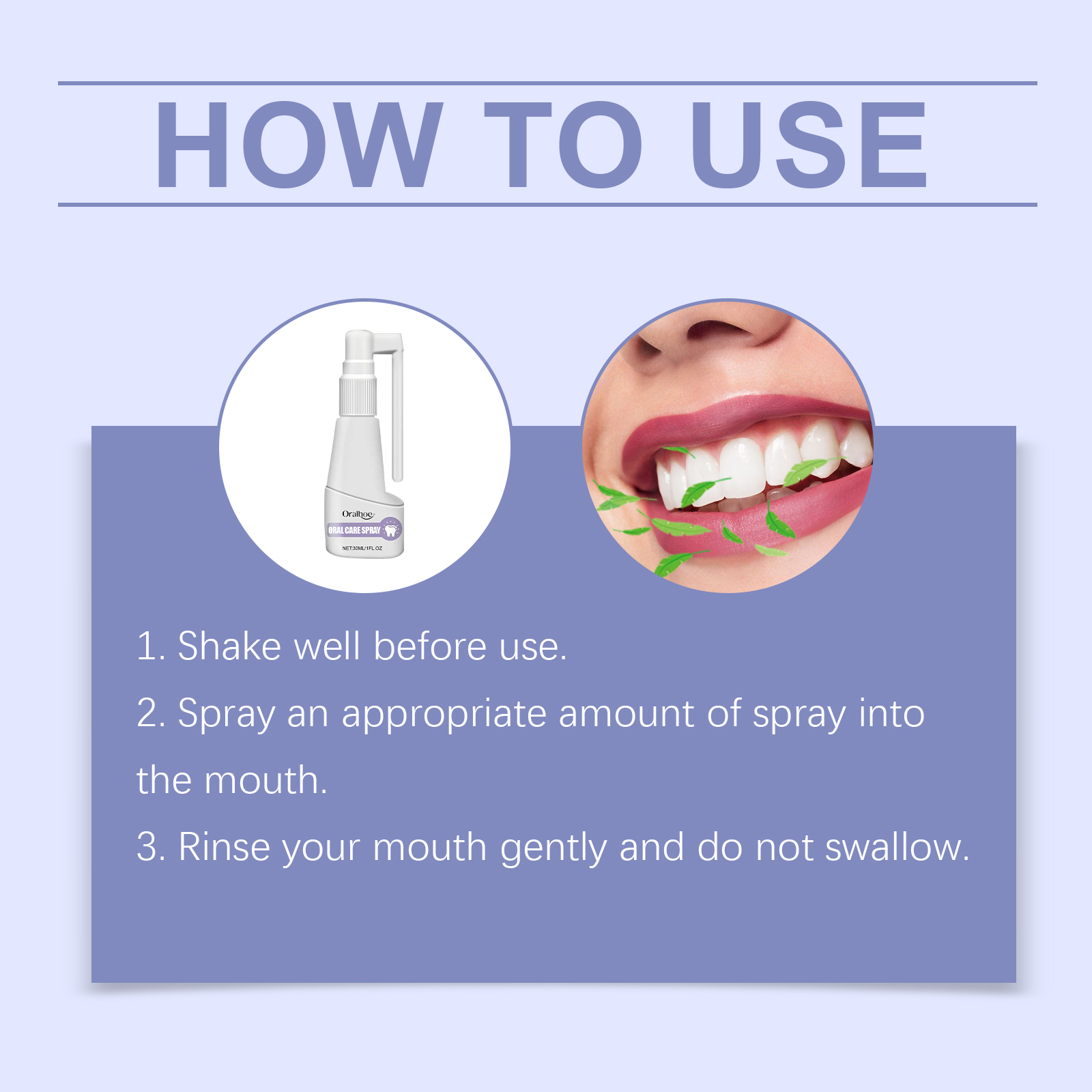 Our oral care spray is carefully blended with menthol and Centella asiatica extract. Designed to effectively eliminate bad breath. Easy to use: 1. Shake well before use. 2. Spray appropriate amount of spray into the inlet. 3. Gargle gently, don"t swallow. And it can relieve the discomfort of canker sores.