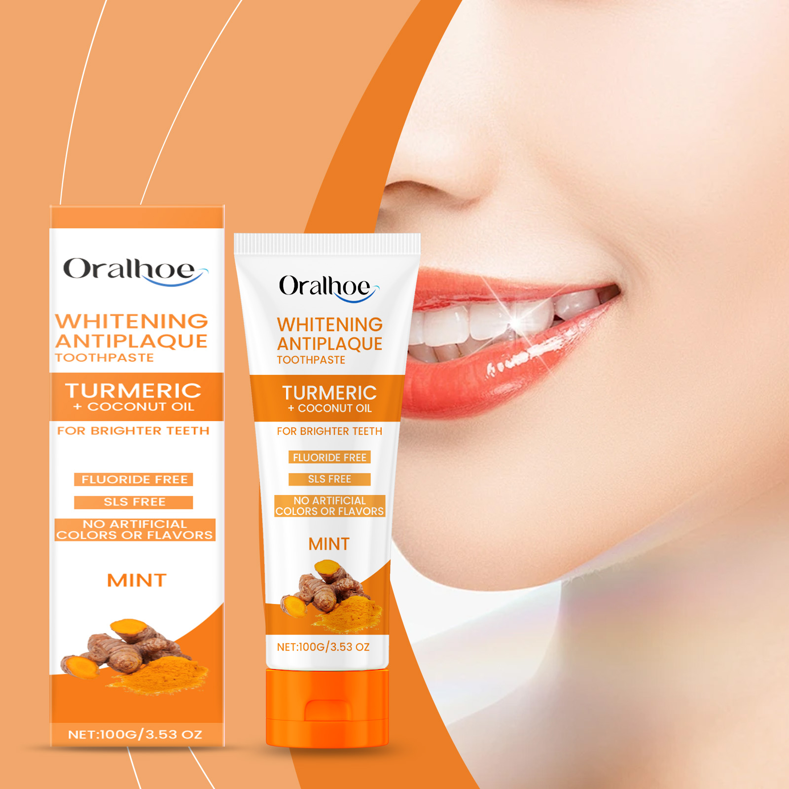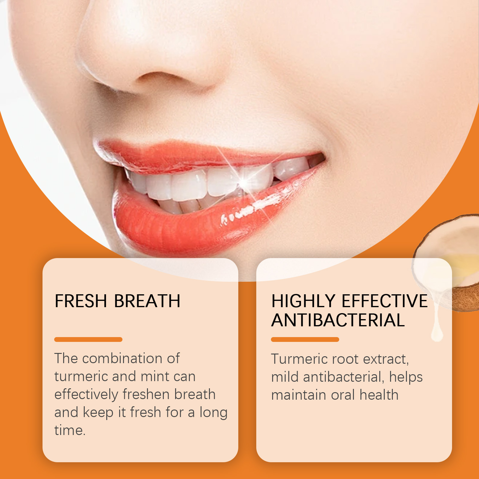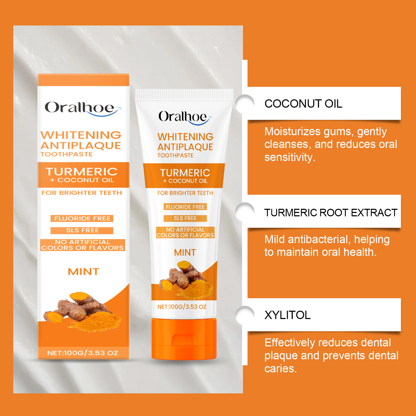 Our turmeric toothpaste contains coconut oil, turmeric root extract, xylitol. It can effectively freshen your breath and keep it fresh for a long time. Turmeric root extract is mildly antibacterial and helps to maintain oral health. The way to use it is simple: wet the toothbrush, and then squeeze the appropriate amount of toothpaste on the toothbrush. Gently brush the surface of your teeth with a toothbrush for 2-3 minutes, then rinse your mouth with water. Use coconut oil to gently moisturize your gums and reduce gum sensitivity.