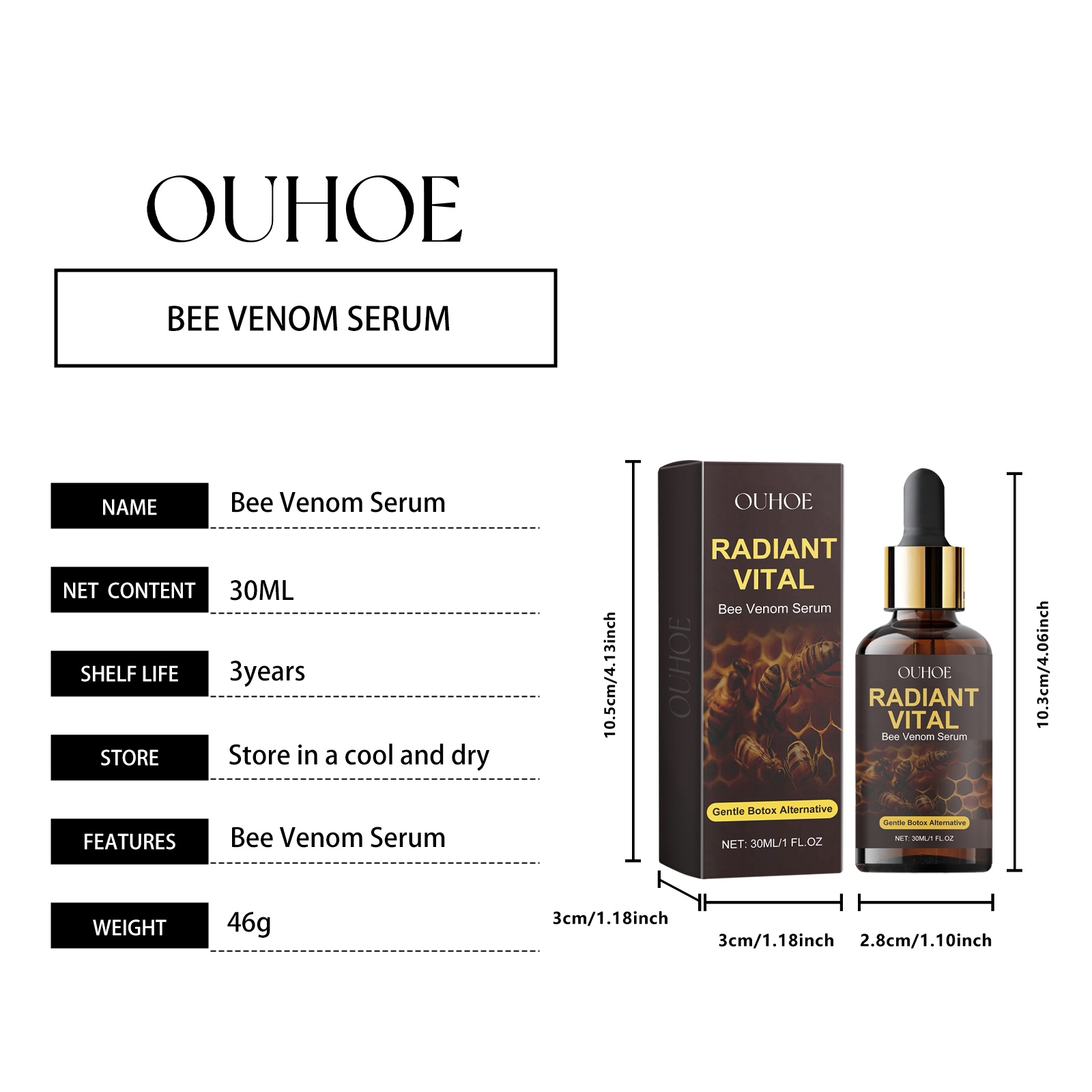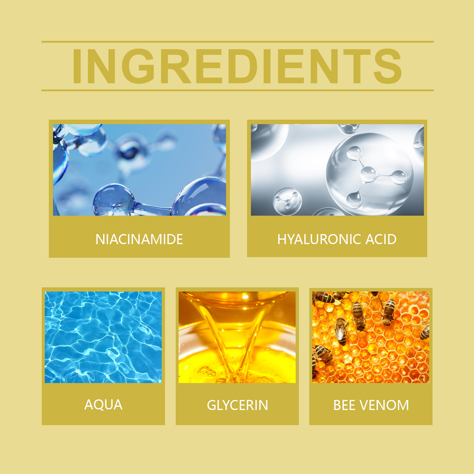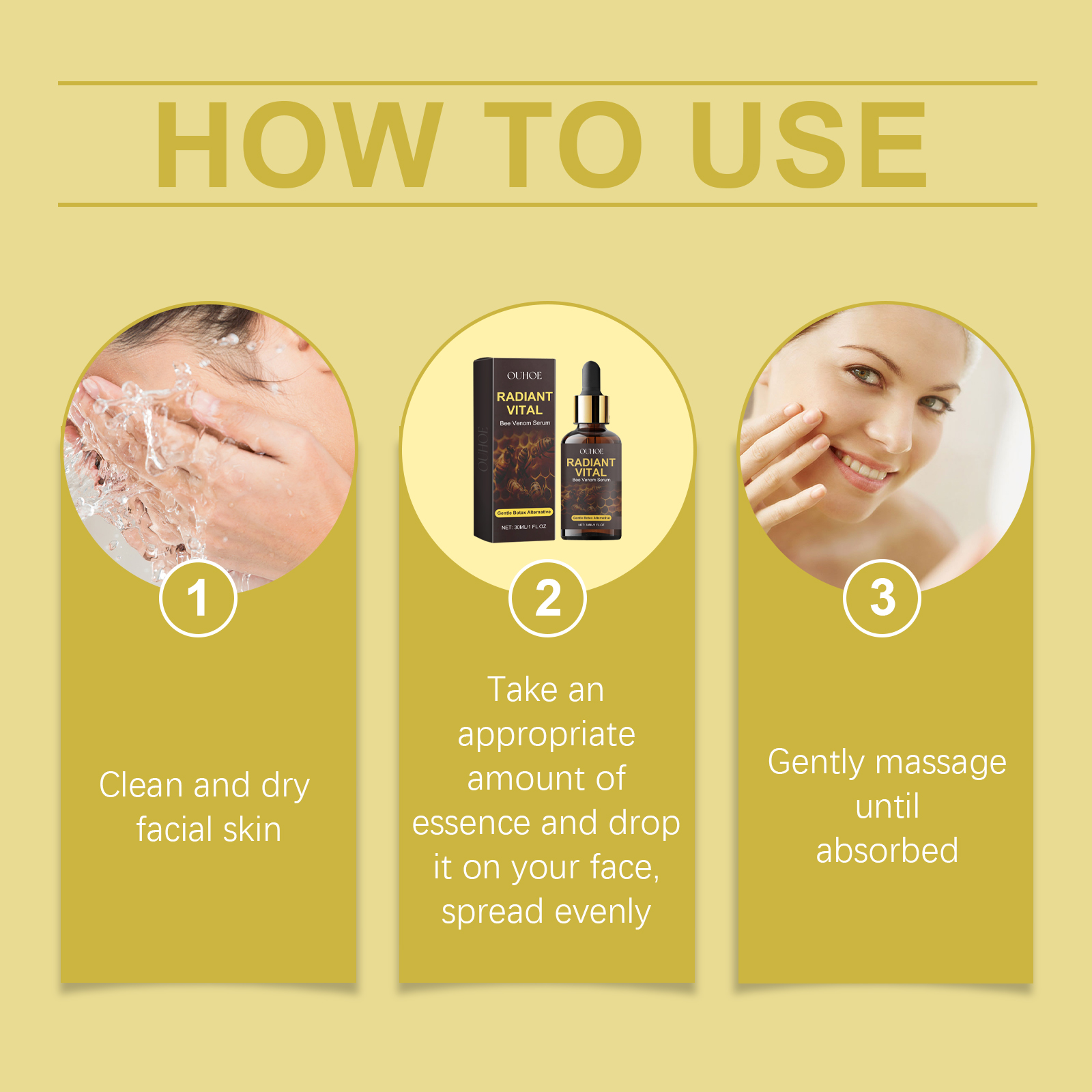 Our bee venom facial serum contains glycerin, bee venom and nicotinamide. It can improve blood circulation, stimulate collagen production, improve skin firmness. Inhibit melanin, lighten skin evenly and improve dullness; Moisturize, fill fine lines, plump skin, and glow with youth. Its application method is simple: 1. Clean and dry facial skin; 2. Take proper amount of serum and drop on face; 3. Gently massage until evenly absorbed. Bee Venom Facial Essence contains bee venom essence to reshape the facial contour and tighten the skin. Effectively inhibit melanin, even skin tone, glow.
