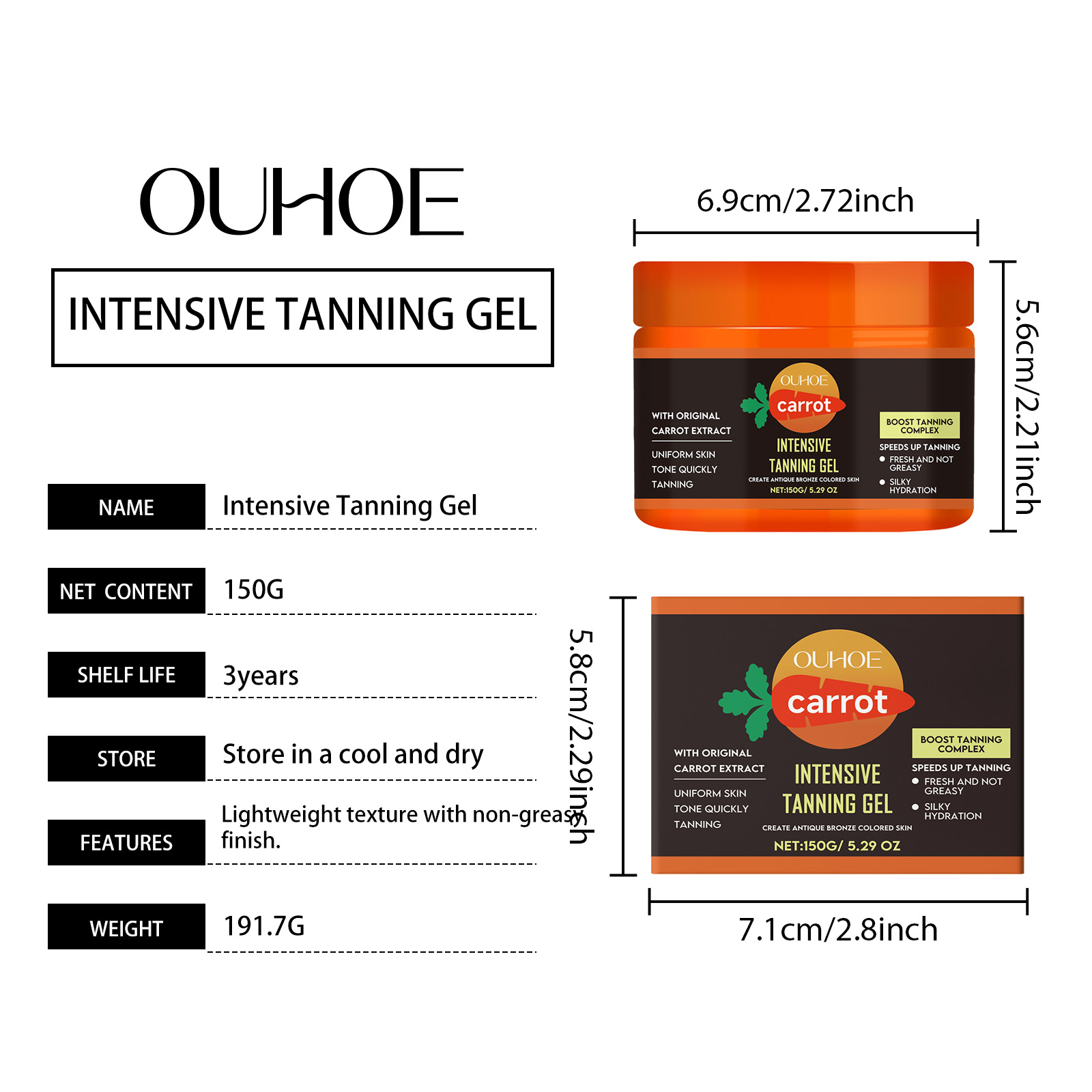 Our carrot Sun gel is carefully blended with carbomer, triethanolamine and carrot seed oil. Designed for darkening, moisturizing and balancing skin moisture. The method of use is very convenient: 1, clean the skin before applying. 2, evenly apply and massage until absorbed. 3, use daily, gradually color. And can achieve a natural bronze luster.