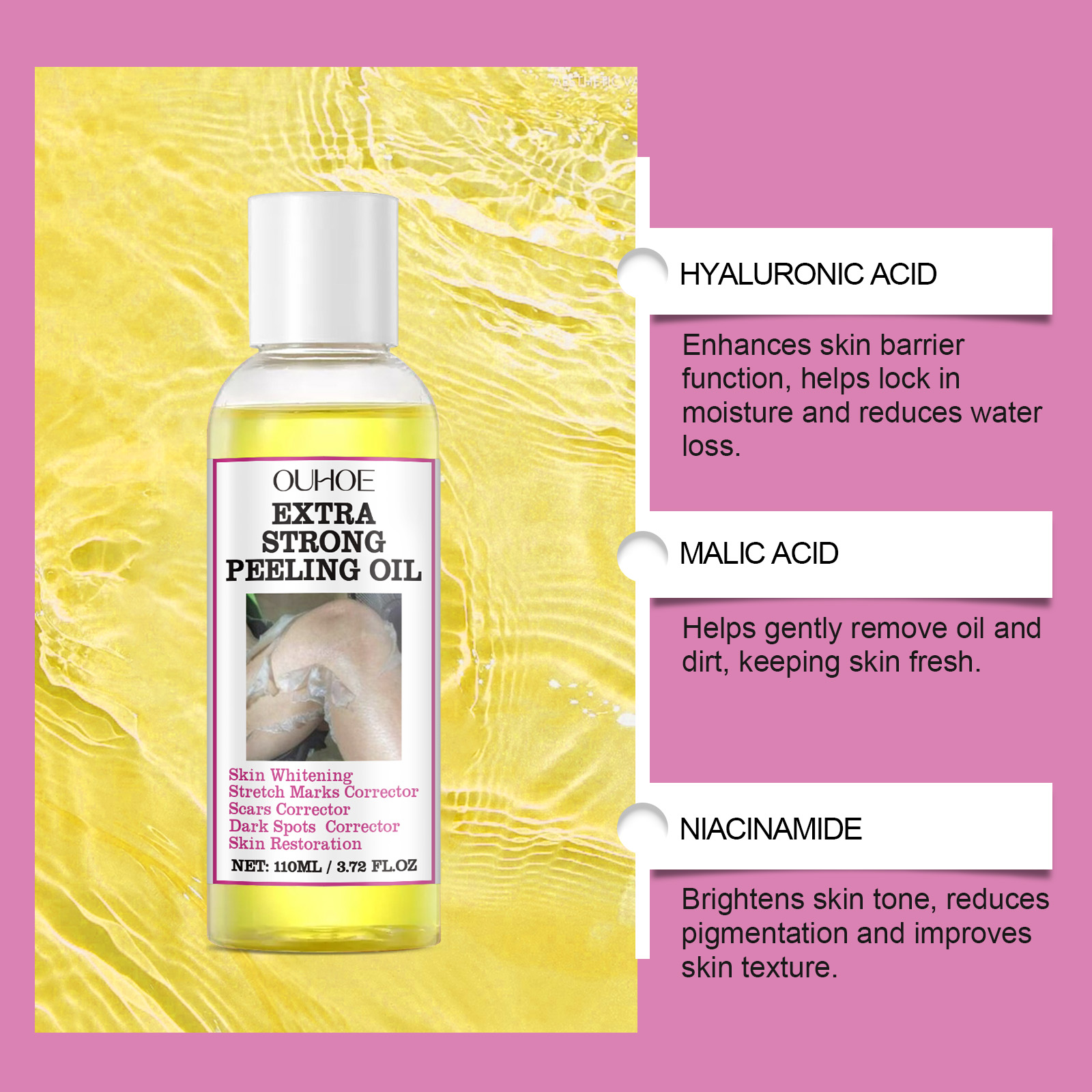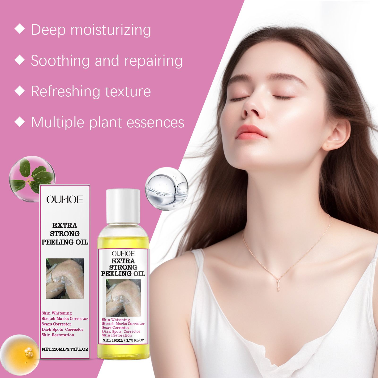 Our exfoliating oil contains collagen and sodium hyaluronate. It whitens and smooths the skin, removes dead skin and helps rejuvenate your skin. Its use method is very simple: apply the strong peeling oil evenly on the skin, wait for 15 minutes, and then wash with water, 3 times a day, it is recommended to use in the morning, noon, evening, need to use for 3 consecutive days. And can lighten the skin, remove dark spots.