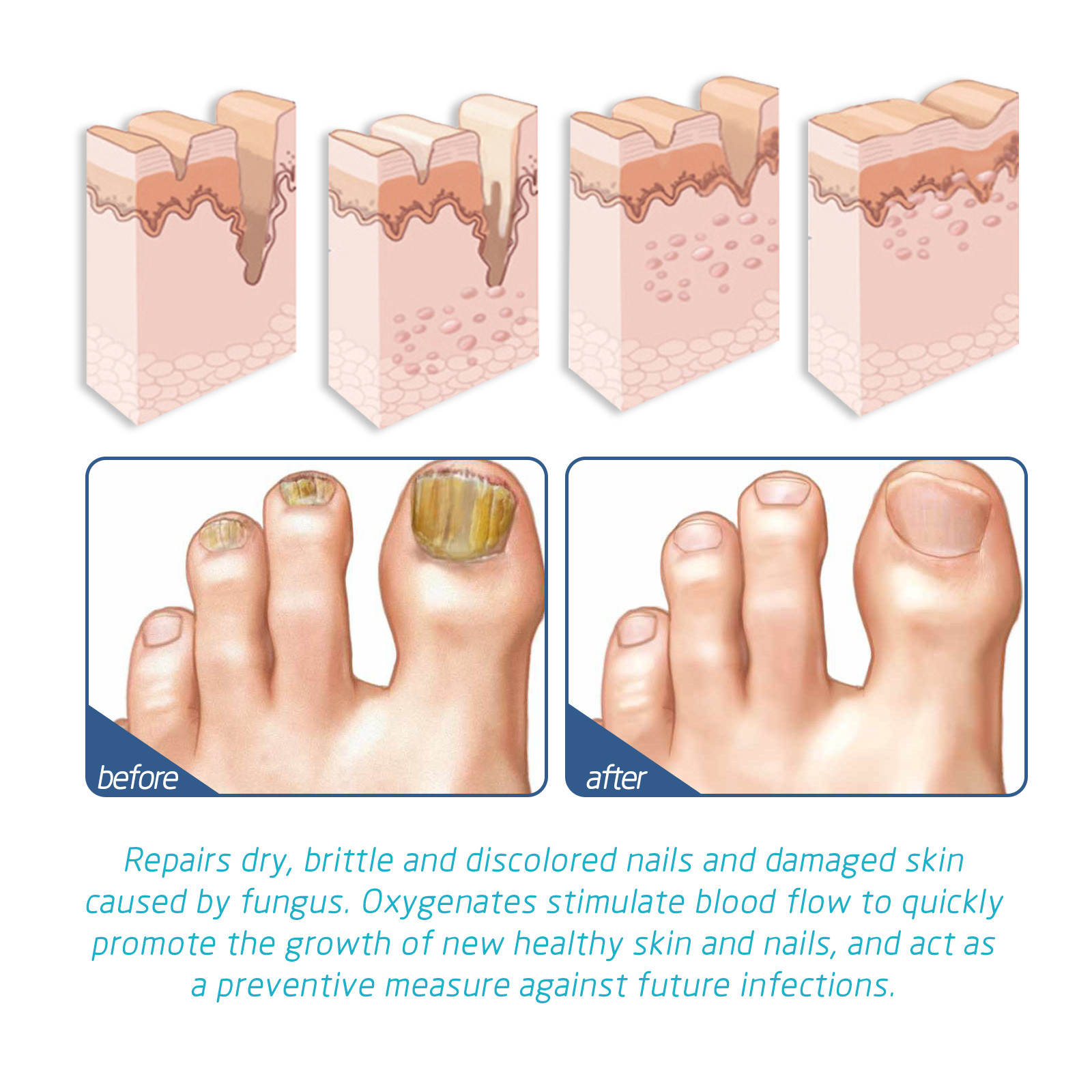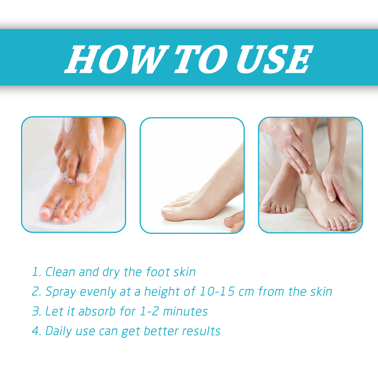 Our foot spray contains salvia miltiorrhiza extract, chestnut extract and white cedar extract. It can be used to repair dry, brittle, discoloration and skin damage caused by fungi, deep skin firming. Rejuvenate dry skin. Its use method is very simple: first clean and dry the skin of the foot, spray evenly at a height of 10-15 cm from the skin, then let it absorb for 1-2 minutes, daily use can get better results, stimulate blood flow through the oxygenate, quickly promote the growth of new healthy skin and nails, and as a measure to prevent future infections.