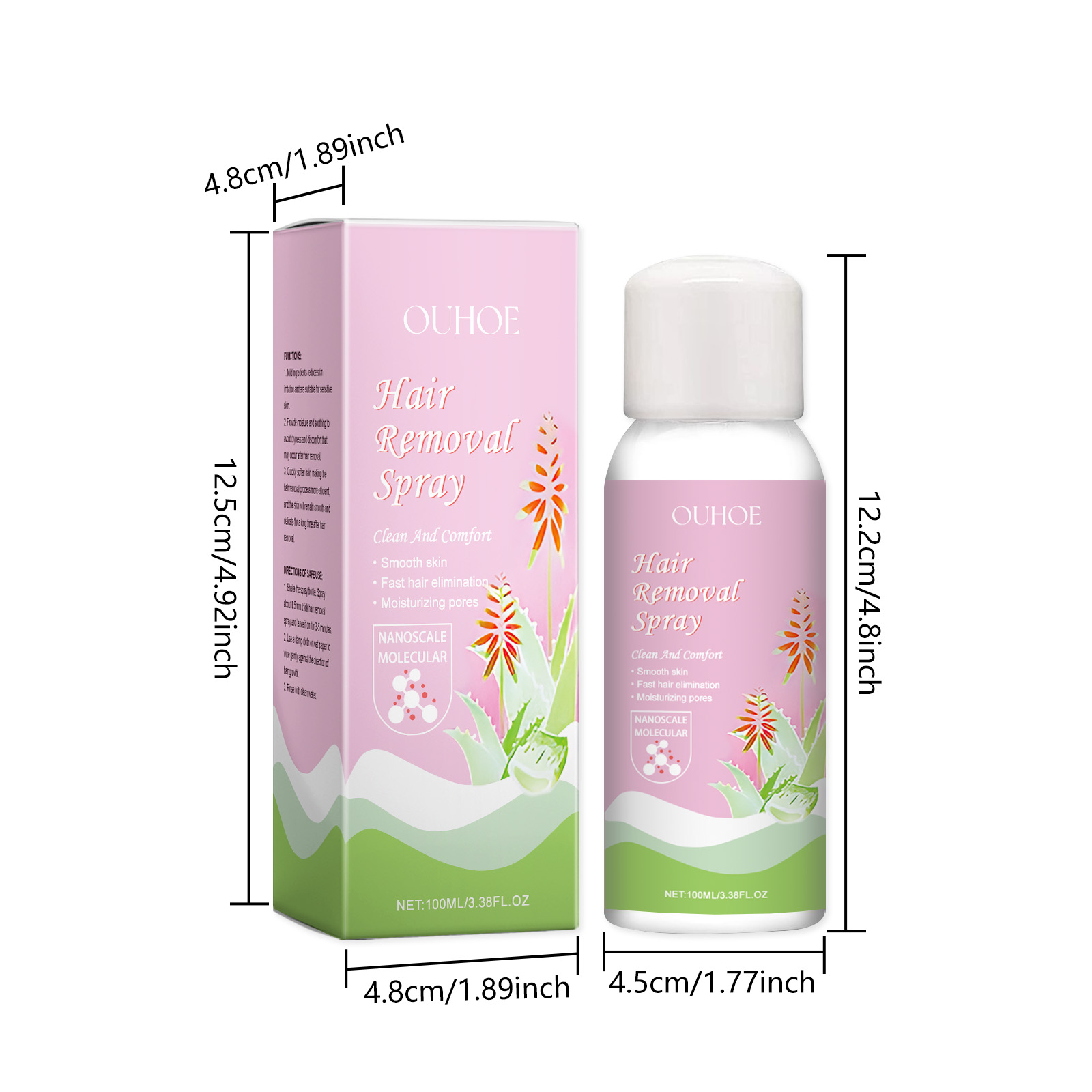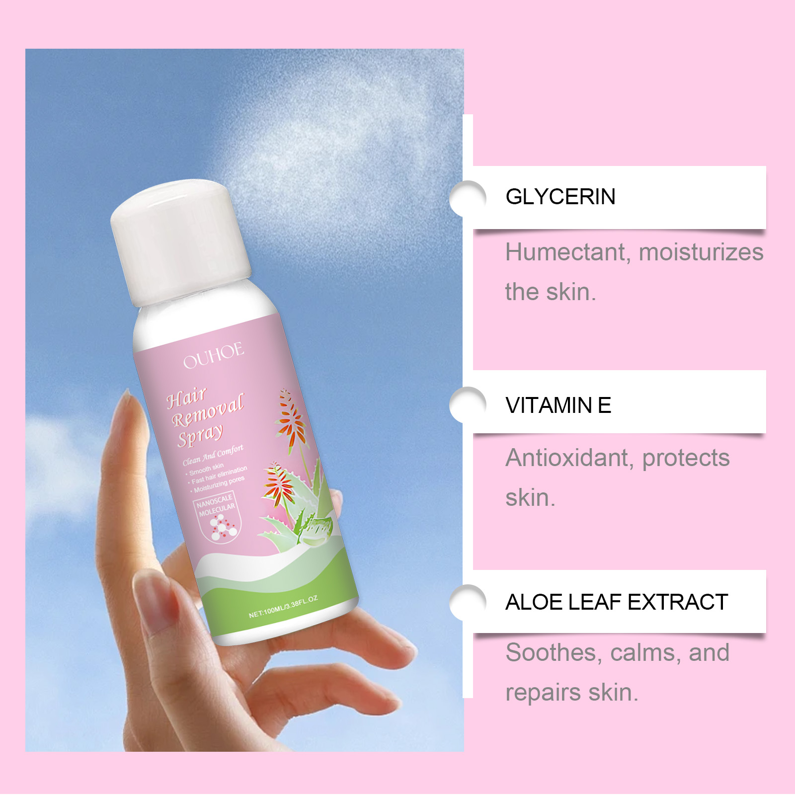Our gentle hair removal mousse spray is carefully formulated with glycerin and cocamidopropyl betaine. Designed specifically to reduce skin irritation. The usage method is extremely convenient: 1. Shake the spray bottle. Spray about 0.5 millimeters thick of hair removal mist and leave it on for 3 to 5 minutes. 2. Gently wipe against the direction of hair growth with a damp cloth or paper. 3. Rinse thoroughly with clean water. And it is suitable for sensitive skin, with a comfortable and non-irritating hair removal process.