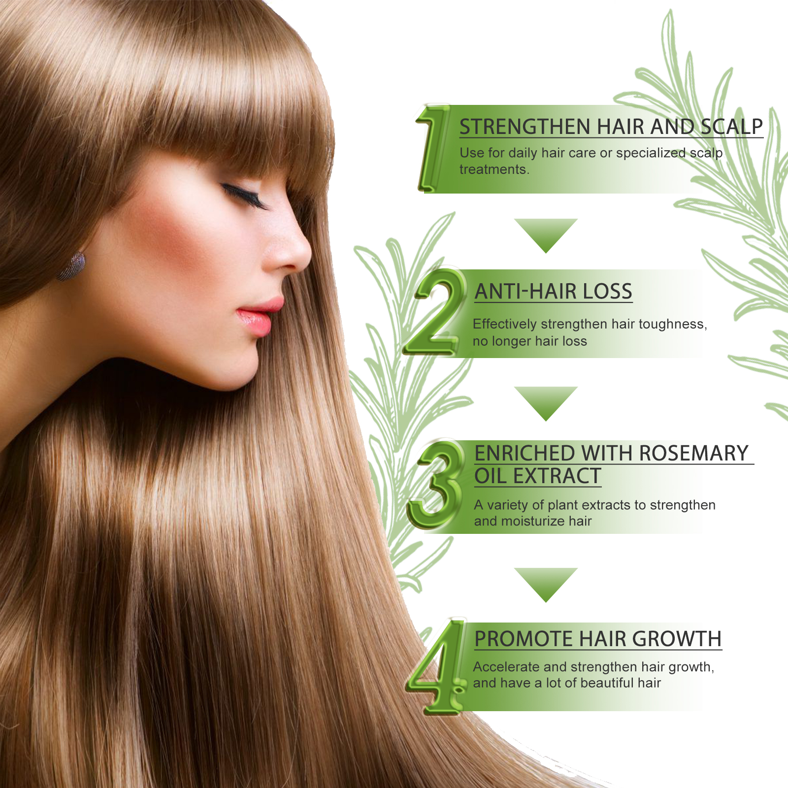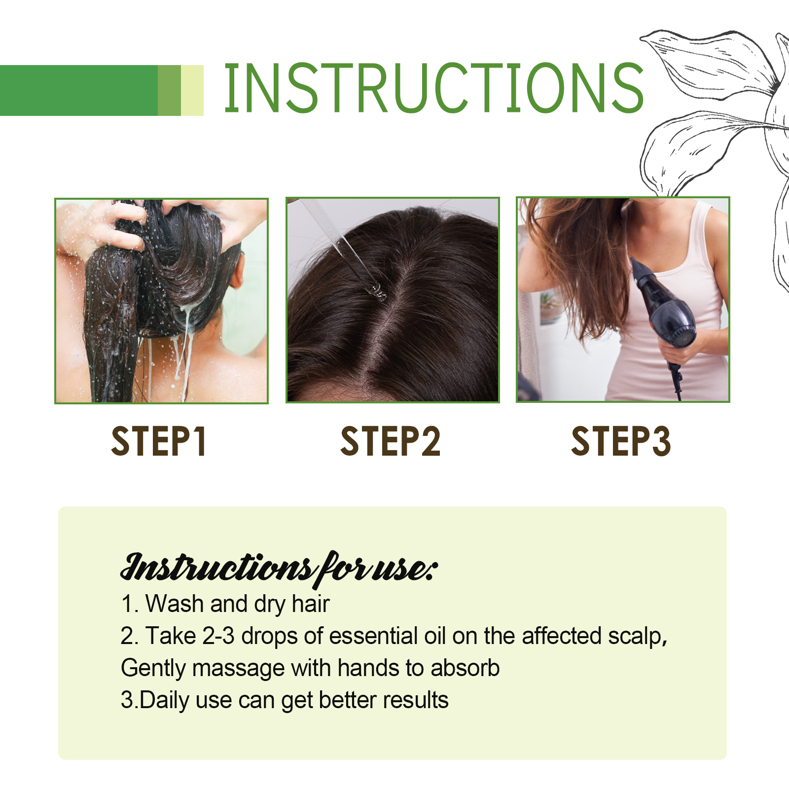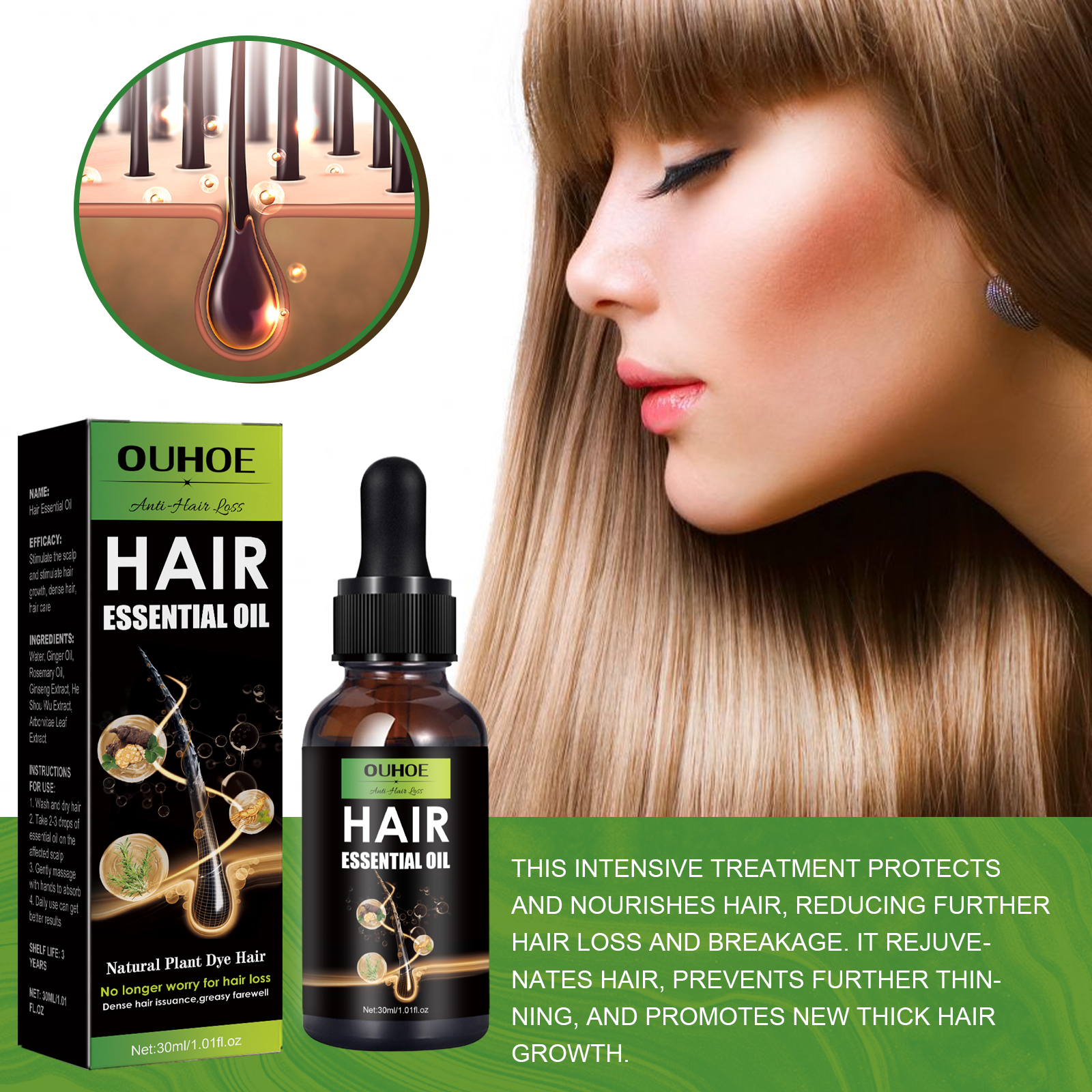 Our hair oil contains ginger oil, rosemary oil, ginseng extract. It can strengthen hair and scalp, effectively strengthen hair toughness, strengthen and moisturize hair, promote hair growth, protect and nourish scalp, reduce hair loss, and make your hair grow faster. Its use method is very simple: first wash and blow dry hair, then drop 2-3 drops of essential oil on the affected scalp, gently massage with the hand to absorb, in daily use can get better results, let the hair more black bright, full of luster.