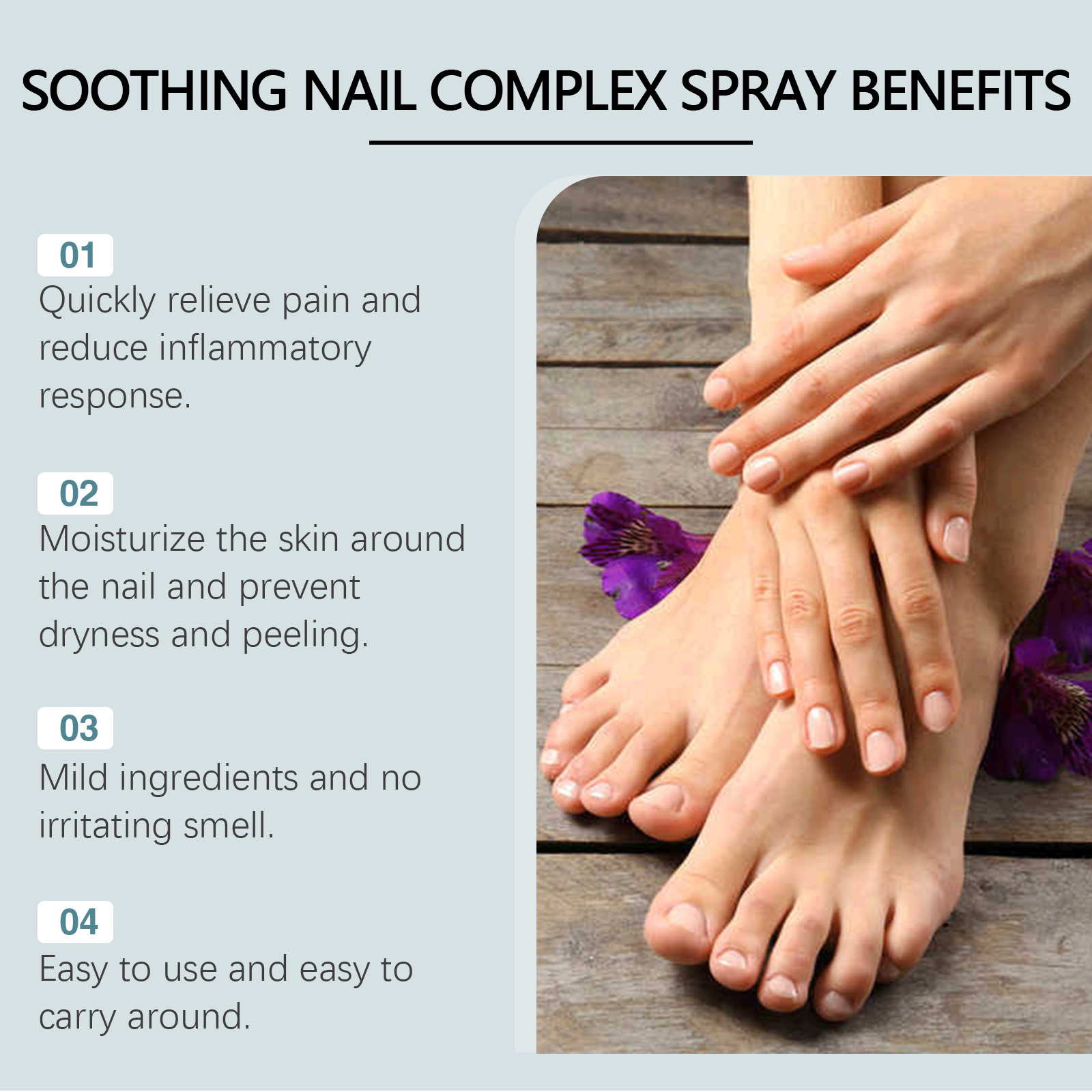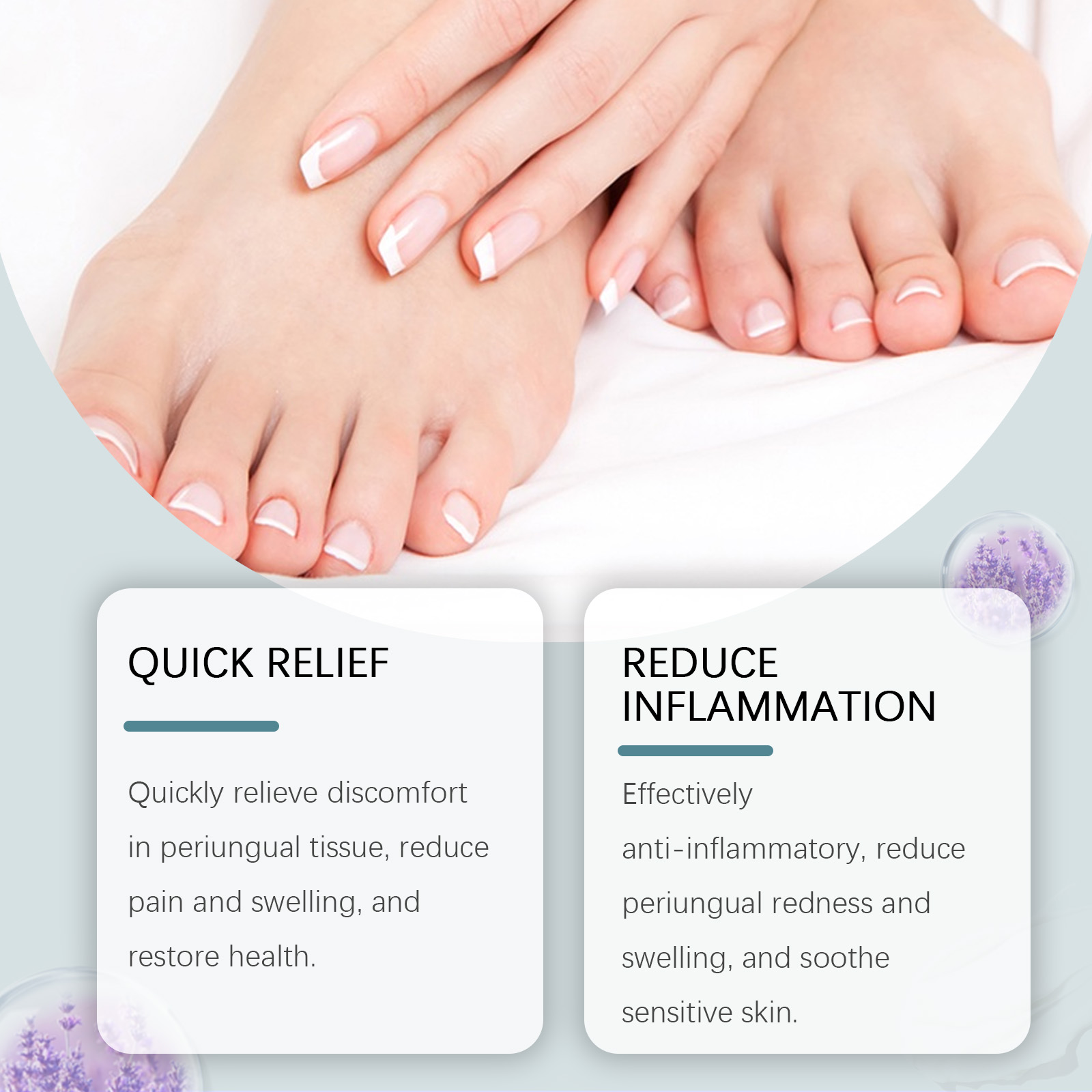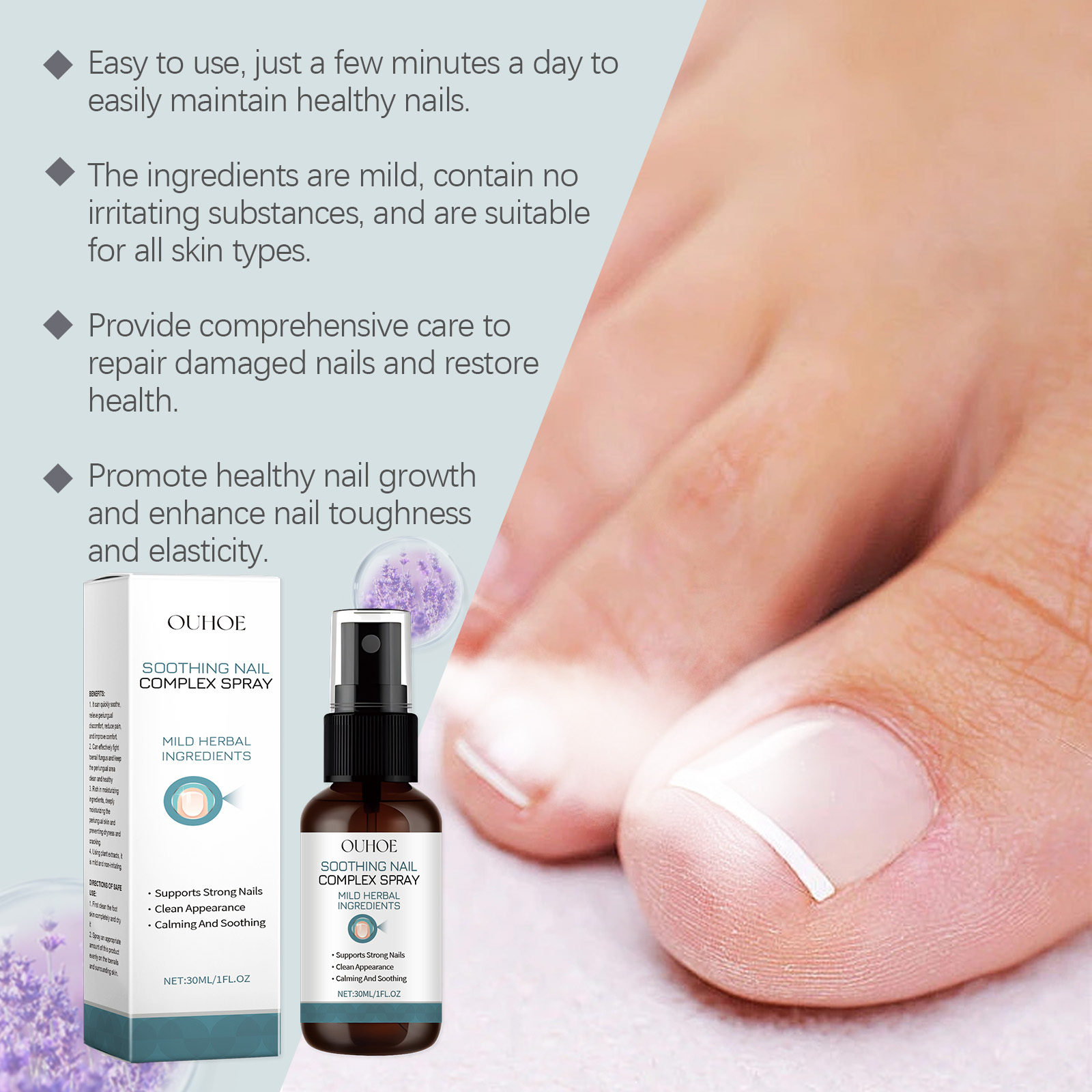 Our nail groove relief spray contains lavender extract, sweet almond oil, Jojoba seed oil. It can quickly relieve the discomfort of the perinail tissue, reduce pain and swelling, and restore health. Effective anti-inflammatory, reduce foot swelling, soothe sensitive skin. Its use method is very simple: 1. First thoroughly clean and dry the foot skin; 2. Evenly spray proper amount of this product on toenails and surrounding skin. Nail groove Relief spray can quickly relieve and relieve foot discomfort, reduce pain and improve comfort. Use plant extracts, mild and non-irritating.