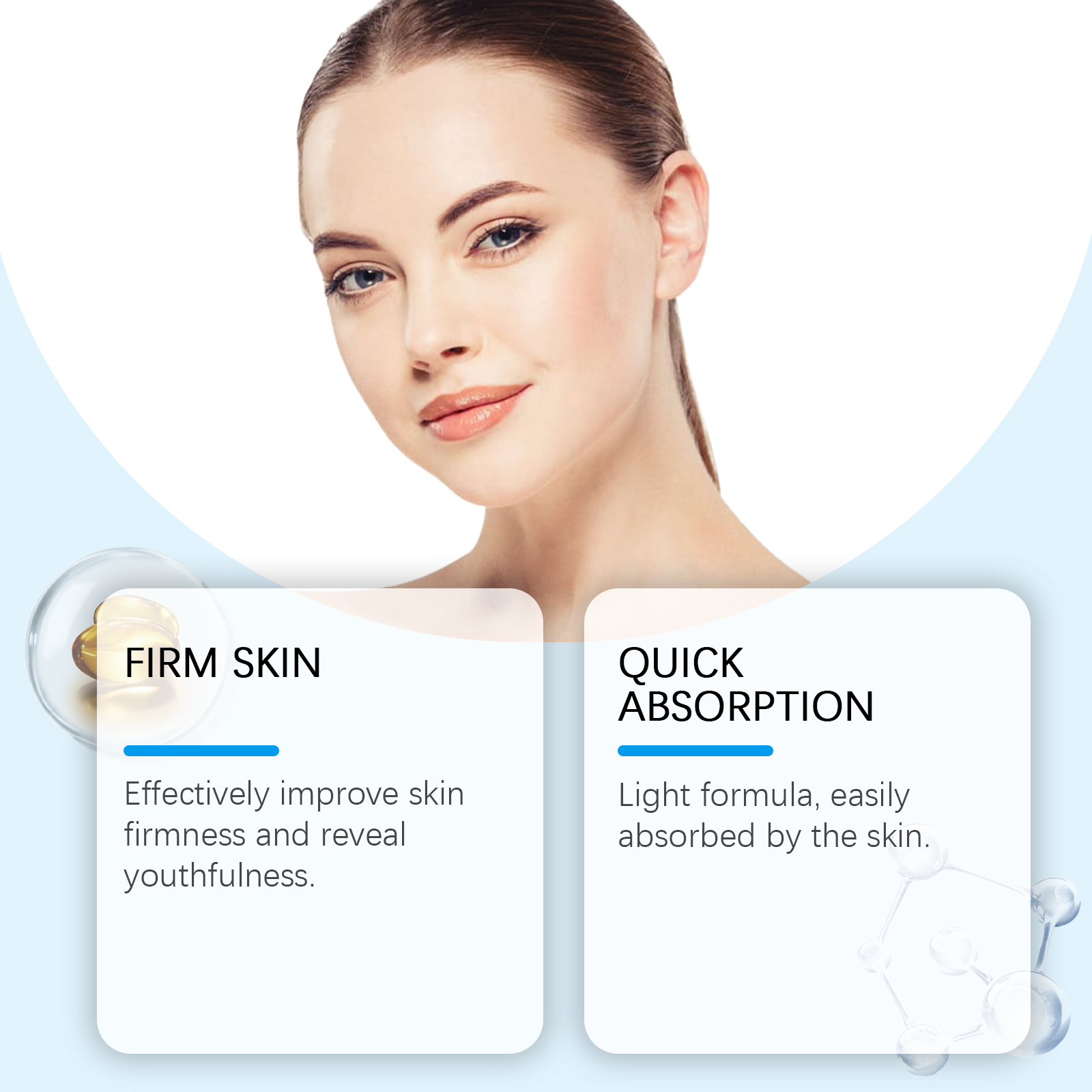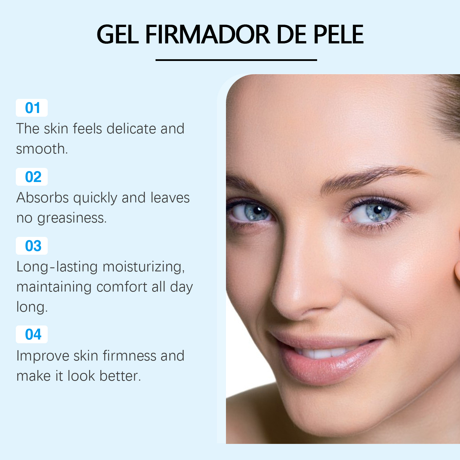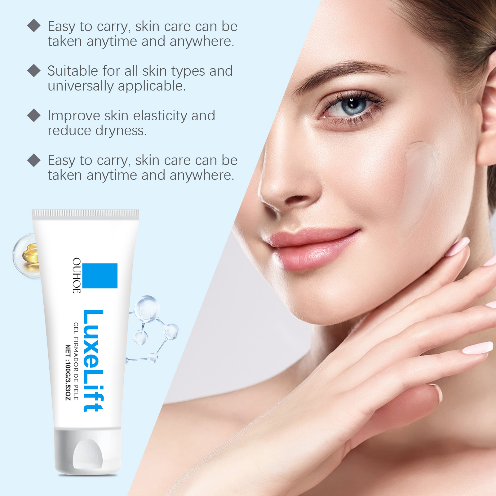 Our skin soothing gel contains hyaluronic acid, tocopherol. It keeps skin moisturized all day long. Its application method is very simple: clean the skin of the required area, keep it dry, apply an appropriate amount of this product to the forehead, cheek, neck and other parts of the skin around the eyes, gently massage to lift the way, so as to fully absorb. And can effectively improve skin firmness, show youthful vitality.