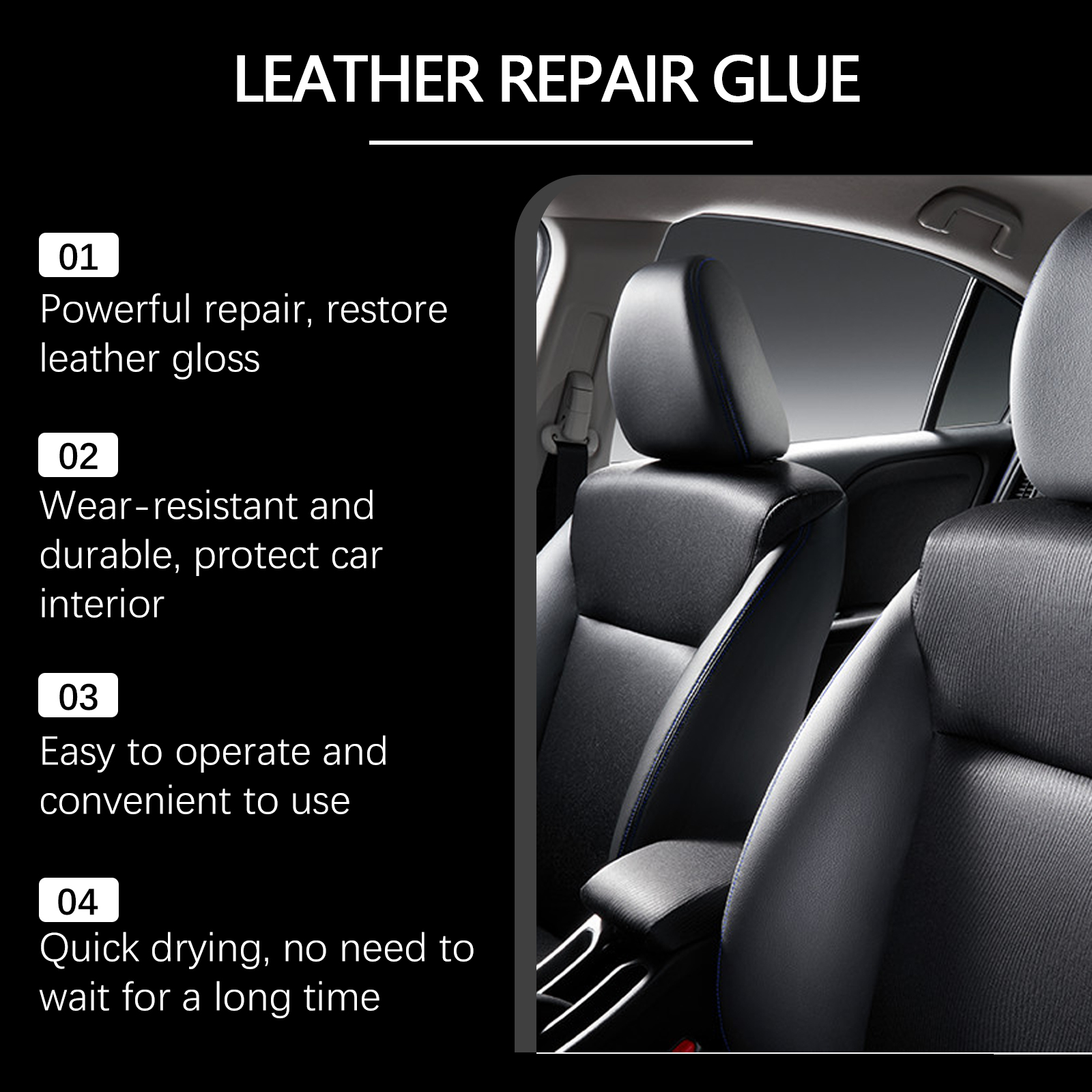 Our car leather repair solution contains epoxy acrylic resin, polyvinyl alcohol, phenolic resin. It can effectively repair leather scratches and cracks, providing lasting protection against further wear. Its use method is very simple: clean and dry the surface of the car leather, take an appropriate amount of this product evenly apply to the parts that need to be repaired. Let it dry. And can restore the luster and texture of the leather, improve the appearance and comfort of the car interior.