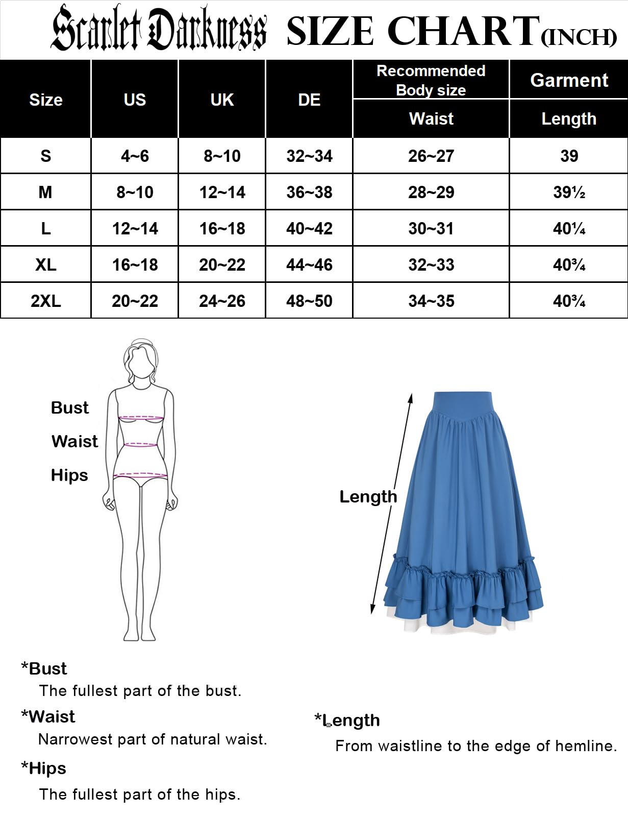 | Size | US | UK | DE | Recommended Body size Waist | Garment Length |