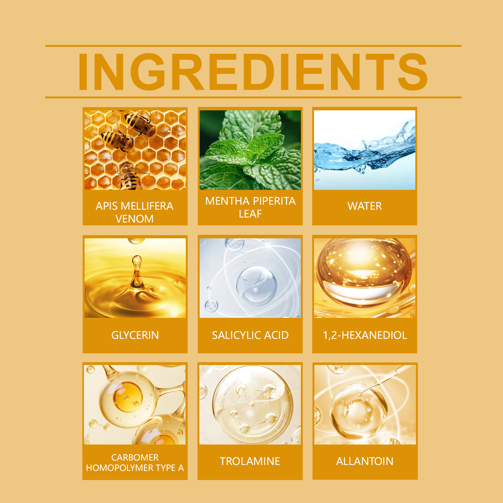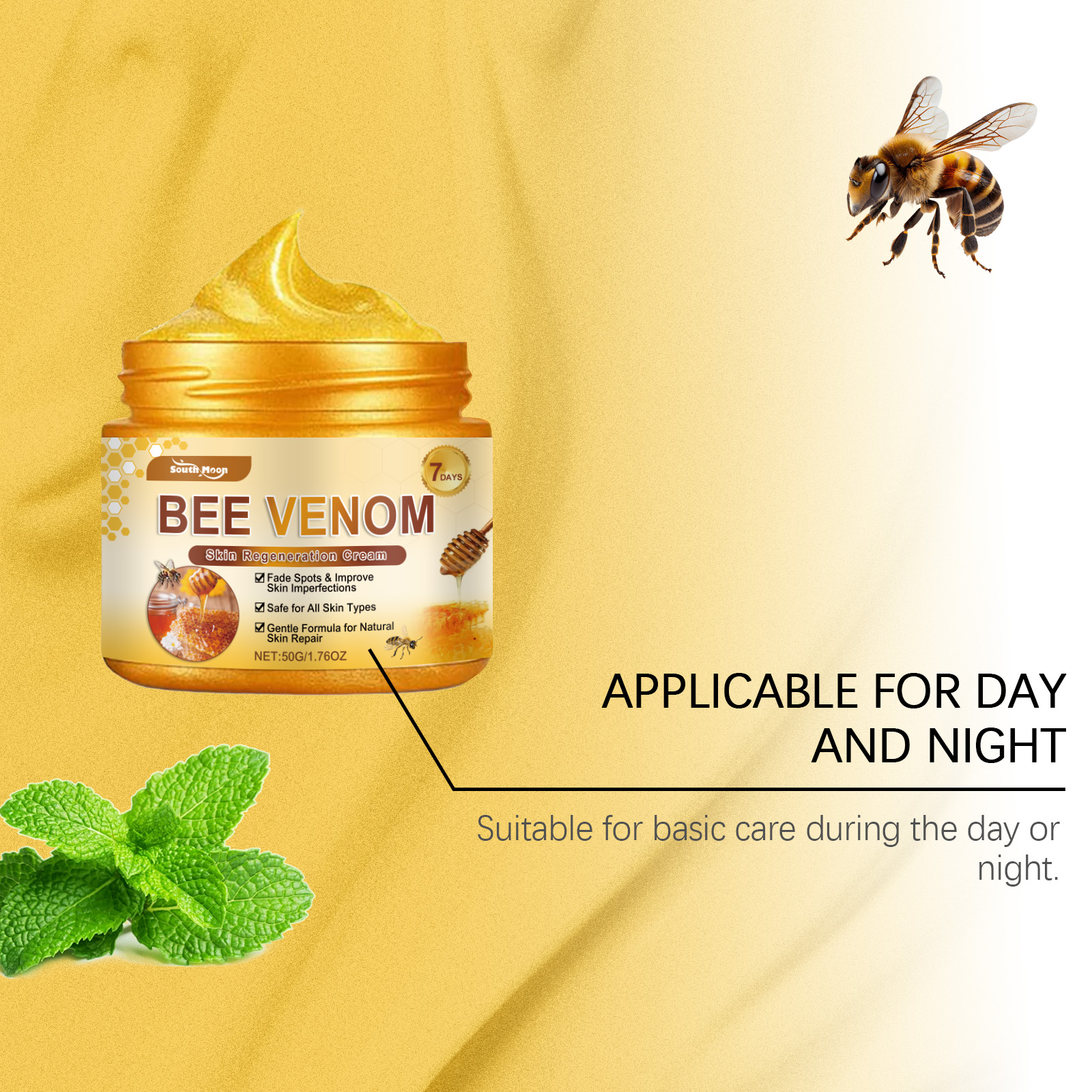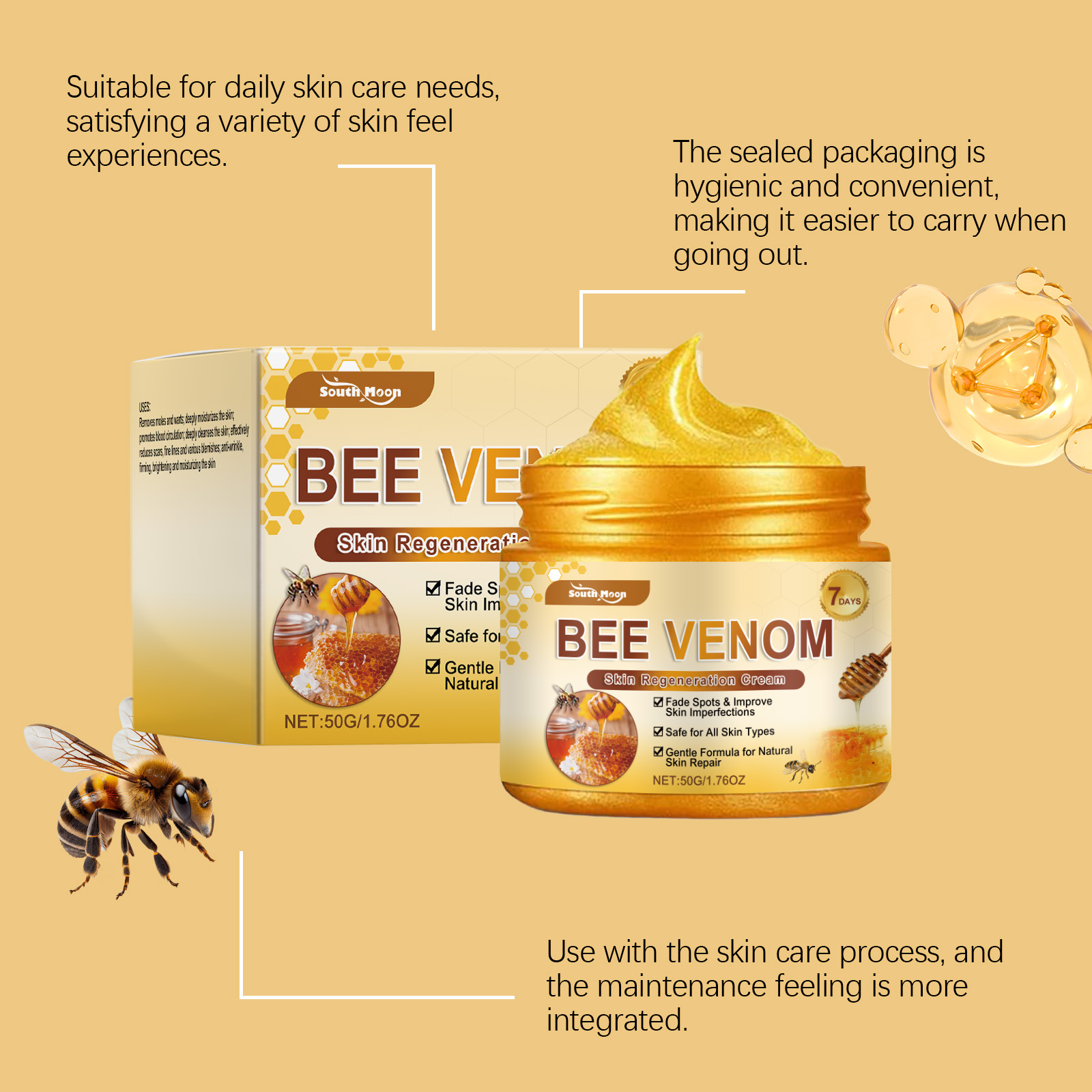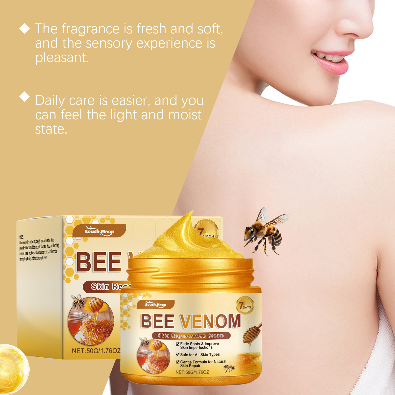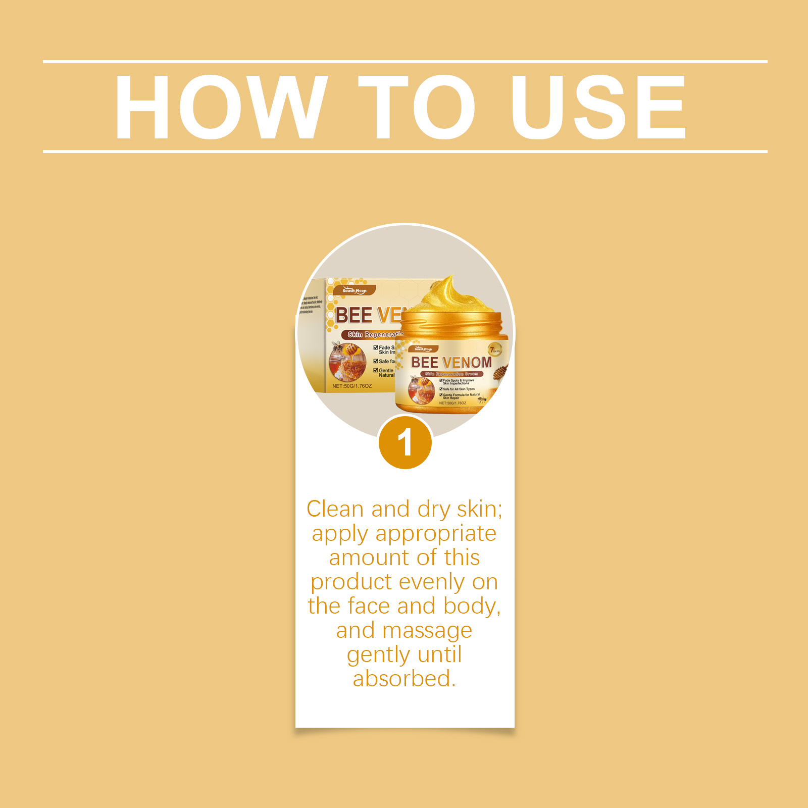 Our bee venom Skin Multi-effect Care Cream is carefully formulated with glycerin, 1, 2-hexanediol and carbomer. Designed specifically for effectively fading scars, fine lines and various blemishes. The usage method is extremely convenient: Clean dry skin, apply an appropriate amount of this product evenly to the face and body, and gently massage until fully absorbed. And after use, the skin appears bright and soft.