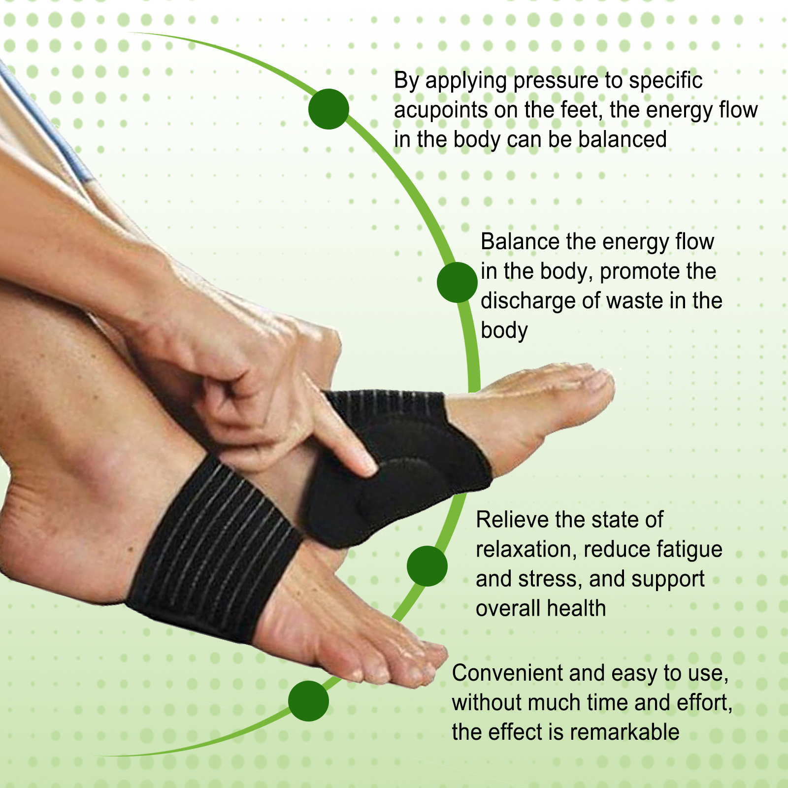 Our Foot Acupressure Pads contain resin. It can balance the energy flow in the body by applying pressure to specific six positions on the feet, promote the removal of waste from the body, relieve a relaxed state, reduce fatigue and stress, and support overall health. The way to use it is simple: wear the foot shiatsu pad directly on the foot and continue with your daily activities. Balance energy flow in the body, discharge metabolic waste in the body, reduce fatigue.
