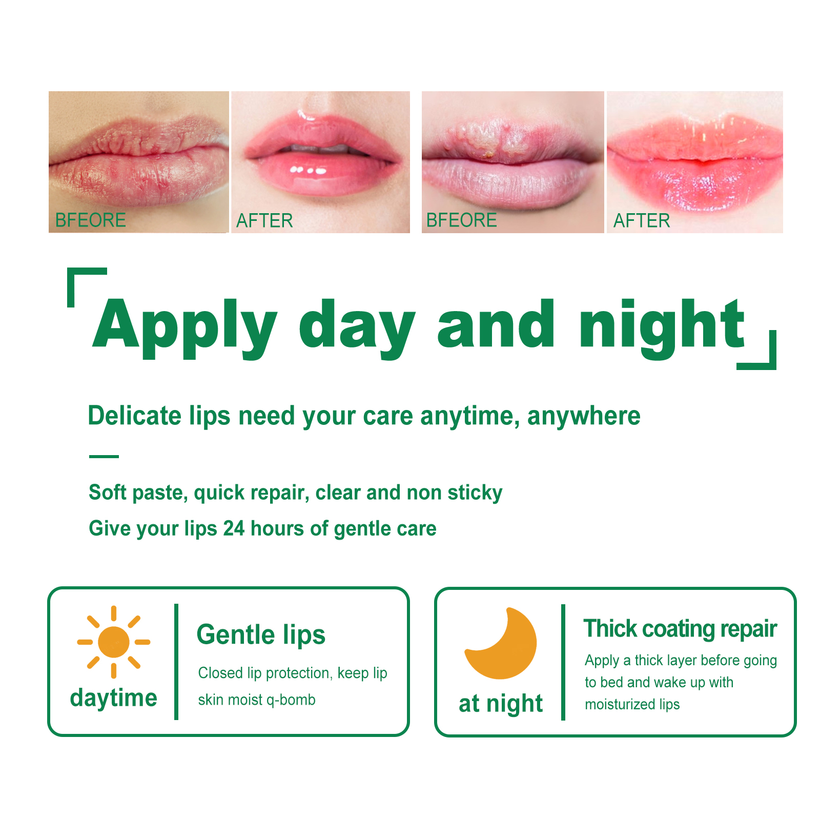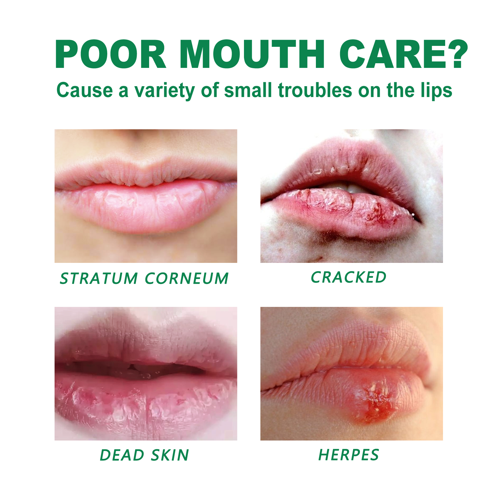 Our Herbal Medicated Lip Balm contains glycerin, sodium hyaluronate, acyclovir. It naturally moisturizes the lips, improves the elasticity of the lips, makes them fuller, helps reduce fine lines and wrinkles around the lips, and treats dry, chapped and chapped lips. Its application is simple: apply herbal lip balm evenly to chapped lips and apply it daily. Effectively solve dry lips, dry and cracked, make lips more moist and full.