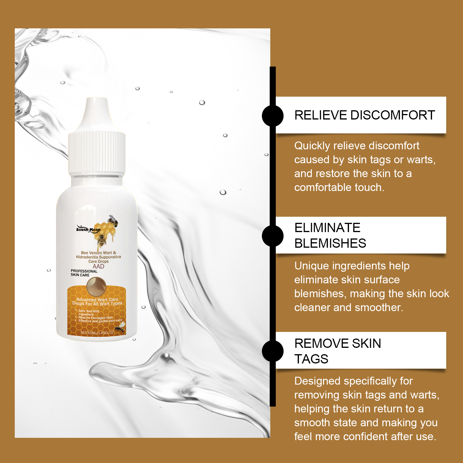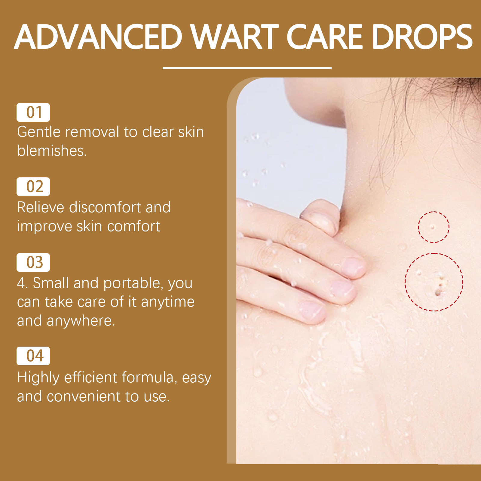 Our Kew care drops contain peppermint extract, vitamin E. It can effectively improve the appearance of skin, reduce unnecessary blemishes and make skin more delicate. Its use method is very simple: clean the skin, keep the skin dry, take an appropriate amount of this product, apply to the skin of warts or moles, gently massage until absorbed. It is also easy to carry and provides skin care anytime, anywhere.