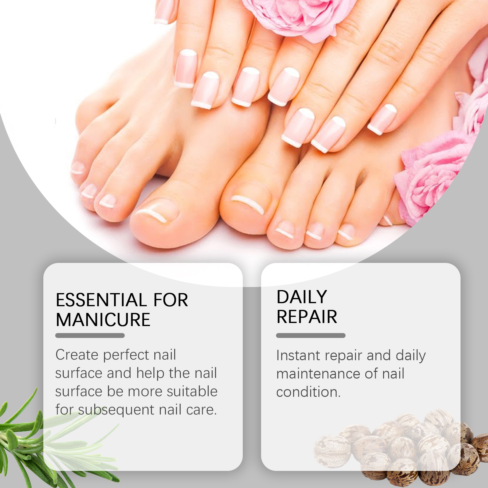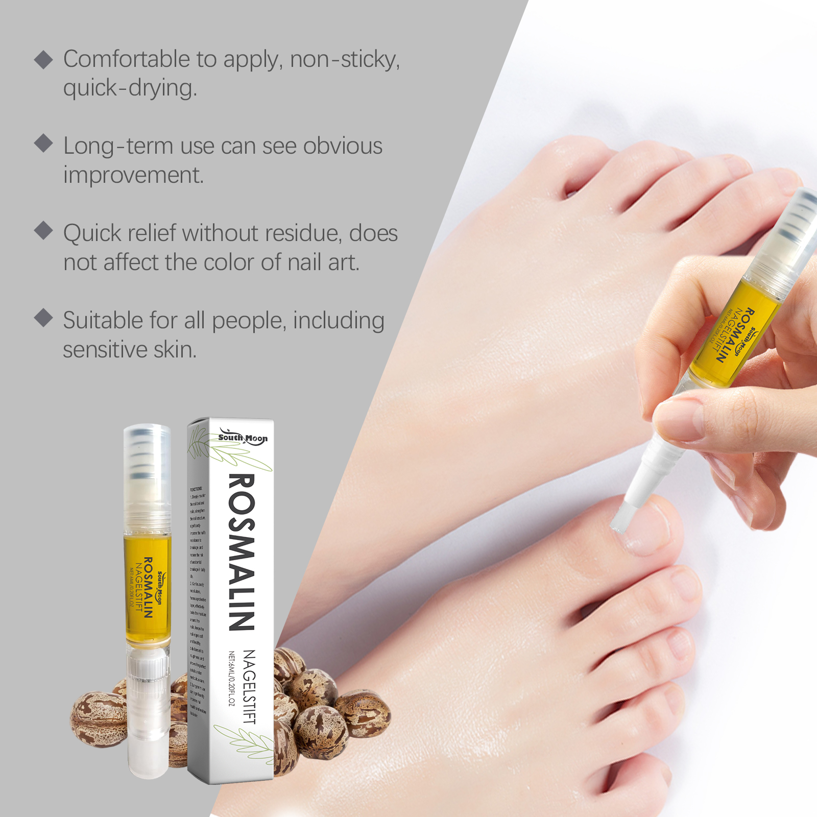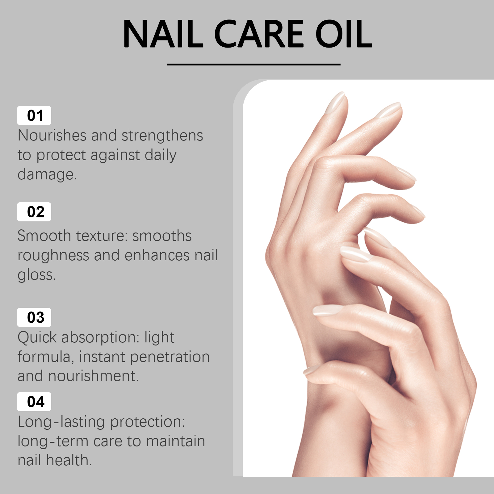 Our nail care oils include sunflower seed oil and lemongrass oil. It provides instant repair and daily maintenance of nail condition. Its application is simple: thoroughly clean the surface of the nail and the skin around the nail, keep it dry, gently apply the product to the surface of the nail and let it dry. And using a scientific formula, specifically designed for fragile nails. Promotes nail growth and accelerates nail recovery.