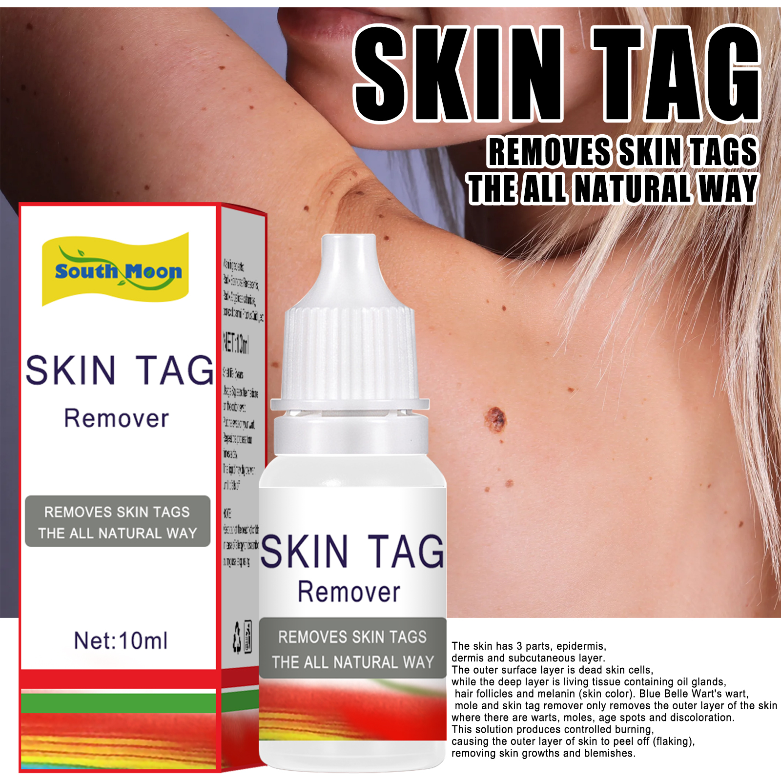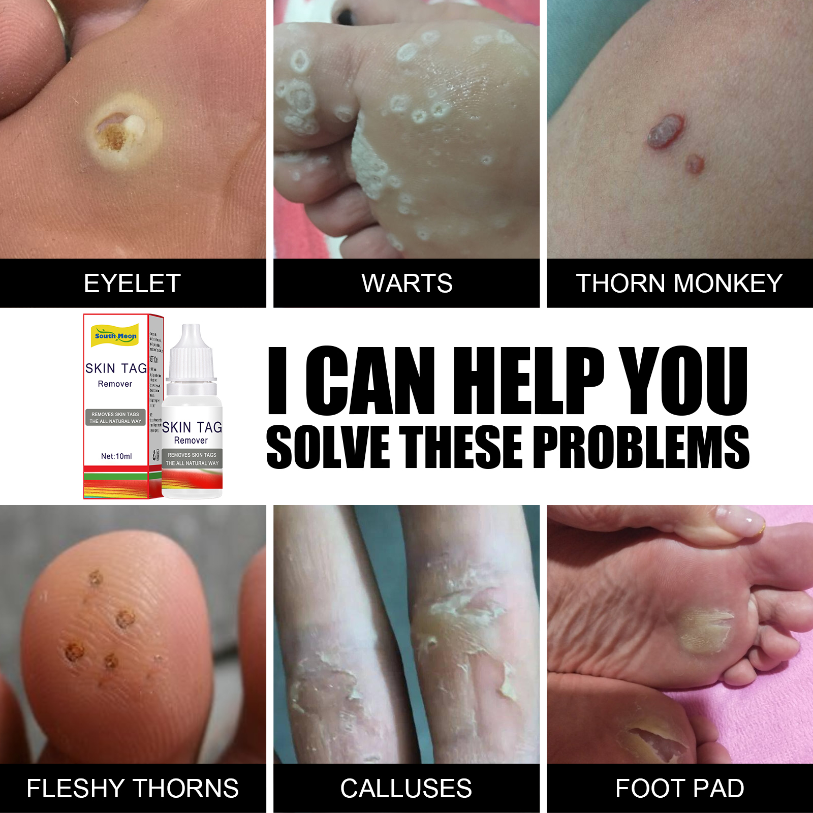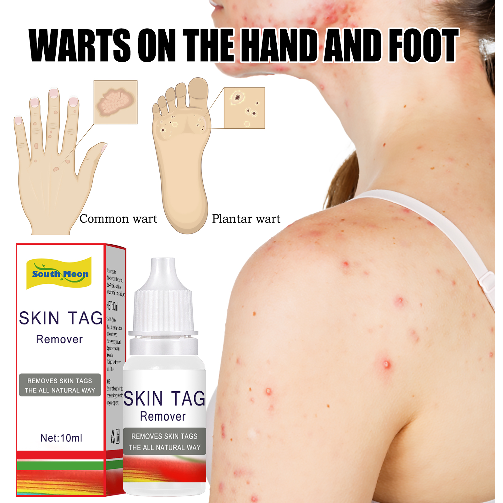Our liquid contains honeysuckle, comfrey and cypress. It removes skin growths and blemishes. The way to use it is very simple: open the package, wash the affected area to ensure that the affected area is clean, then we remove the wart solution, and then apply it to a cotton swab, and leave it on for about half an hour, and then wipe off the wart solution. Use it once a day, only use it once at a time, until it is stopped after the growth of the scab. And can clear heat detoxification, corrosion warts.