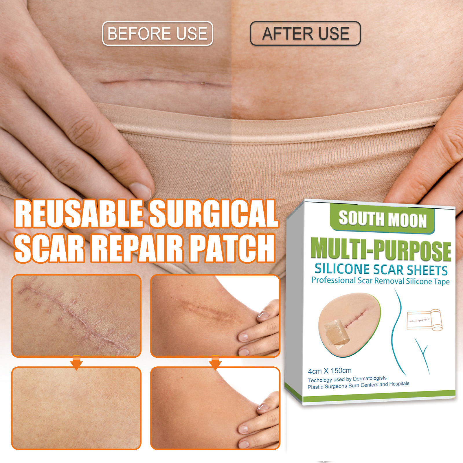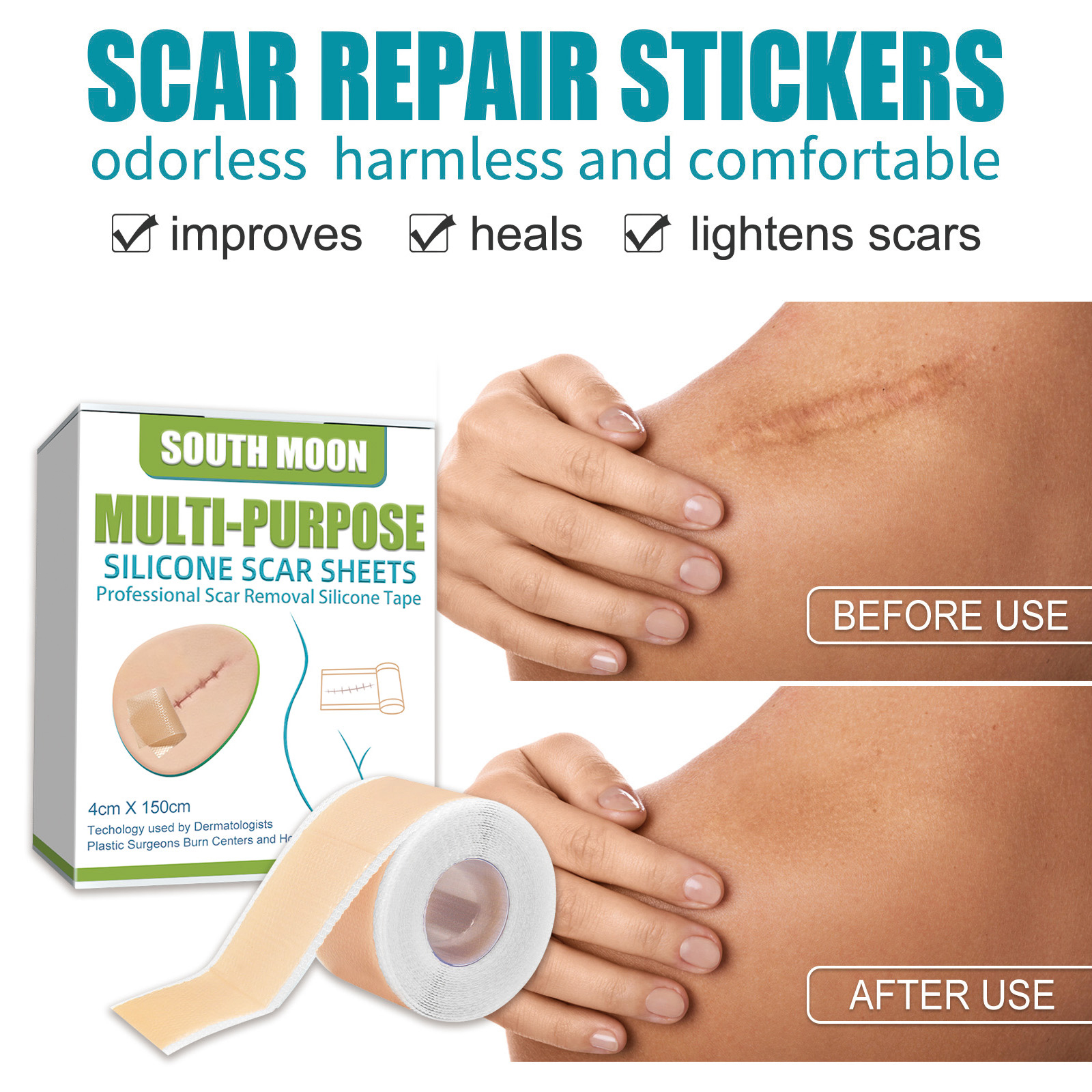 Our skin repair patch contains silicone. It can treat and reduce scar size and can be cut at will. Its application is simple: cut the product according to the size and shape of the scar, remove the product from the adhesive surface, and gently press the product into the scarred area. And can fade scars, repair scars.