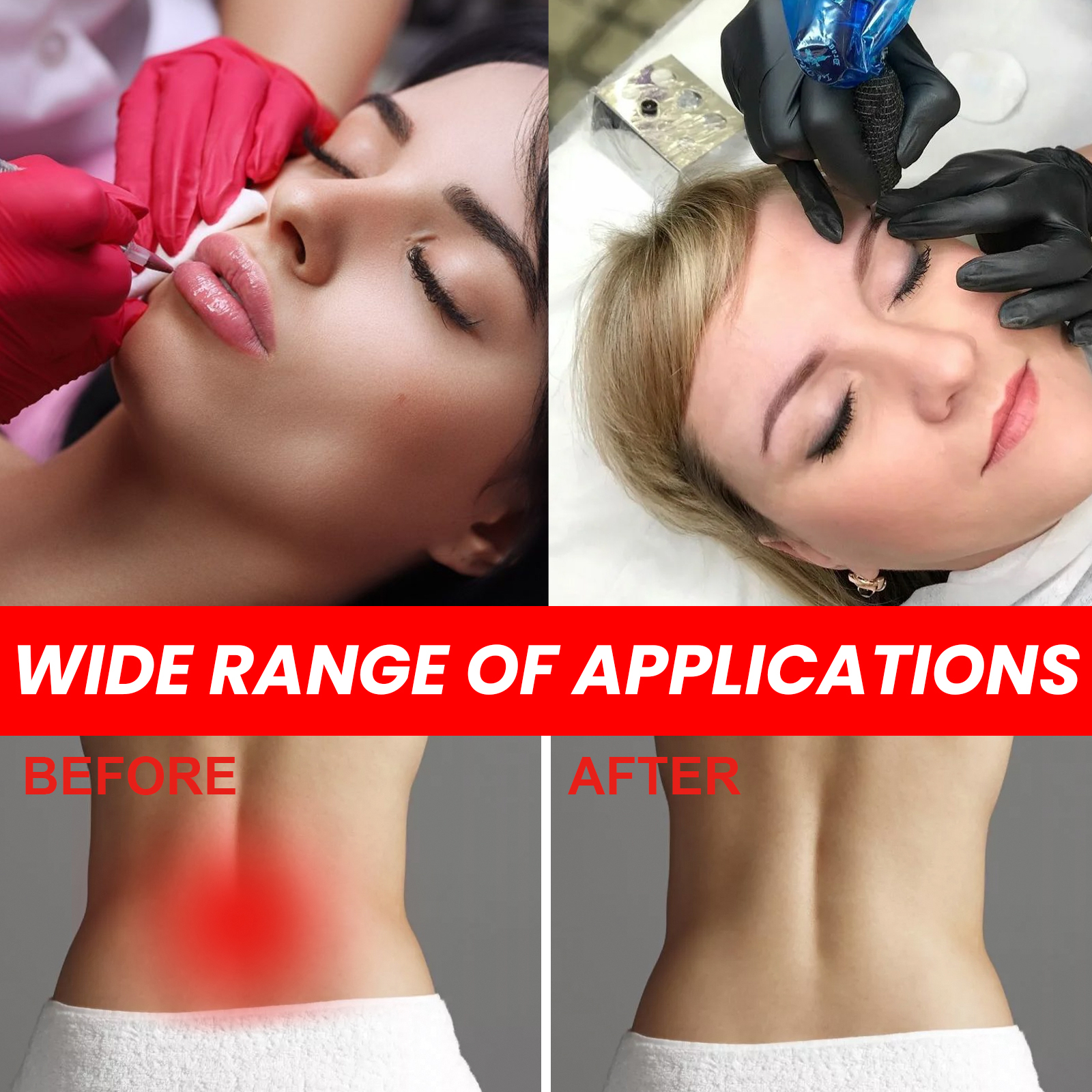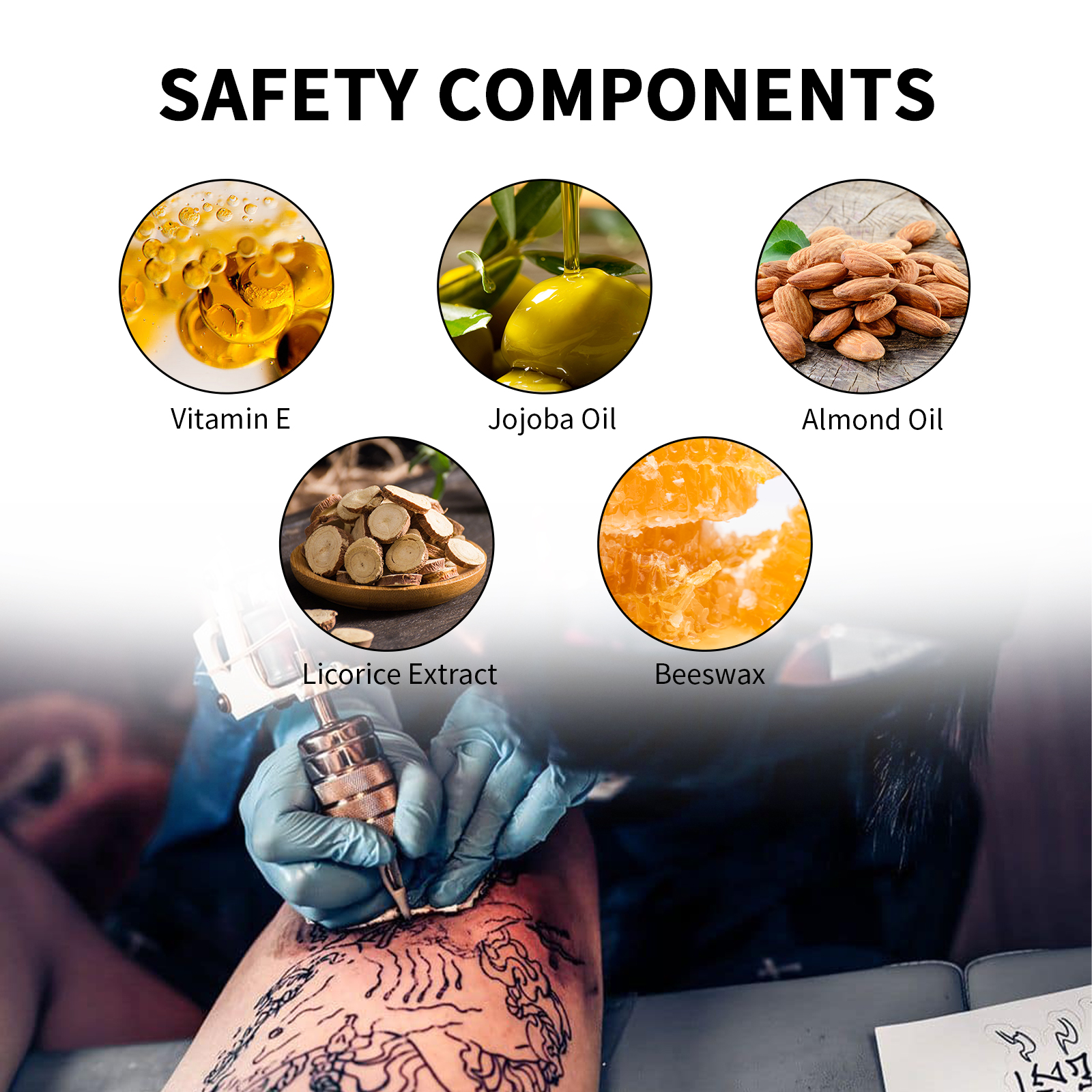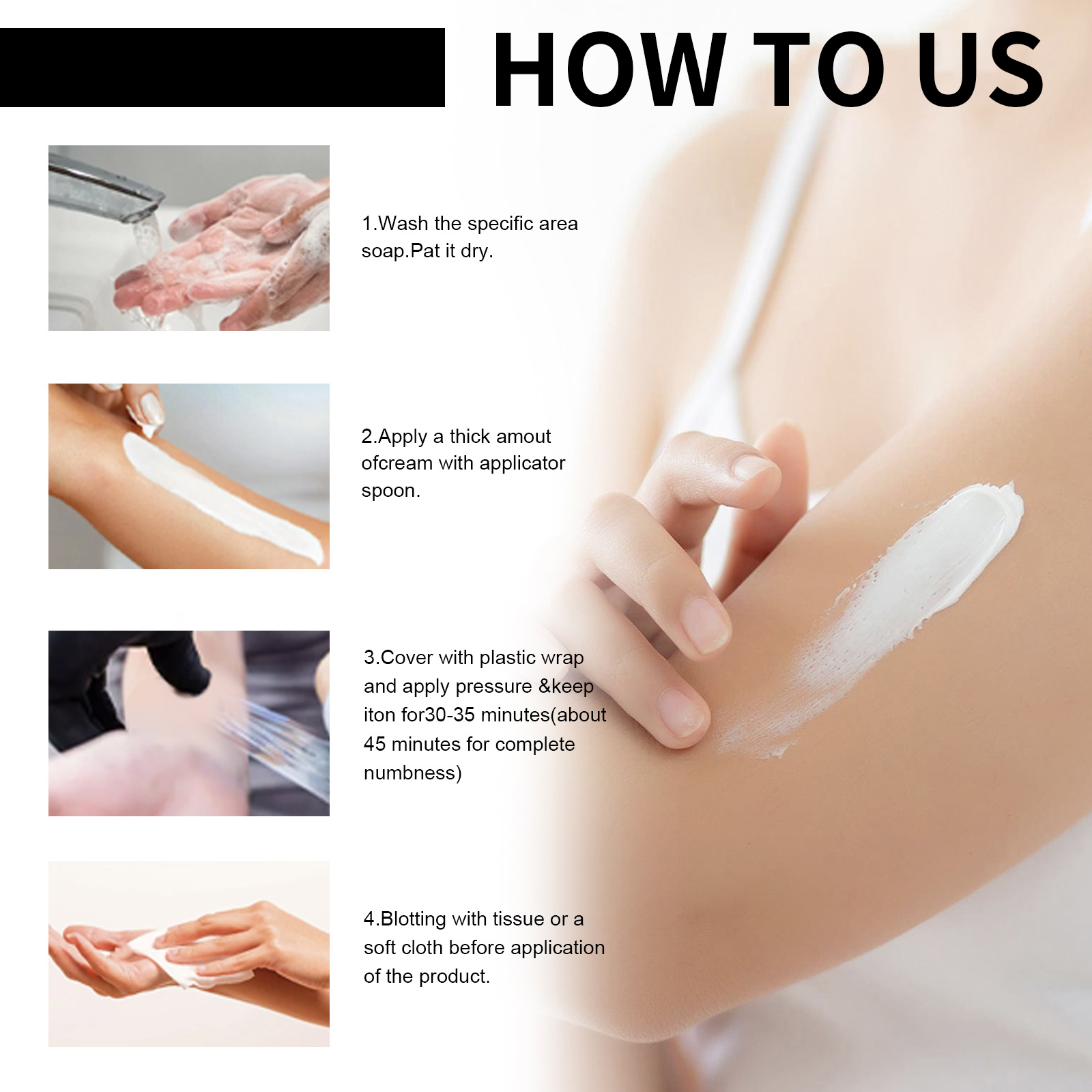 Our Tattoo Numb Cream contains Jojoba oil, vitamin e, beeswax. It can reduce swelling, promote tattoo healing, repair and moisturize the skin. Its application is simple: wash the specific area with soap and pat it dry, apply a thick layer of the product with a smearing spoon, cover with plastic wrap, apply pressure and hold for 30-35 minutes (fully hold for about 45 minutes). Pat dry with paper towel or soft cloth before applying. Reduce tattoo pain, repair and fade tattoo marks.