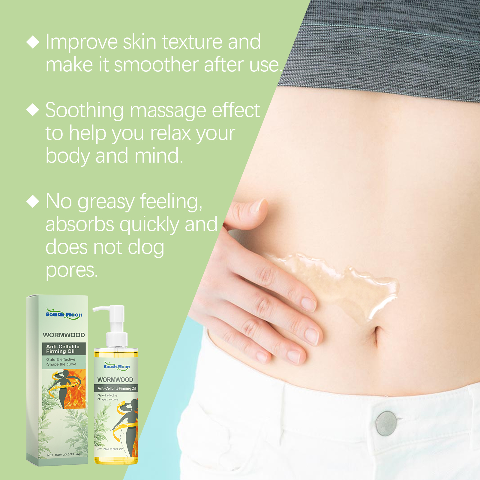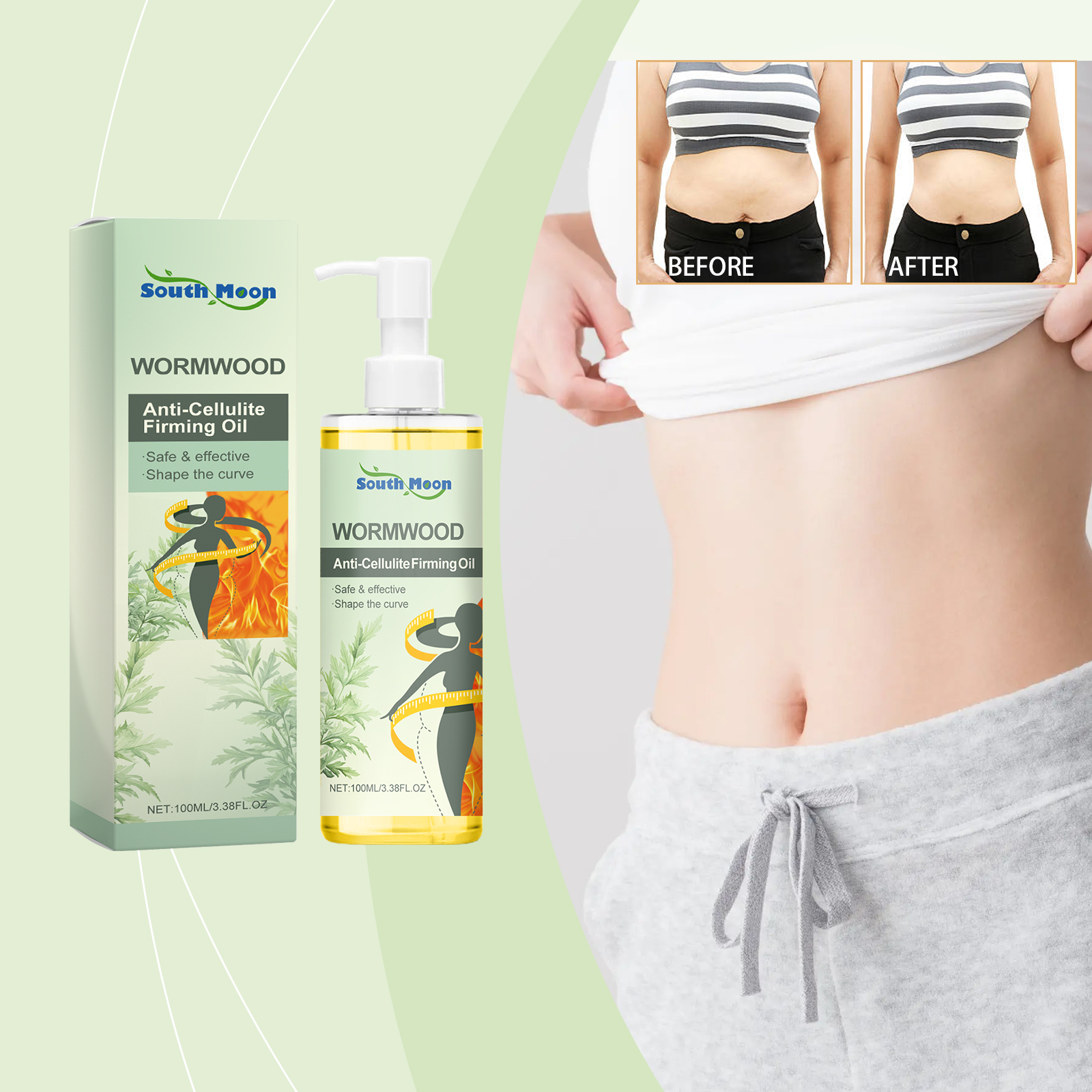 Our mugwort care oil contains mineral oil and Jojoba seed oil. It can be quickly absorbed by the skin, providing powerful firming, moisturizing and regenerative effects. Its application method is very simple: Clean the skin of the application area, take an appropriate amount of firming oil and apply it to the target area, such as the thighs, buttocks, abdomen, etc. Gently massage the fat and lymph in circular motions with your fingers until it is fully absorbed. And it can provide a soothing touch.
