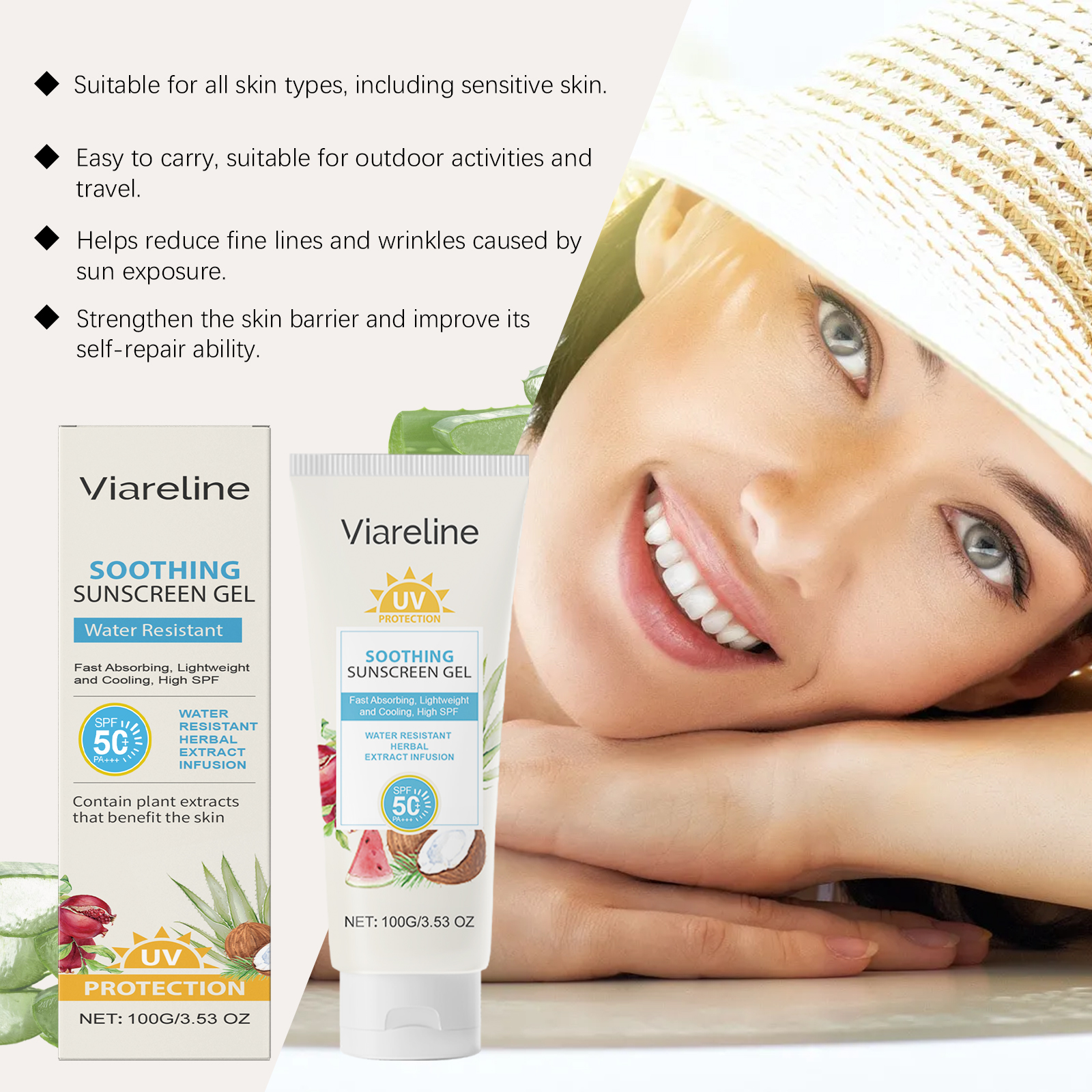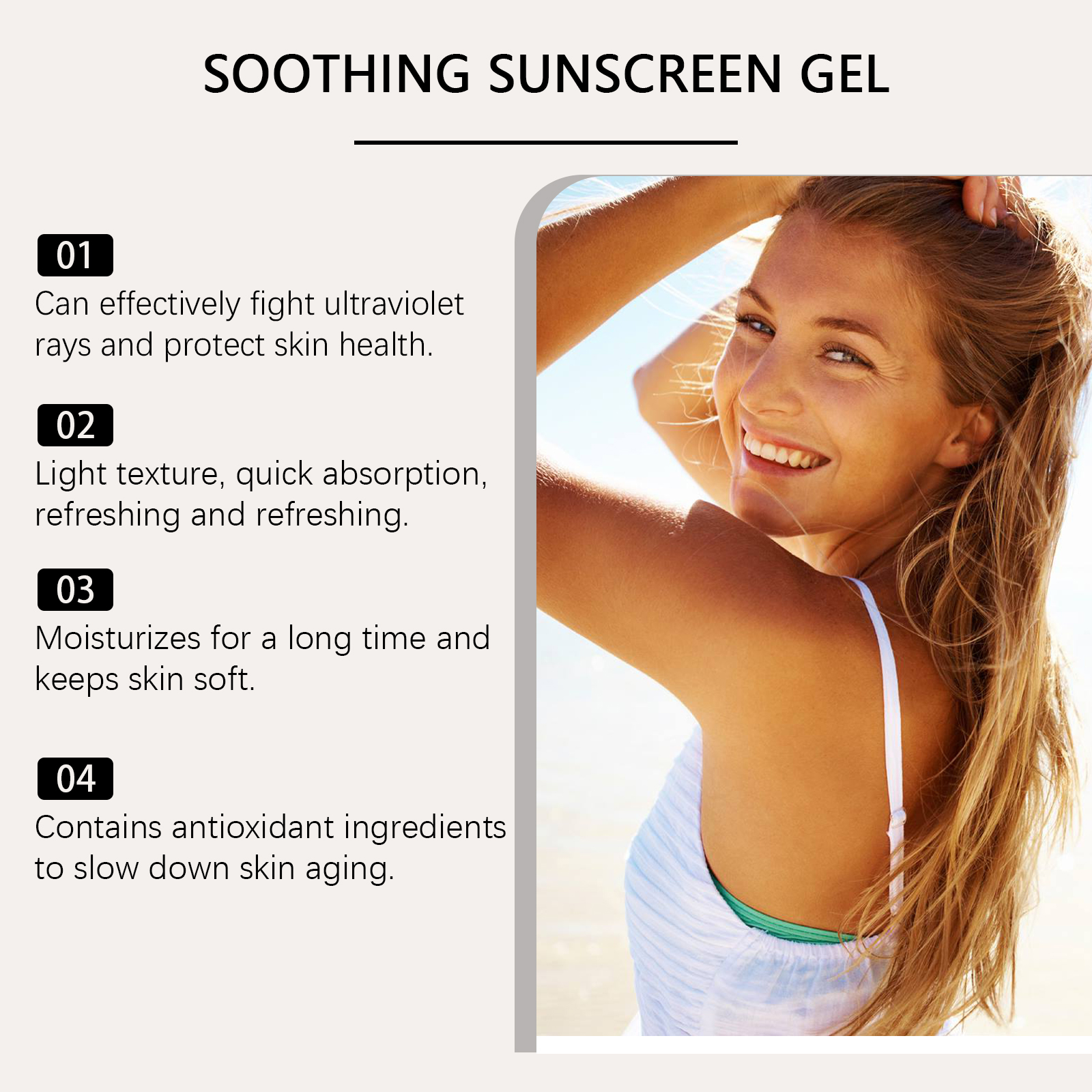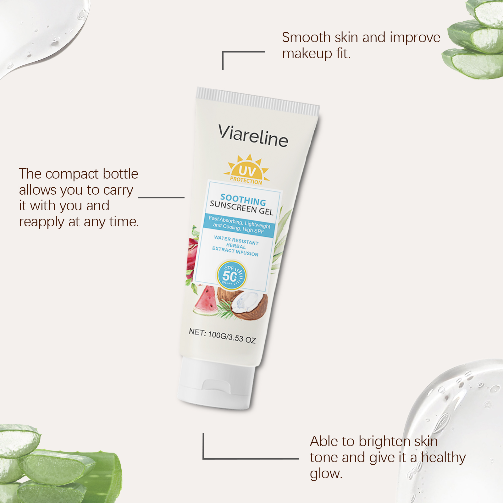 Our soothing gel contains titanium dioxide and niacinamide. It provides effective protection against UV radiation: reduces sun damage. The formula is lightweight, quickly absorbed into the skin and comfortable to use. Its application method is very simple: 15-20 minutes before going out, evenly apply the sunscreen gel to the face or body parts that need sunscreen and massage until it is completely absorbed and wait for the film to form. If you need to apply makeup, please use it before applying makeup. If exposed to the sun for a long time, it needs to be reapplied every 2-3 hours. And can continue to provide the skin needs moisture and moisturizing.
