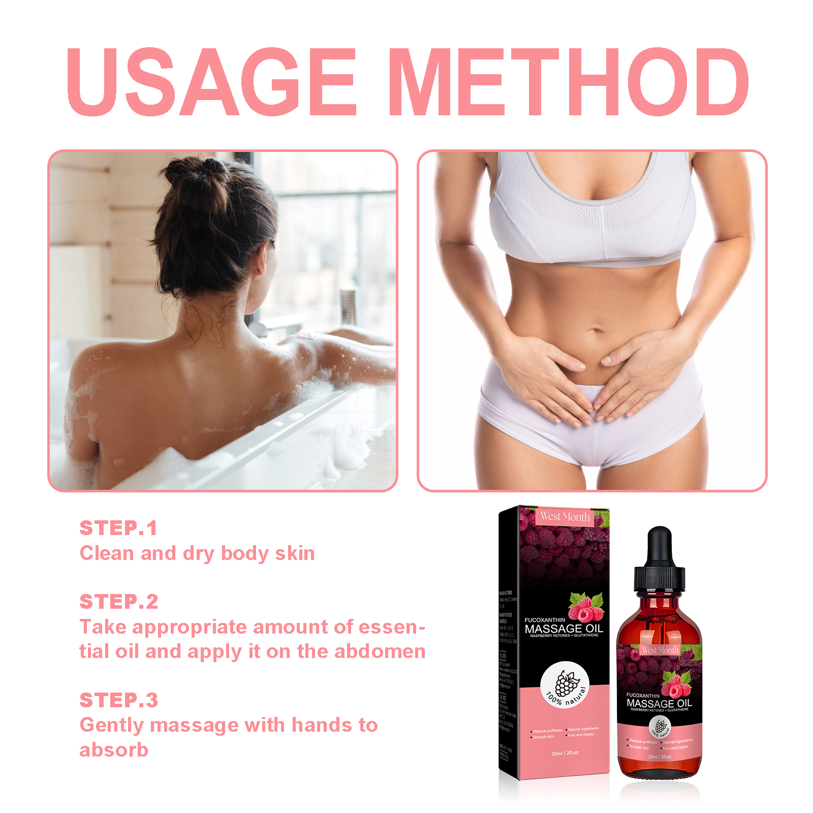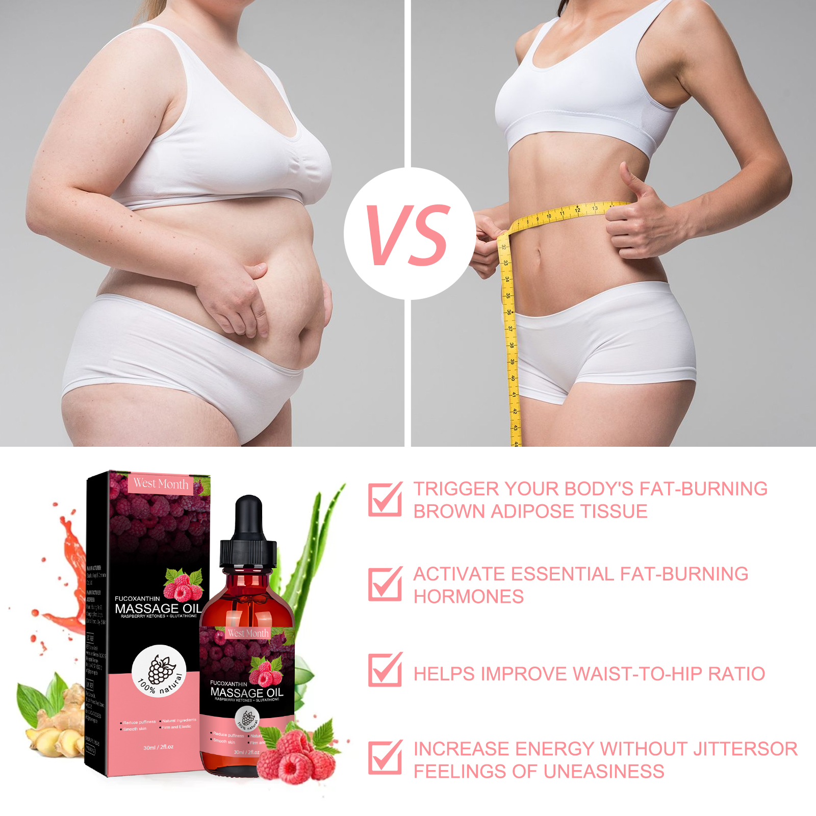 Our body shaping essential oils contain ginger extract, aloe vera extract. It increases energy and does not produce feelings of restlessness. Its use method is very simple: step 1, clean and dry the body skin; Step 2: Apply appropriate amount of essential oil to abdomen; Step 3 Gently massage with your hands to absorb. And can ease the body"s appearance and health.