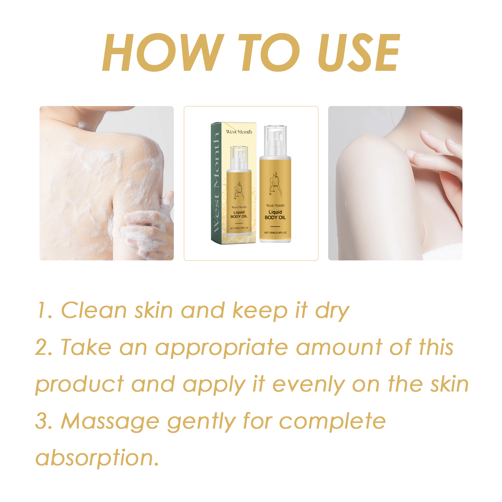 Our Liquid Body Oil contains Squalane, Niacinamide, Hyaluronic Acid. It can effectively moisturize, help reduce fine lines and wrinkles, restore skin glow, and make skin appear more youthful. Its use method is very simple: clean and dry the skin, take appropriate amount of this product evenly applied to the skin, gently massage, so that it can be completely absorbed. It can effectively moisturize and fight wrinkles, leaving you with young, smooth, full skin, nourished by moisture.