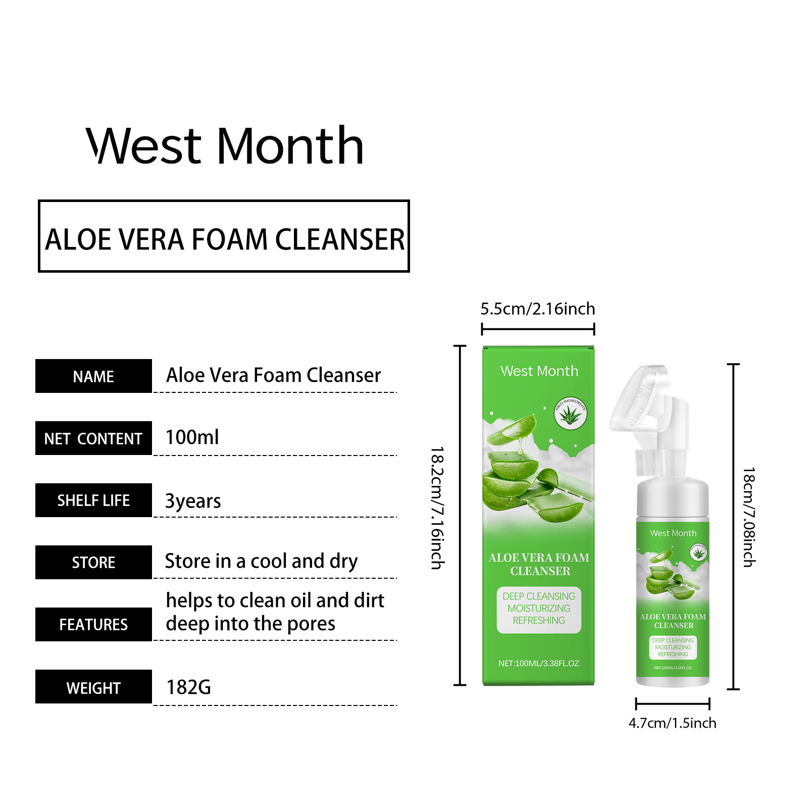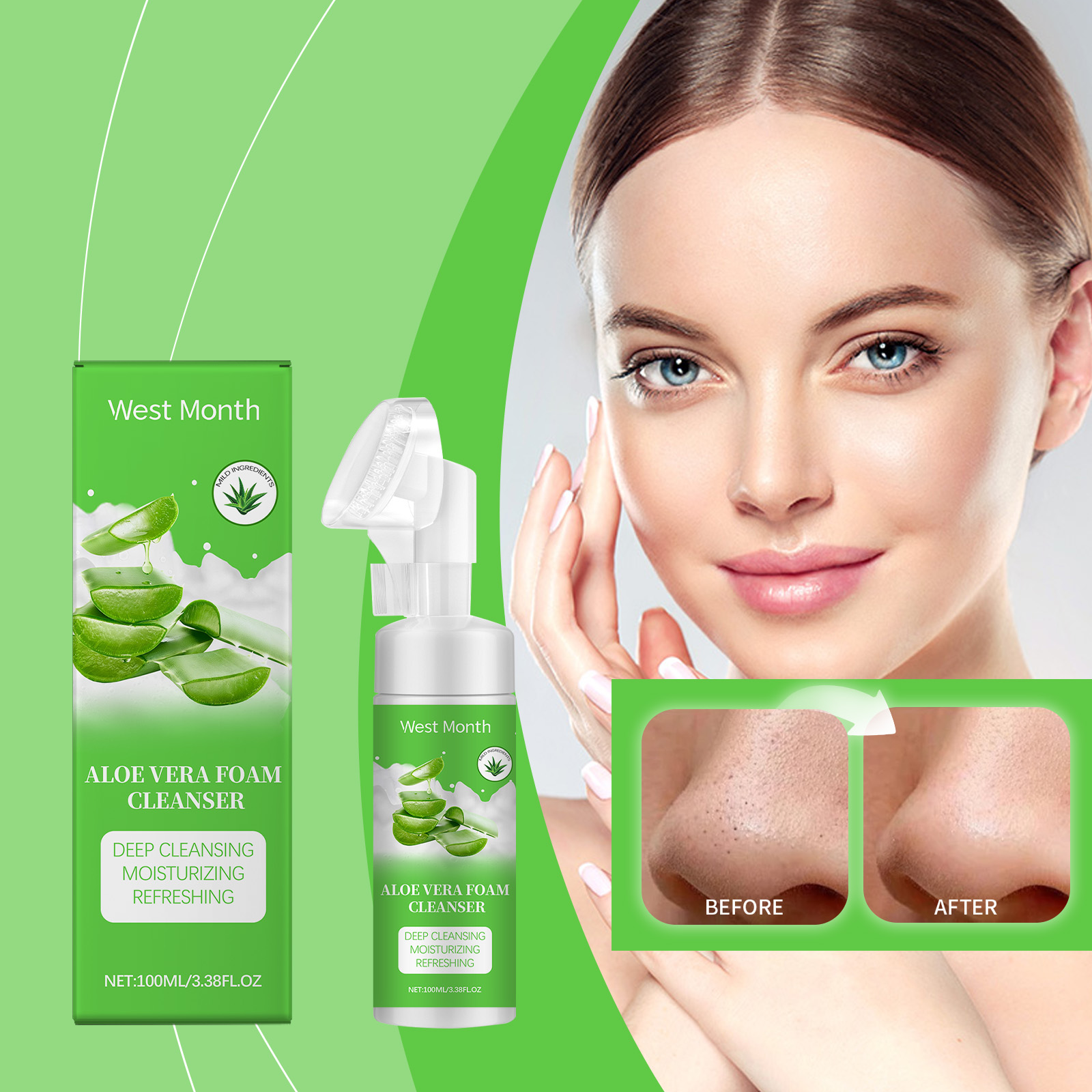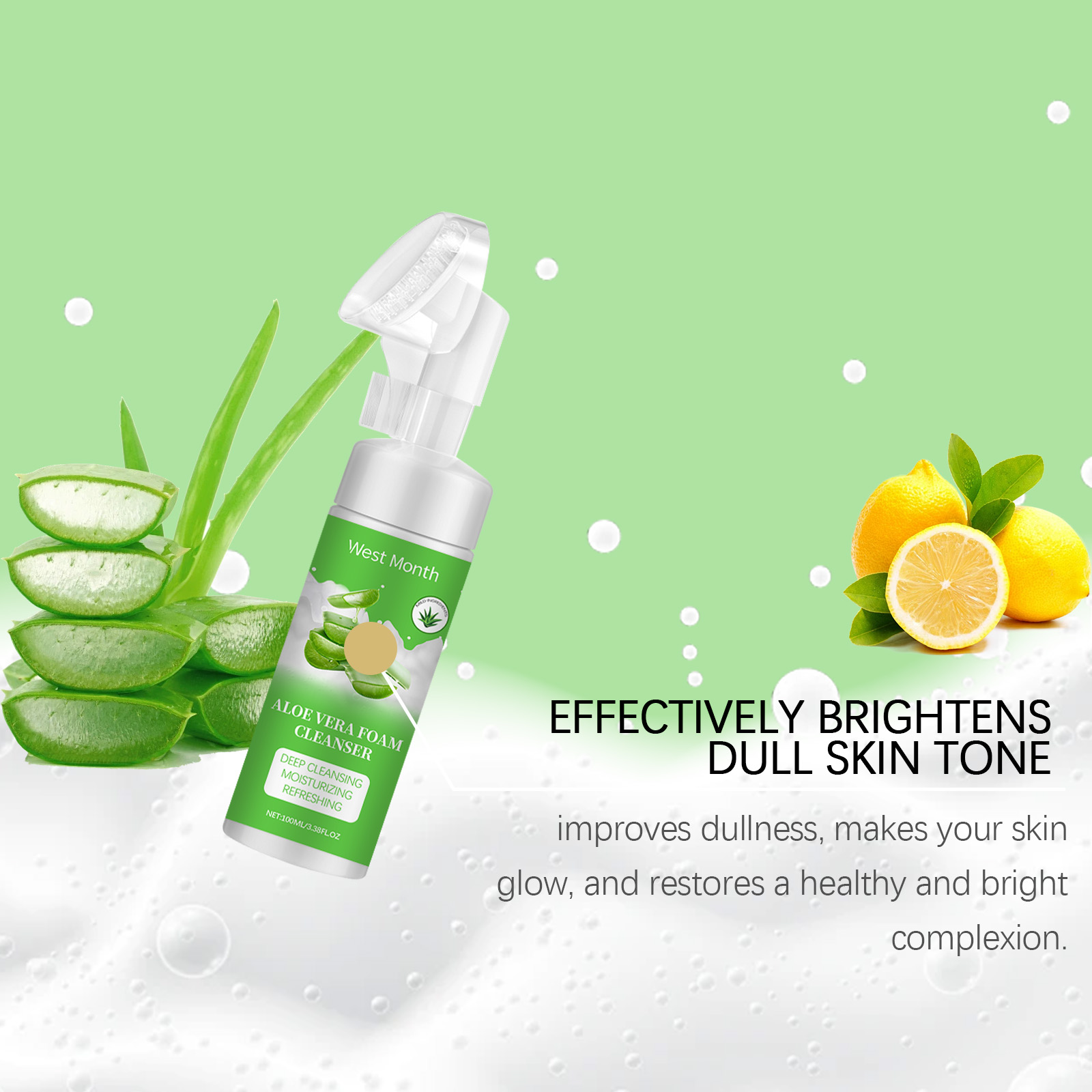 Our aloe Vera foam cleanser contains glycerin, aloe vera leaf extract, salicylic acid. It can get dirt deep into pores, remove pimples and blackheads, and keep skin clean and bright. Its use method is very simple: 1. Moisturize facial skin; 2. Apply appropriate amount of the product evenly on the face and gently massage with a brush for 1-2 minutes. 3. Rinse with water. Effective removal of facial dirt and oil. Gives skin a healthy glow.