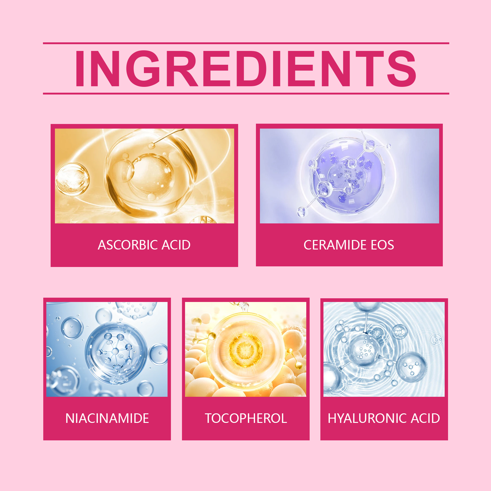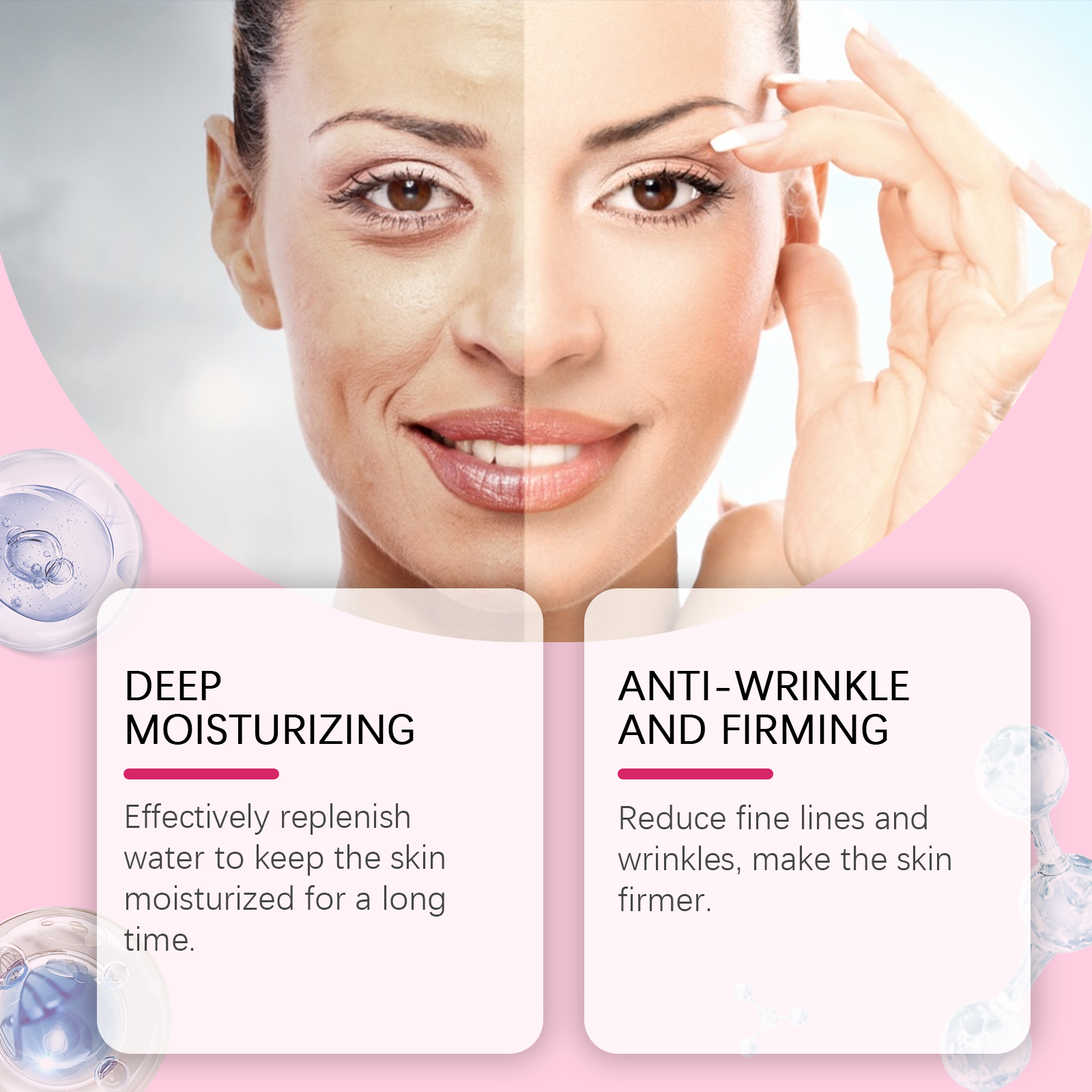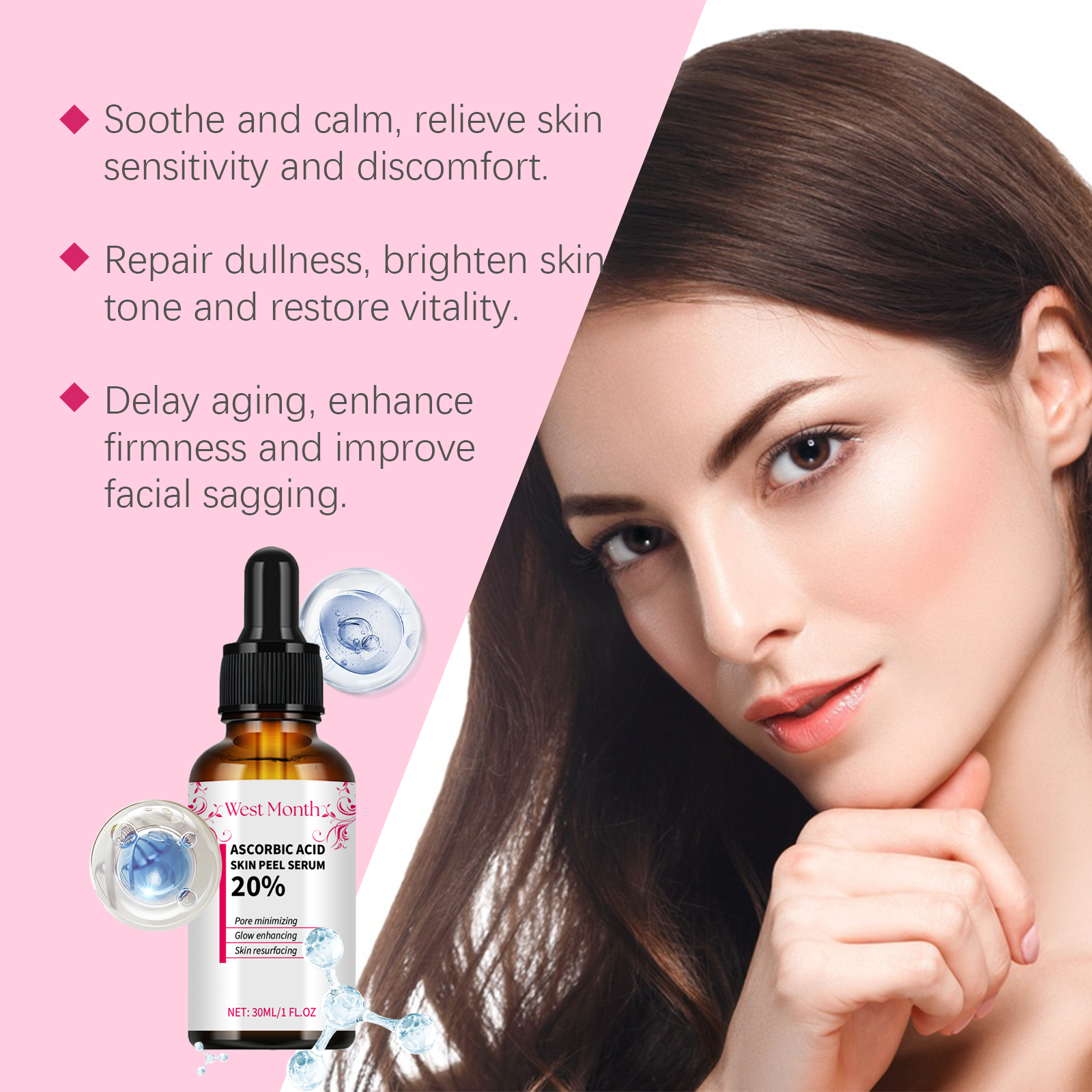 Our moisturizing and brightening essence is carefully formulated with vitamin E and ceramide EOS. Designed specifically to reduce fine lines and wrinkles and make the skin tighter. The usage method is extremely convenient: After cleansing the face, apply an appropriate amount of this product evenly to the facial skin and gently massage in circular motions until fully absorbed. And it can effectively replenish moisture, keeping the skin hydrated for a long time.
