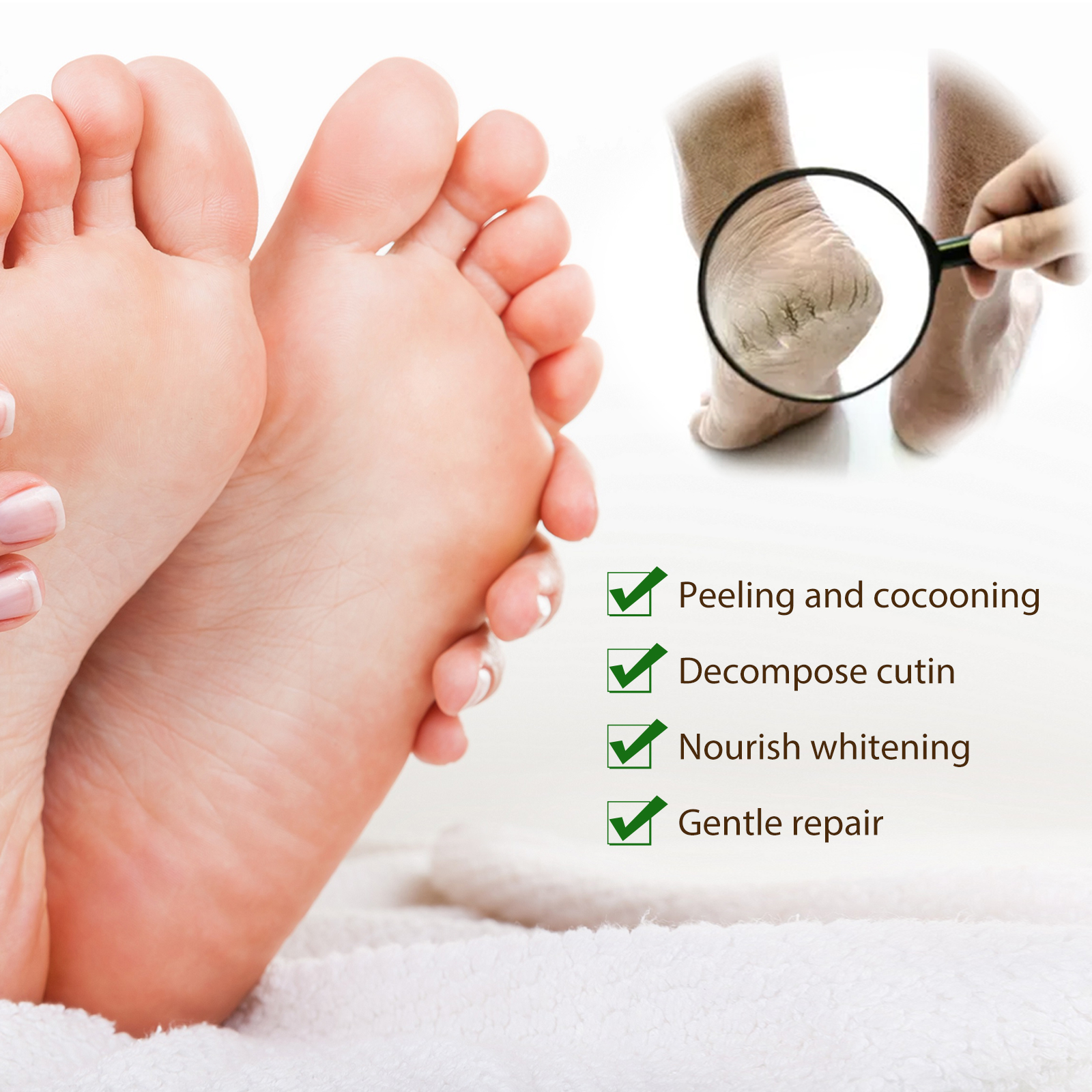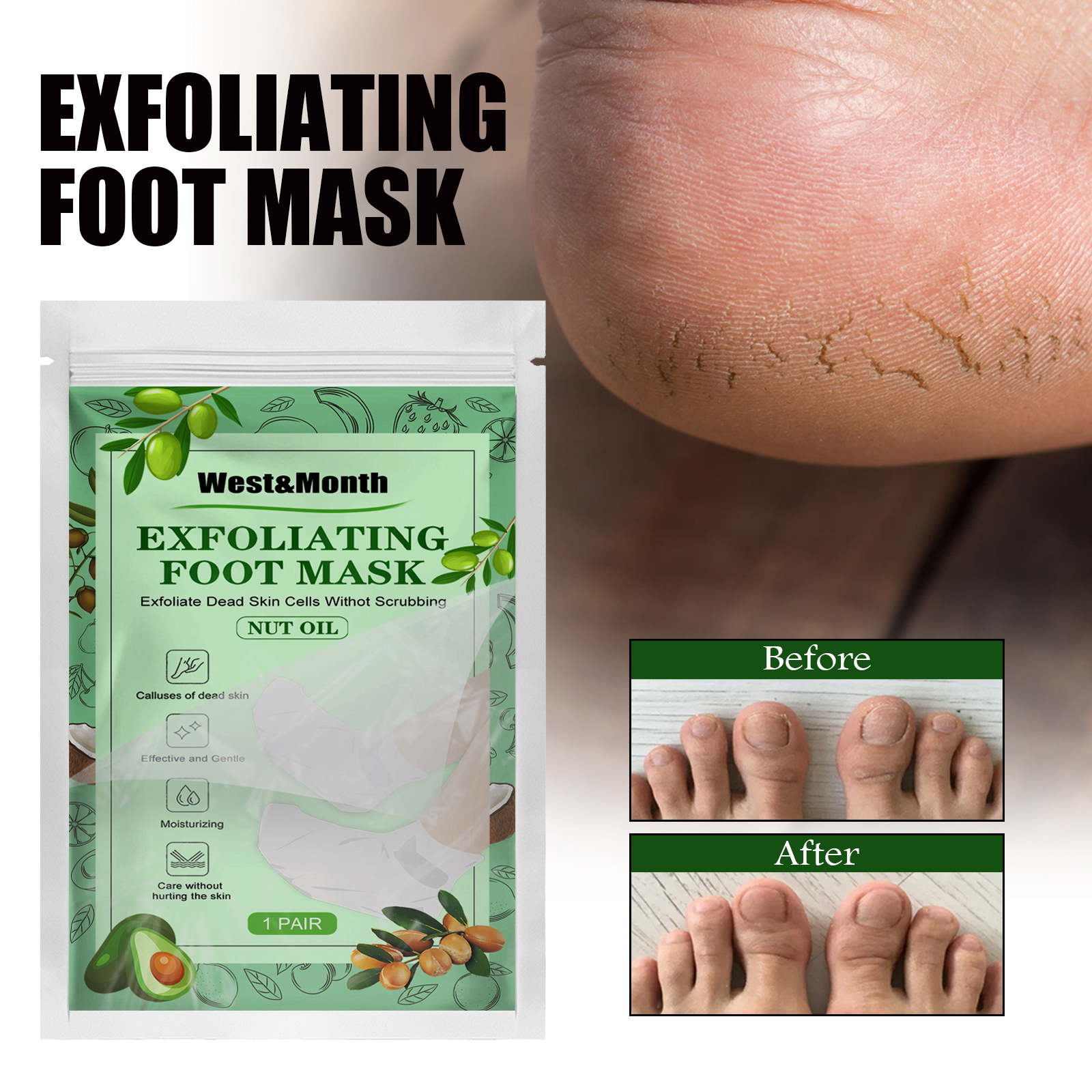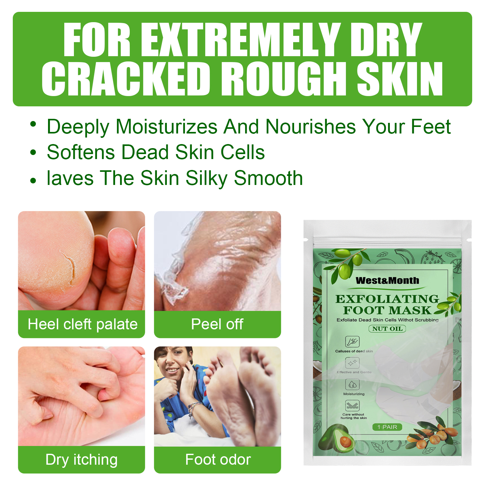 Our argan oil foot mask contains avocado oil, argan oil, Jojoba oil. It can peel and cocoon, exfoliate, nourish and whiten, gently repair, deeply moisturize and nourish your feet, soften dead skin cells and make skin silky smooth. Its use method is very simple: cut the mask in two steps along the dotted line, put on the mask, fix the seal step, seal tightly, wait for 35-45 minutes, remove and wash with clean water. And can moisturize and repair foot mask.