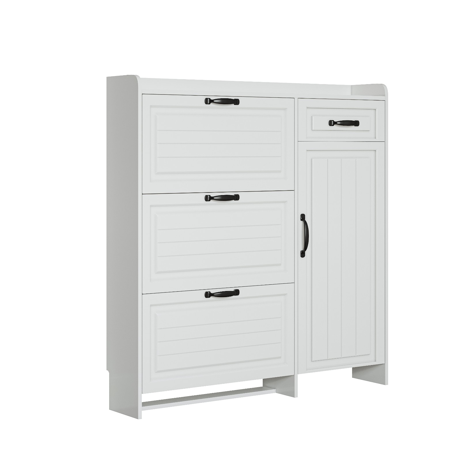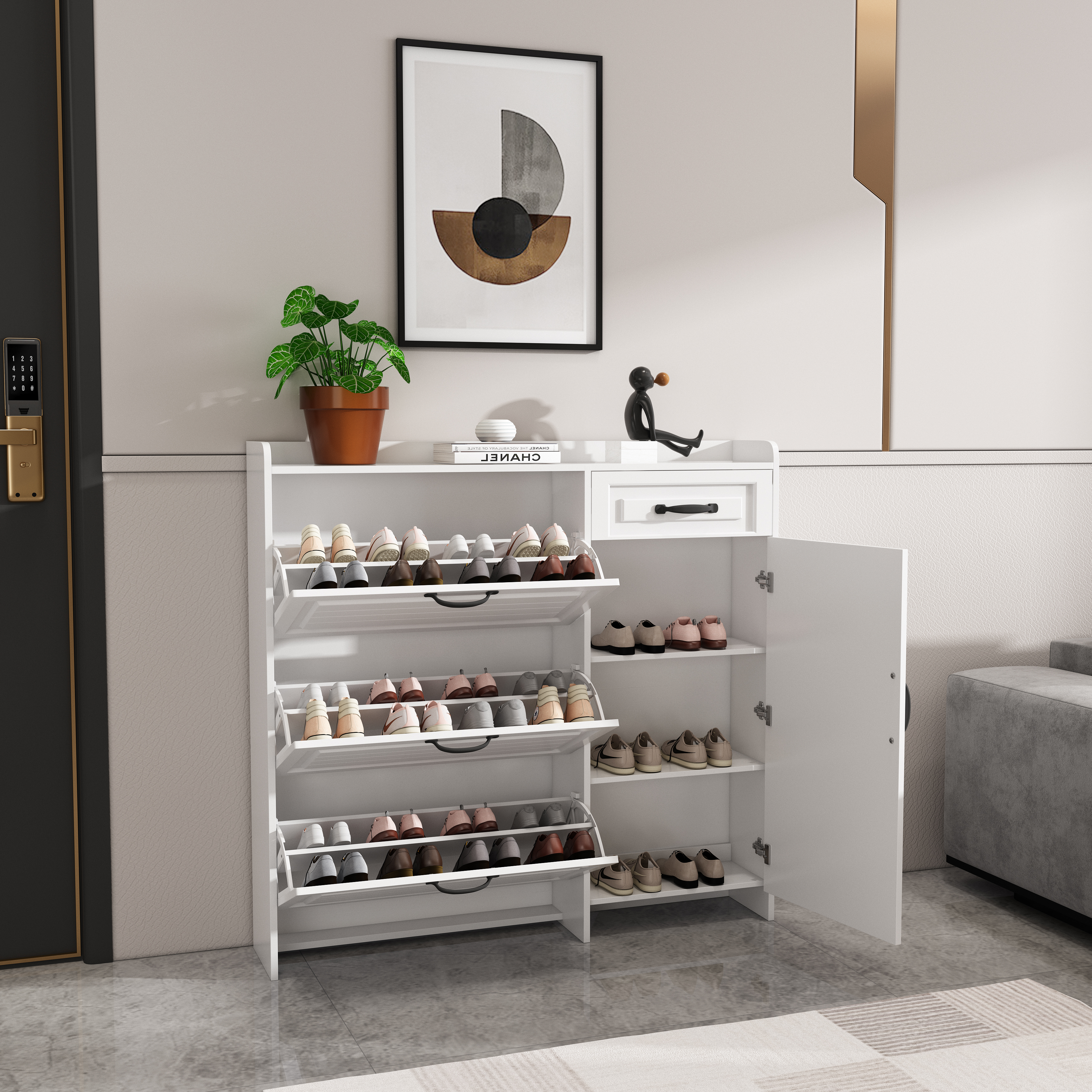 With 3 drop-down flap doors and 2 drawer storage. Perfect for keeping dust out!3 flip-drawers of the shoe cabinet provide ample storage space for your shoes.The shoe cabinet is thin enough to fit even in a narrow hallway.Material: MDF in white finish.Item comes in a flat pack and requires self-assembly. Detailed instructions supplied.