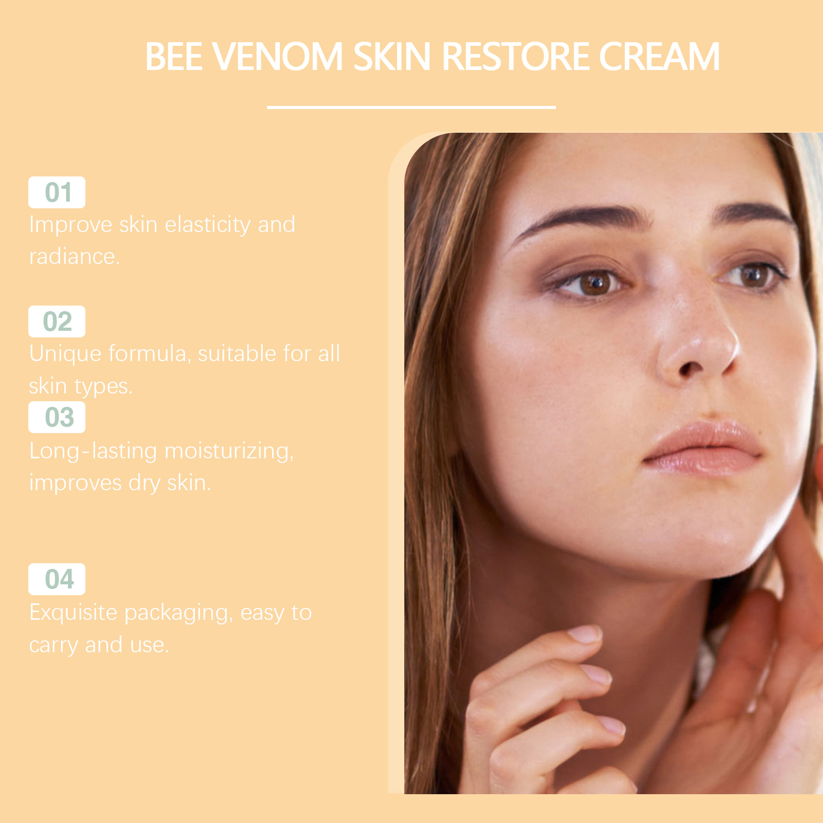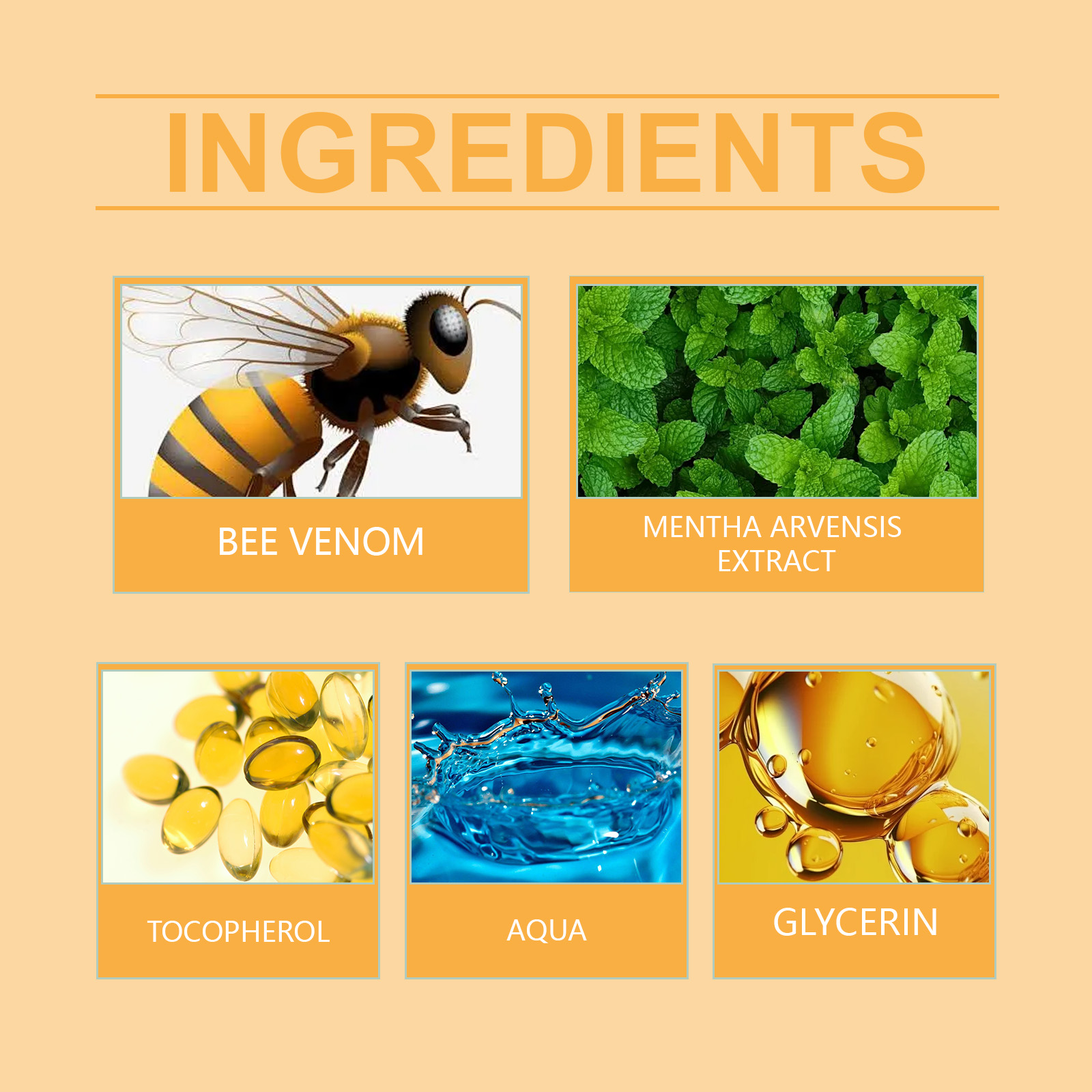 Our bee venom repair cream contains peppermint extract, tocopherol (vitamin E). It can relieve itching and discomfort on the skin, bringing a soothing effect. Its application method is very simple: clean the skin, keep the skin dry, apply appropriate amount of this product evenly on the face and body skin, gently massage until absorbed. And can help speed up the repair process of damaged skin.