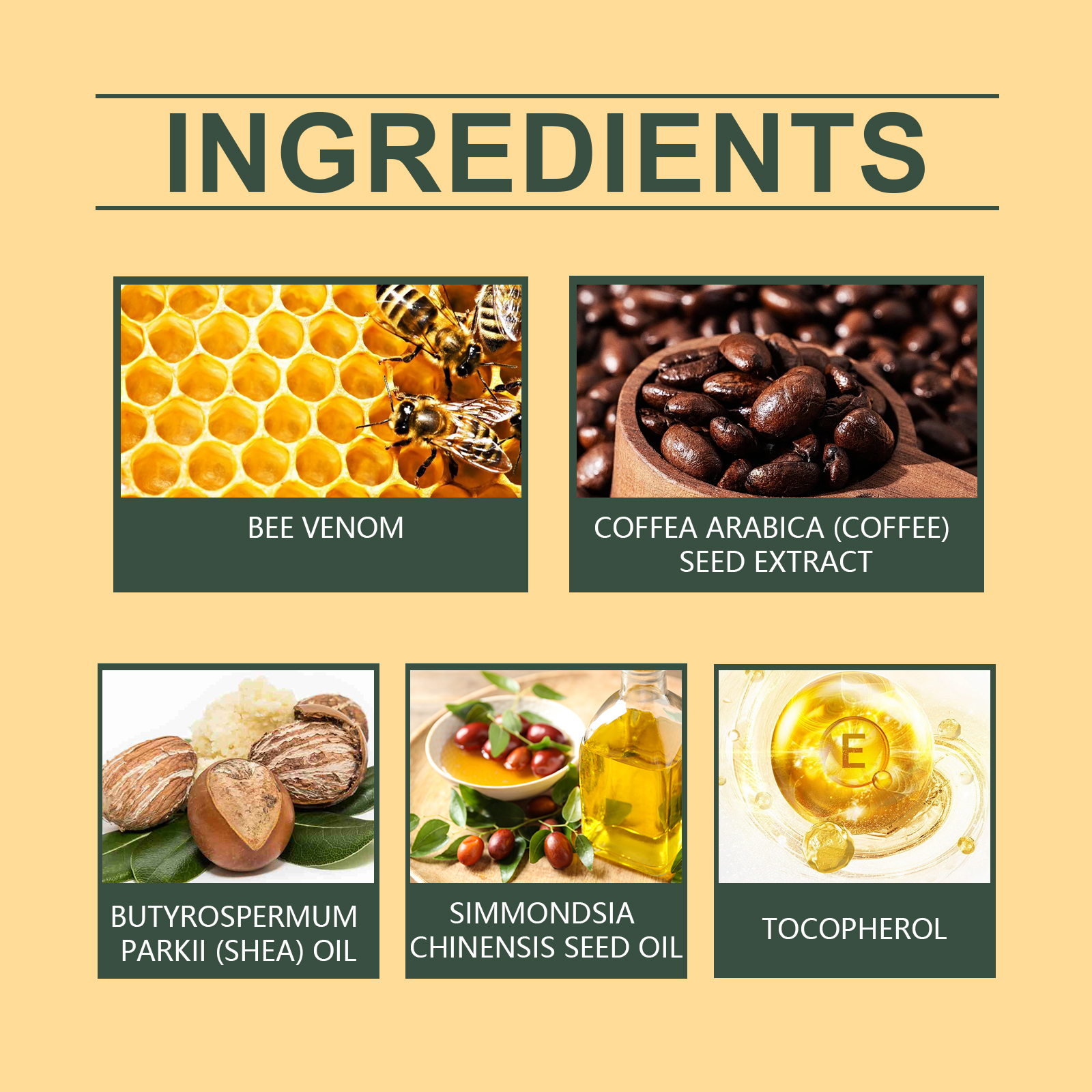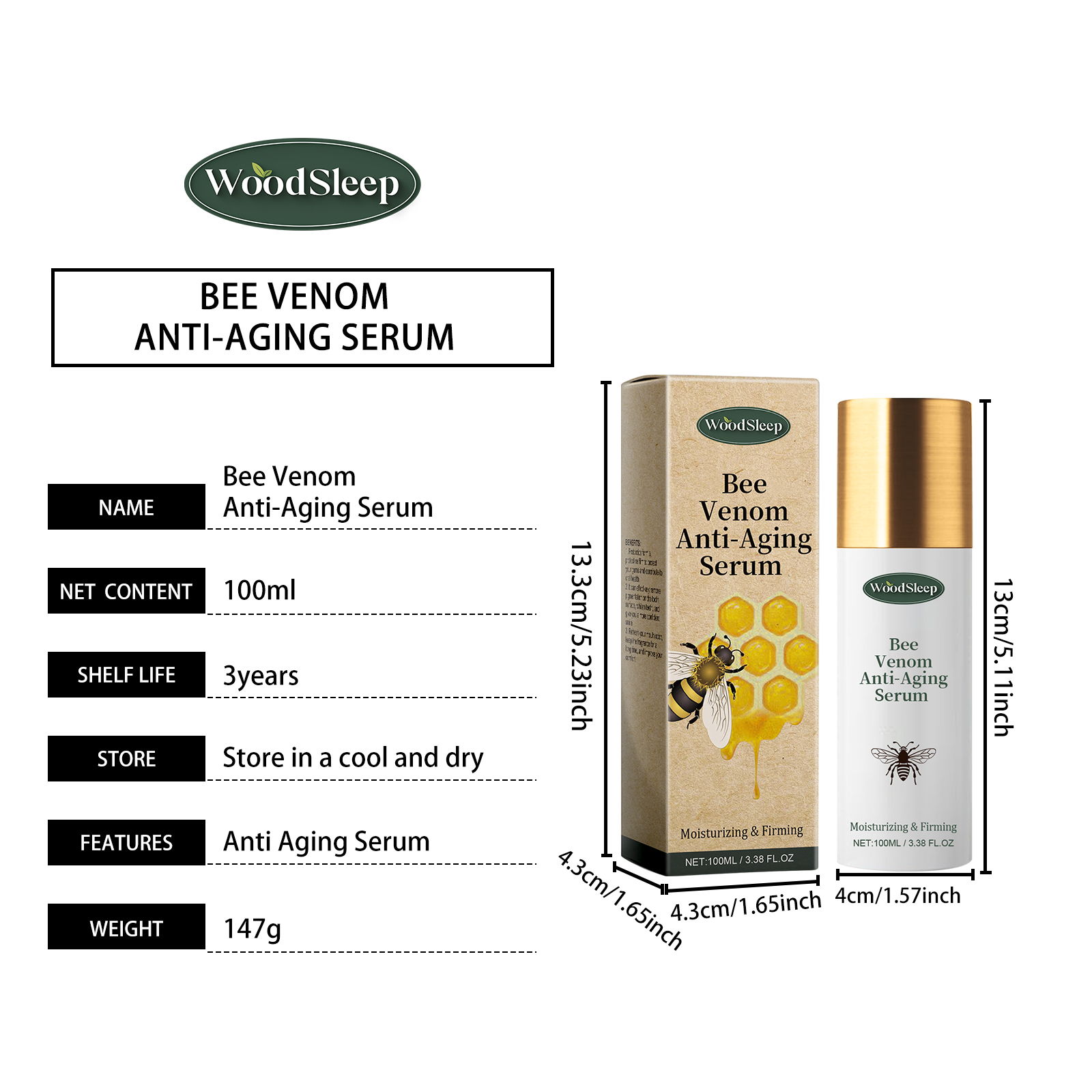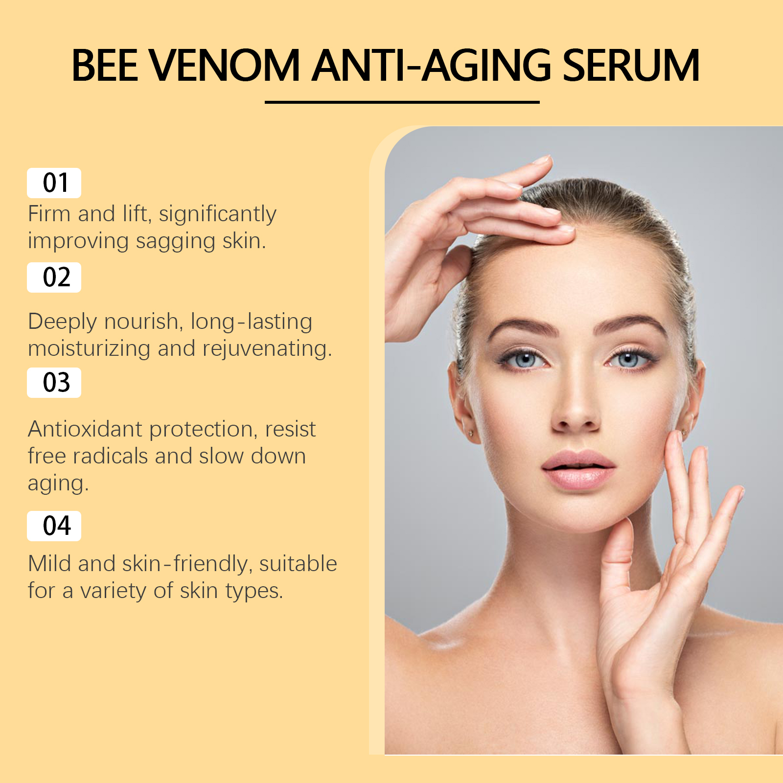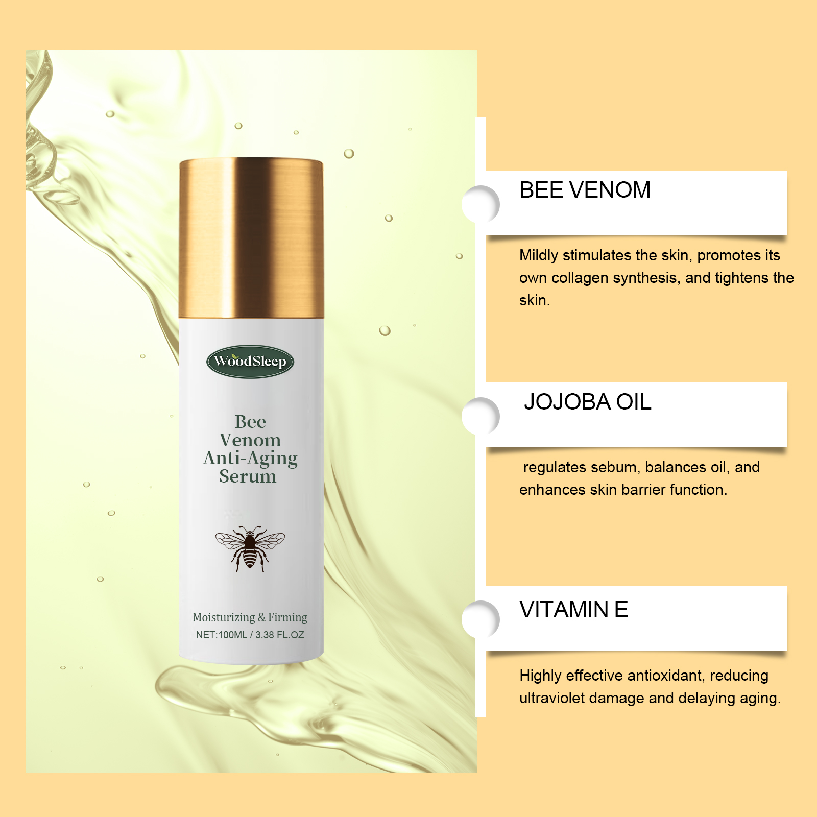 Our bee venom serum contains vitamin E and coffee extract. It can regulate oil secretion, soften the skin, and promote nutrient absorption. The way to use it is very simple: clean and dry your face, apply an appropriate amount of moisturizing water evenly on your face, and gently massage until absorbed. It can also promote collagen production and improve skin firmness.