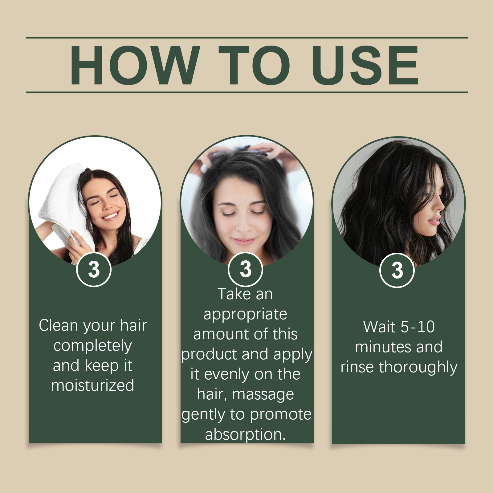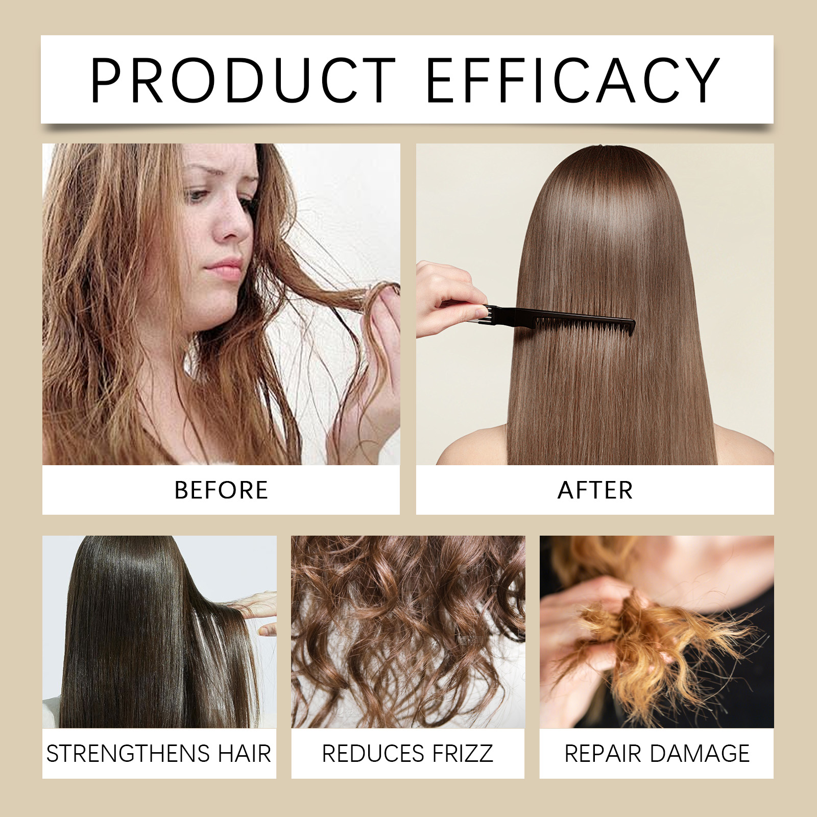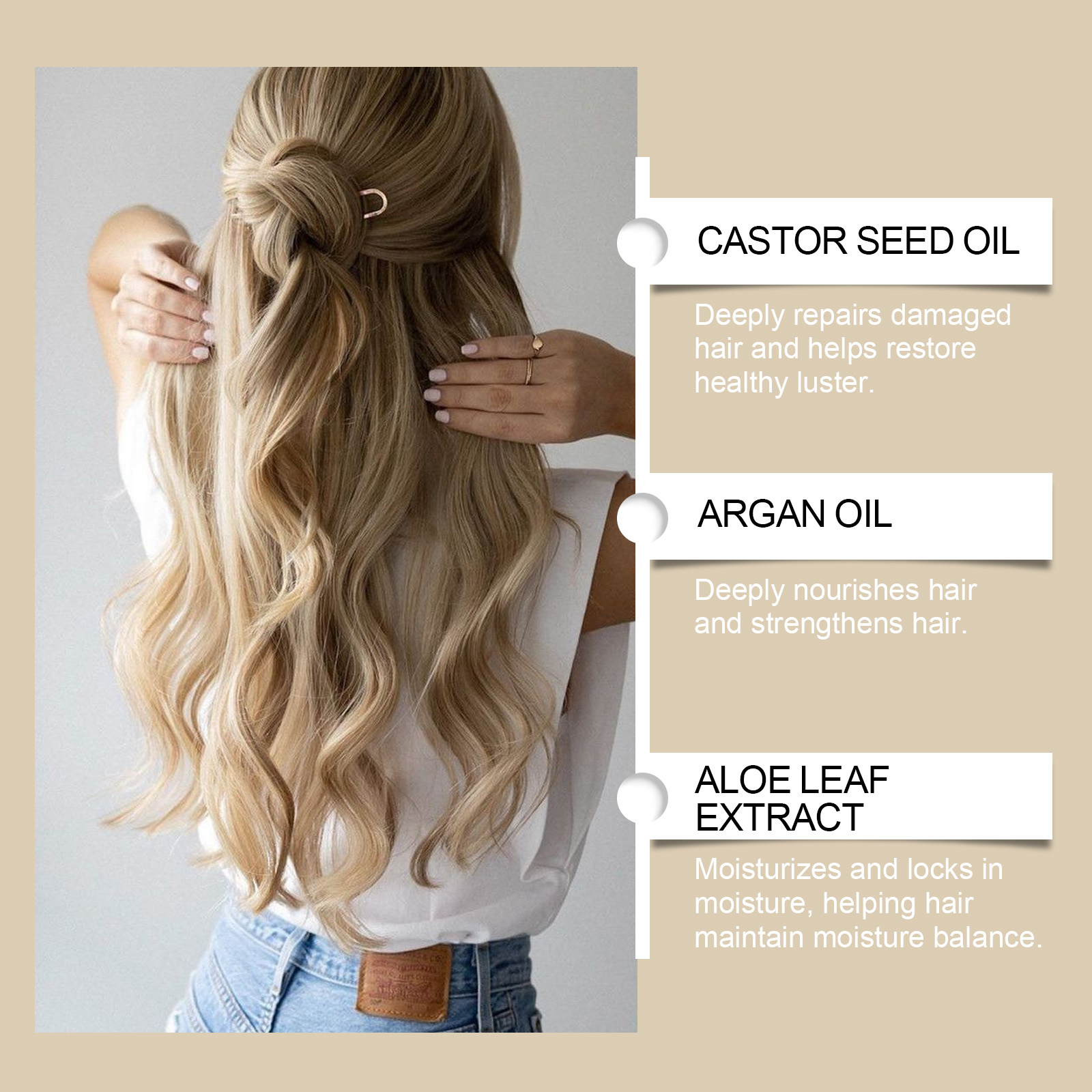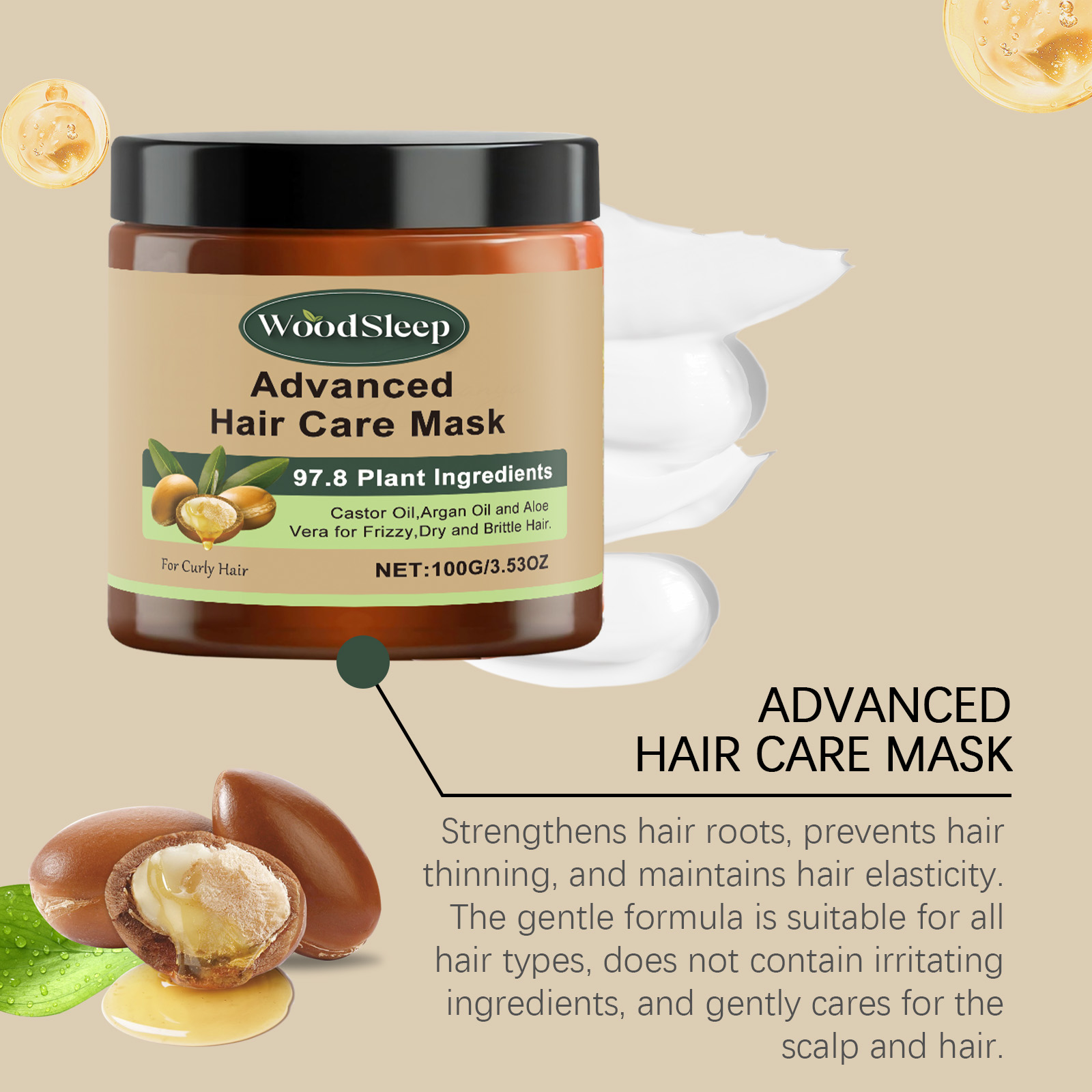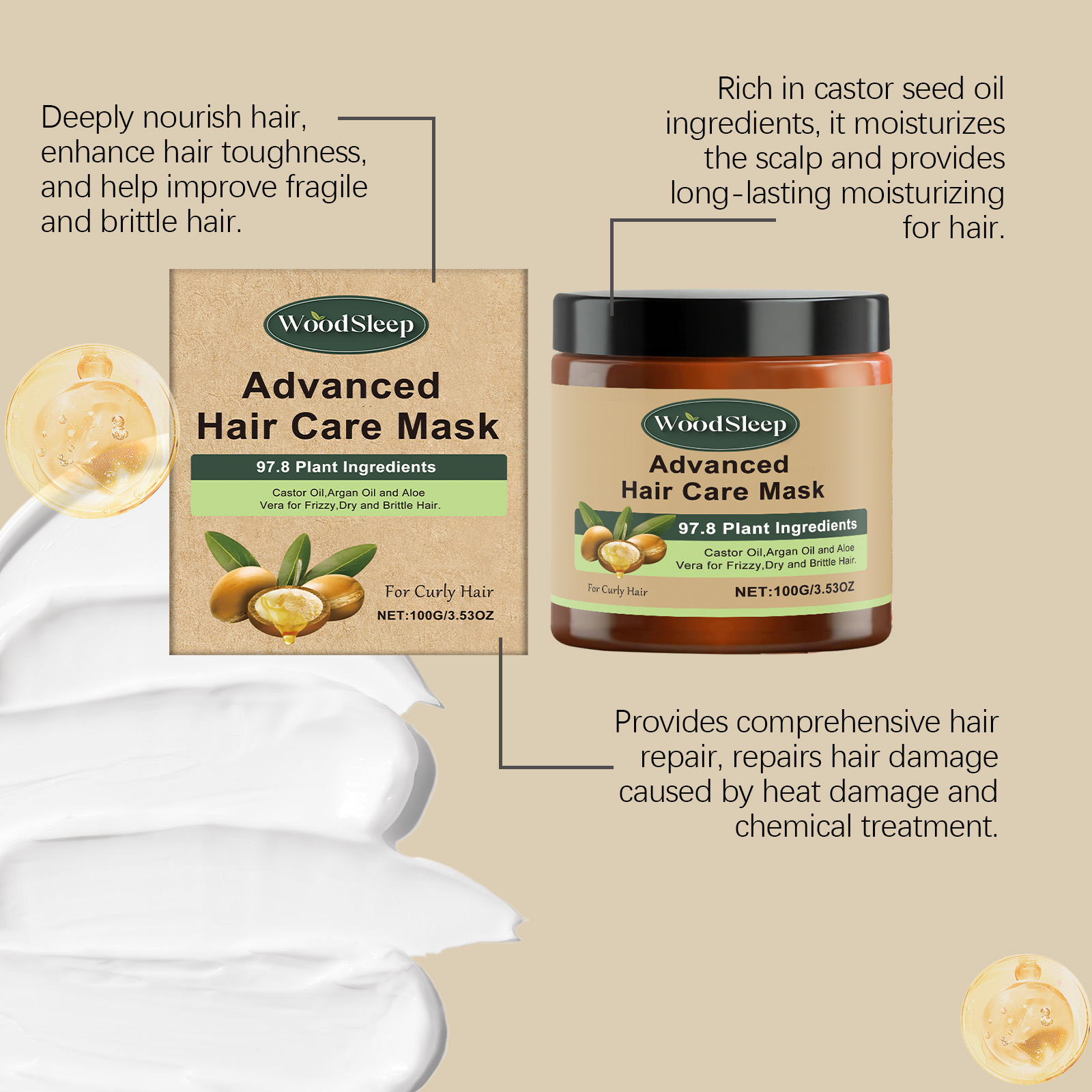 Our moisturizing hair mask contains castor seed oil, argan oil, aloe vera leaf extract. It can deeply repair damaged hair, help restore a healthy glow and reduce breaks and split ends. The way to use it is simple: 1. Thoroughly clean your hair and keep it moist; 2. Apply appropriate amount of the product evenly on the hair, gently massage to promote; 3. Wait 5-10 minutes, rinse thoroughly absorbed. Smooth frizz effectively. Makes hair smoother and softer, easy to handle, and reduces static electricity.