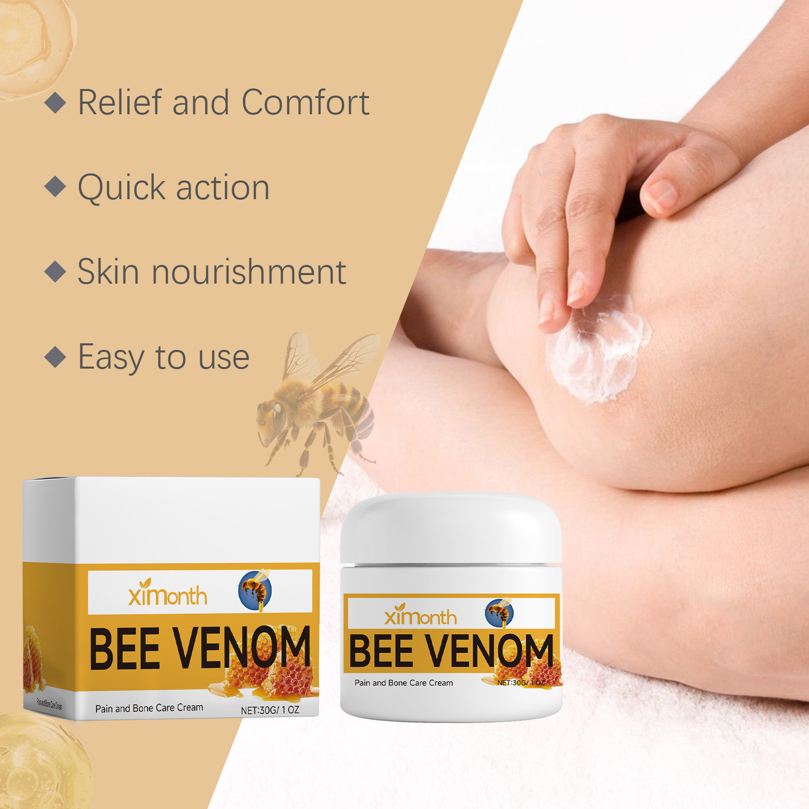 Our Peak Venom Joint Relief cream contains bee venom and aloe vera leaf extract. It can be quickly absorbed, quickly relieve discomfort and rejuvenate. Its application method is very simple: clean and dry skin, apply appropriate amount of product evenly on the skin, gently massage until absorbed. And the texture is fresh, not greasy, and the experience feels refreshing and comfortable.