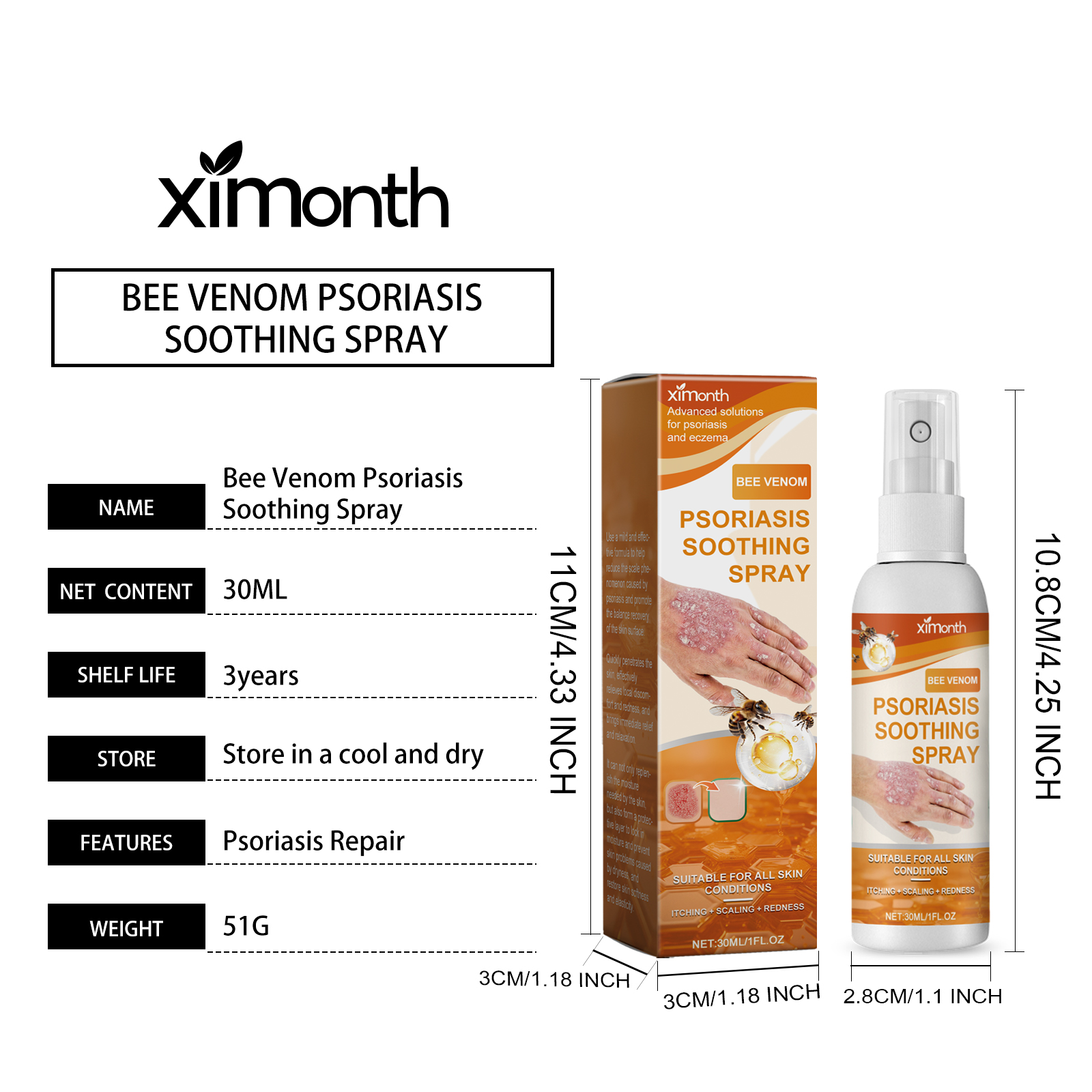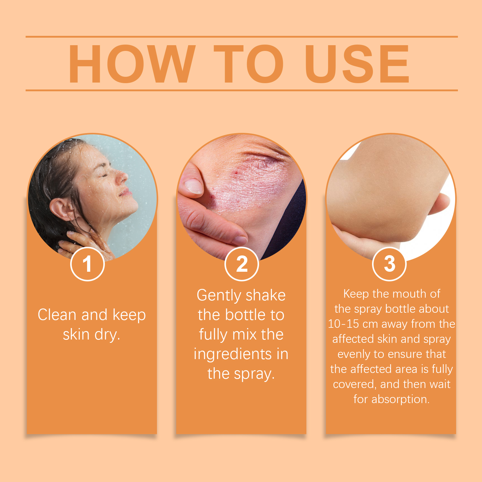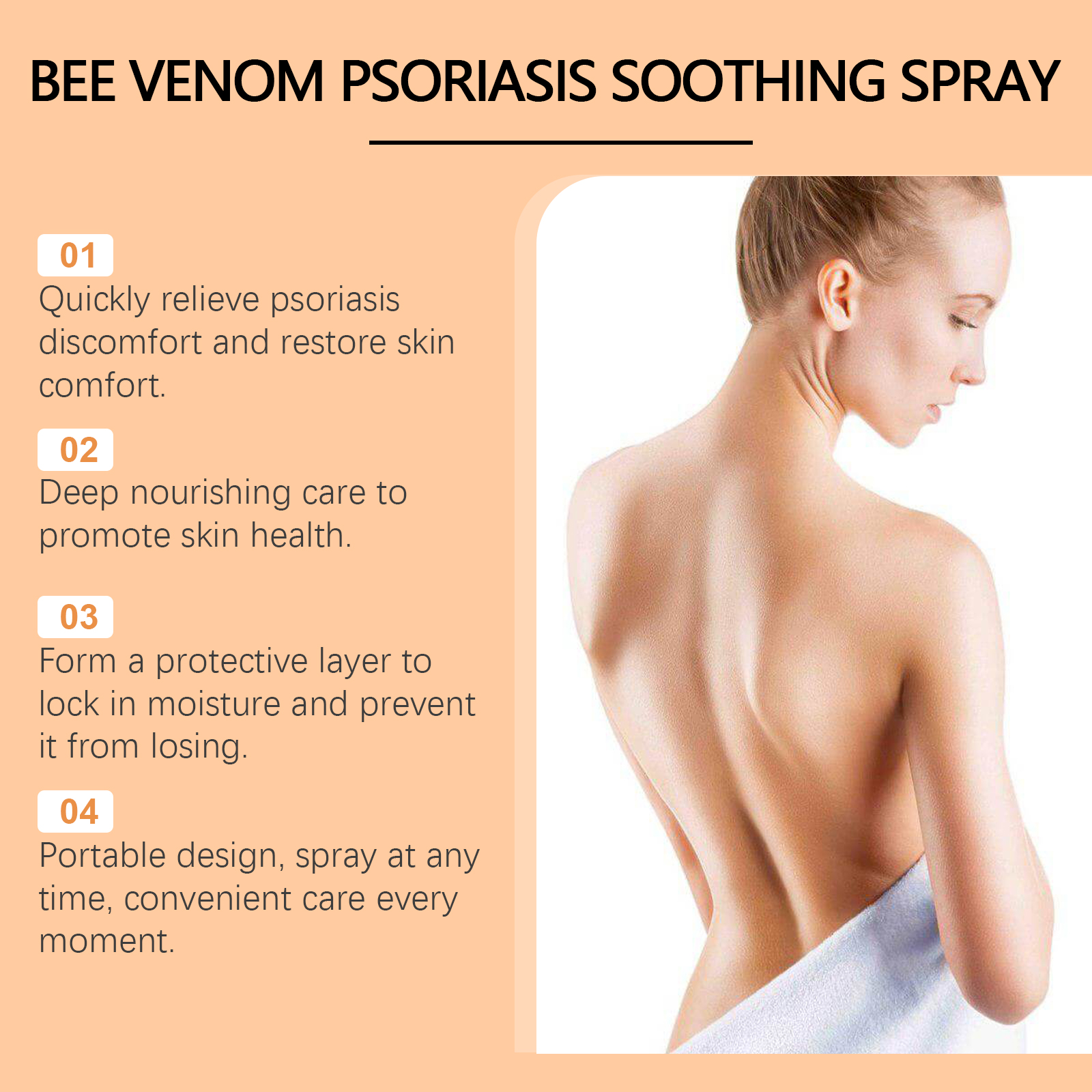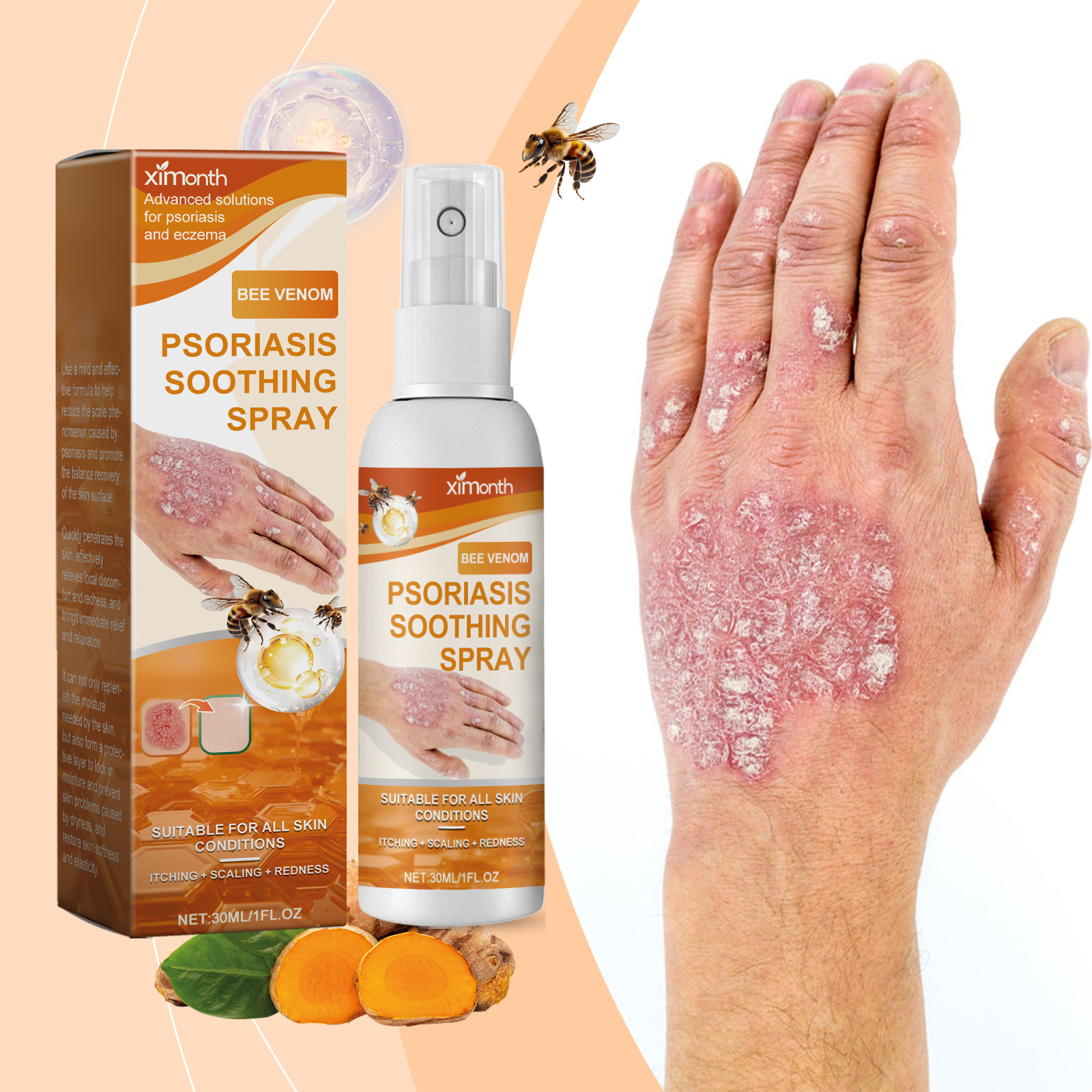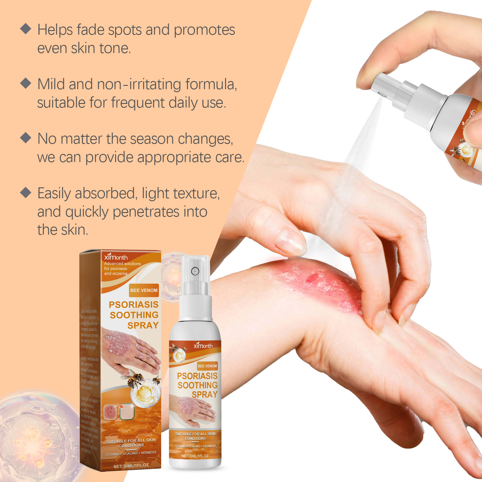 Our Moss care spray contains bee venom, aloe vera extract and turmeric root extract. It can quickly relieve psoriasis and improve daily comfort. Form a moisturizing barrier to keep skin hydrated. Its application method is simple: 1. Clean and keep the skin dry. 2. Shake the bottle gently to thoroughly mix the ingredients in the spray. 3. Keep the mouth of the spray bottle about 10-15 cm away from the affected skin, spray evenly, make sure the affected area is completely covered, and wait for absorption. Moss Care Spray helps the skin"s natural recovery process and improves its defenses. Enhances shine, improves skin and gives off a natural glow.