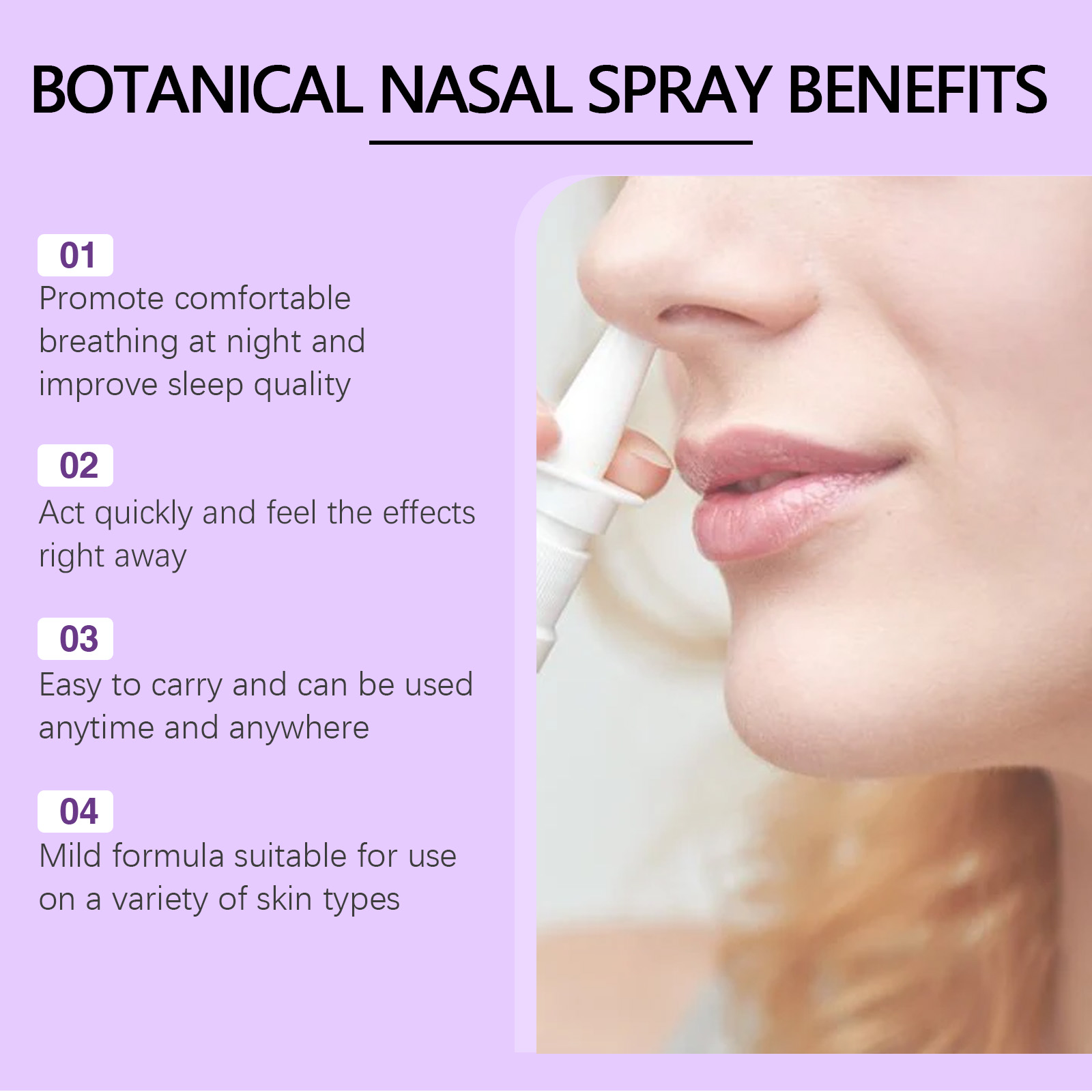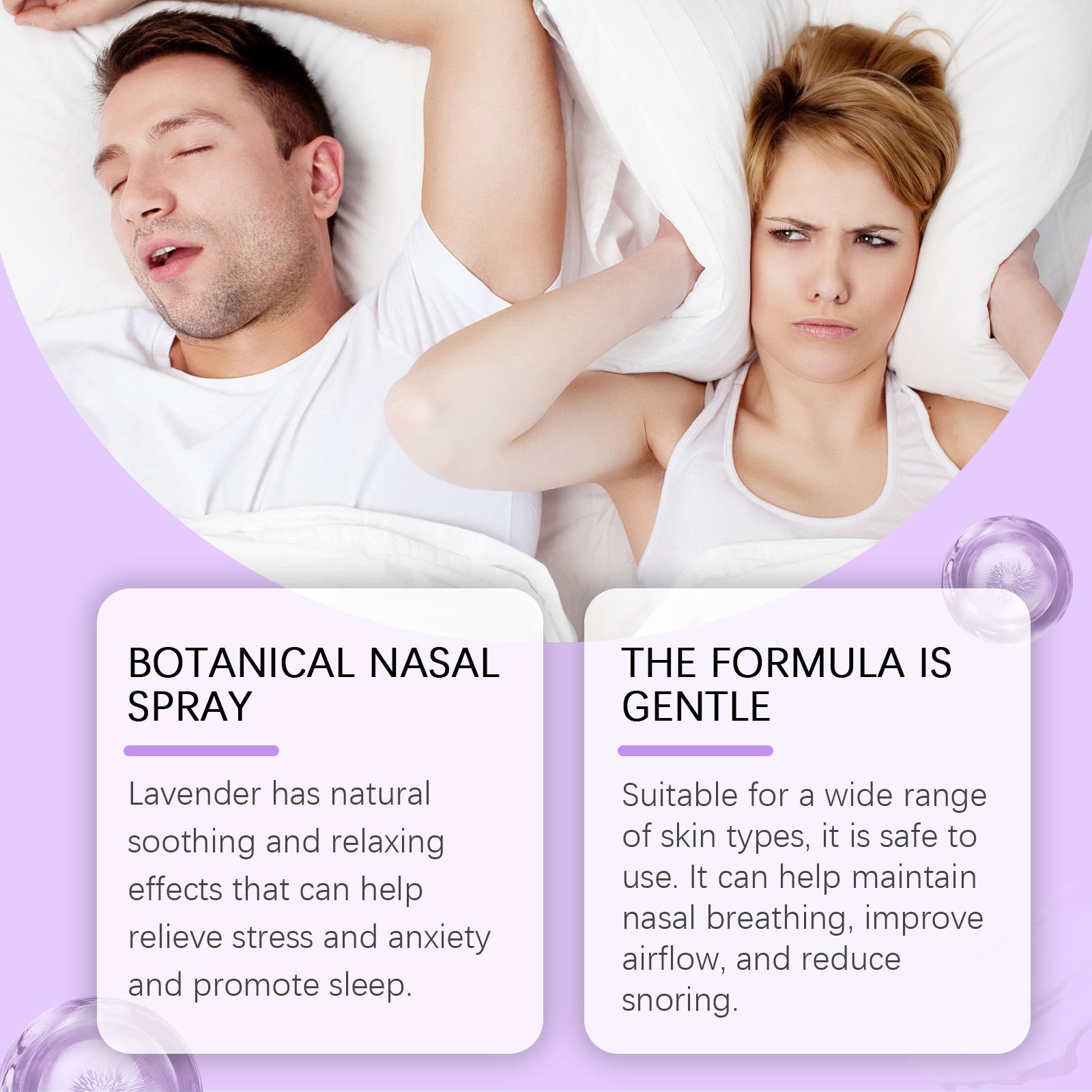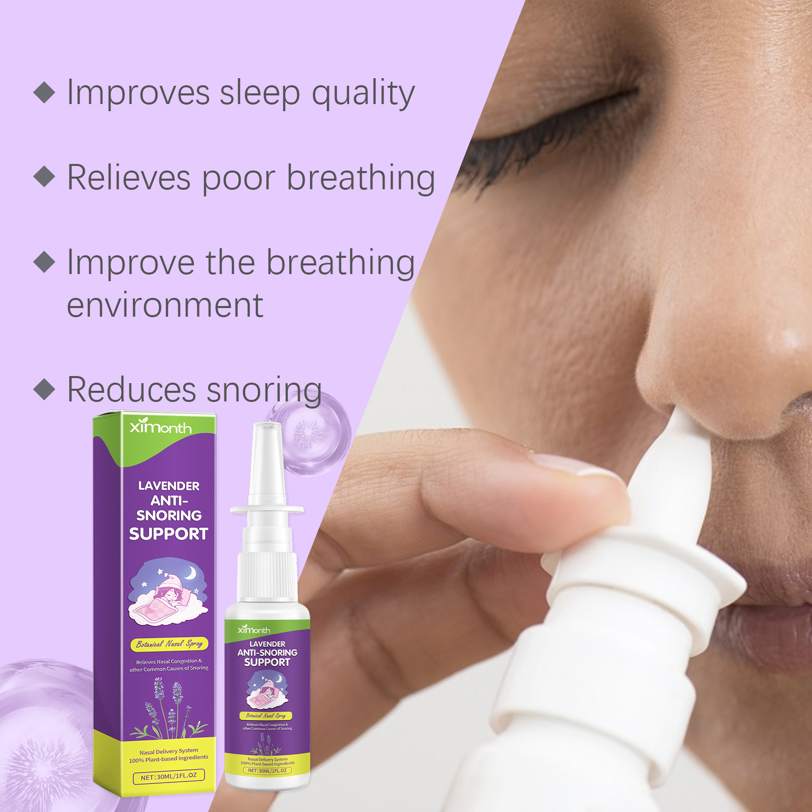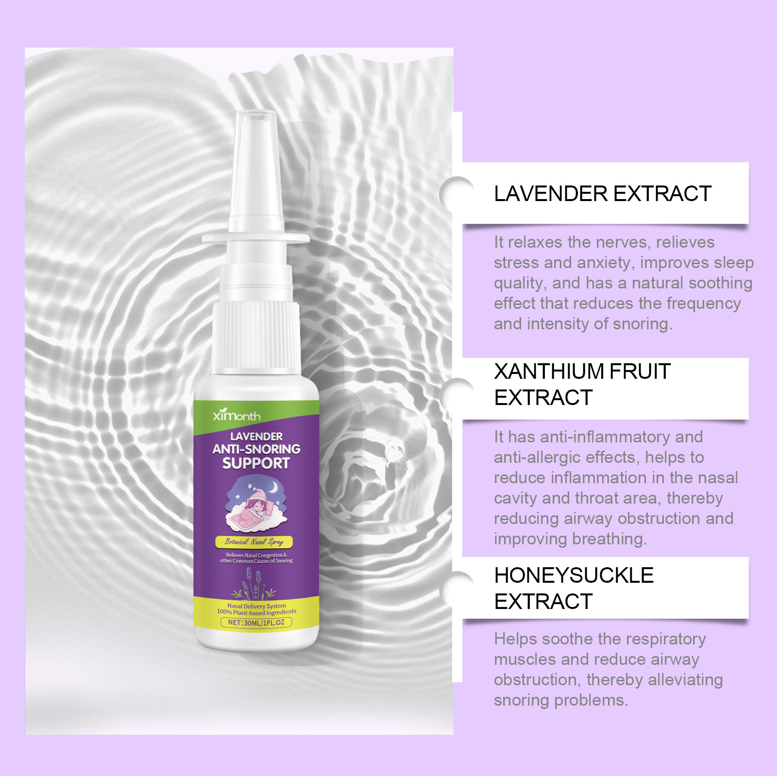 Our snoring spray contains lavender extract, Xanthium extract, propolis extract. It relaxes the nerves, relieves stress and anxiety, improves sleep quality, and has a natural soothing effect that can reduce the frequency and intensity of snoring. It has anti-inflammatory and anti-allergy effects, helps reduce inflammation in the nasal and throat areas, reduces airway obstruction, and improves breathing. Helps soothe respiratory muscles and reduce airway obstruction, thus reducing snoring problems. Its application method is very simple: 1. Before using this product, please shake the bottle well and tilt the head back. 2. Inhale the solution into your nostrils once or twice before sleeping to make sure you can feel the solution in the back of your throat. 3. For best results, avoid eating or drinking directly after use. Snoring spray can help relieve stress and anxiety and promote sleep; Suitable for many skin types and safe to use. Can help maintain nasal breathing, improve air circulation, and reduce snoring. The scent of lavender in the spray lasts for a while, providing you with a long-lasting relaxing effect and allowing you to enjoy a deeper sleep.